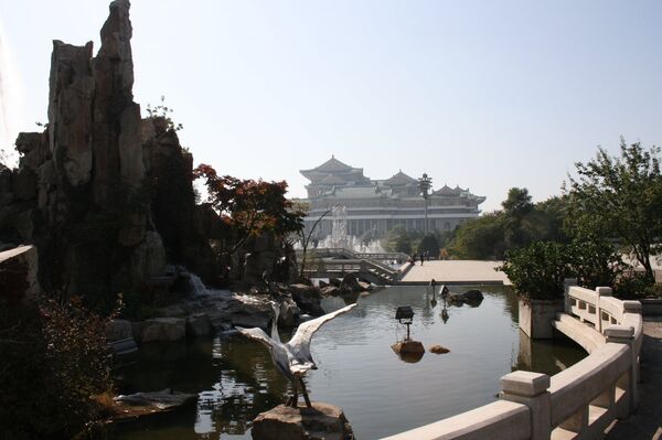 Un parque de Pyongyang con el Palacio de Escolarización del Pueblo en segundo plano