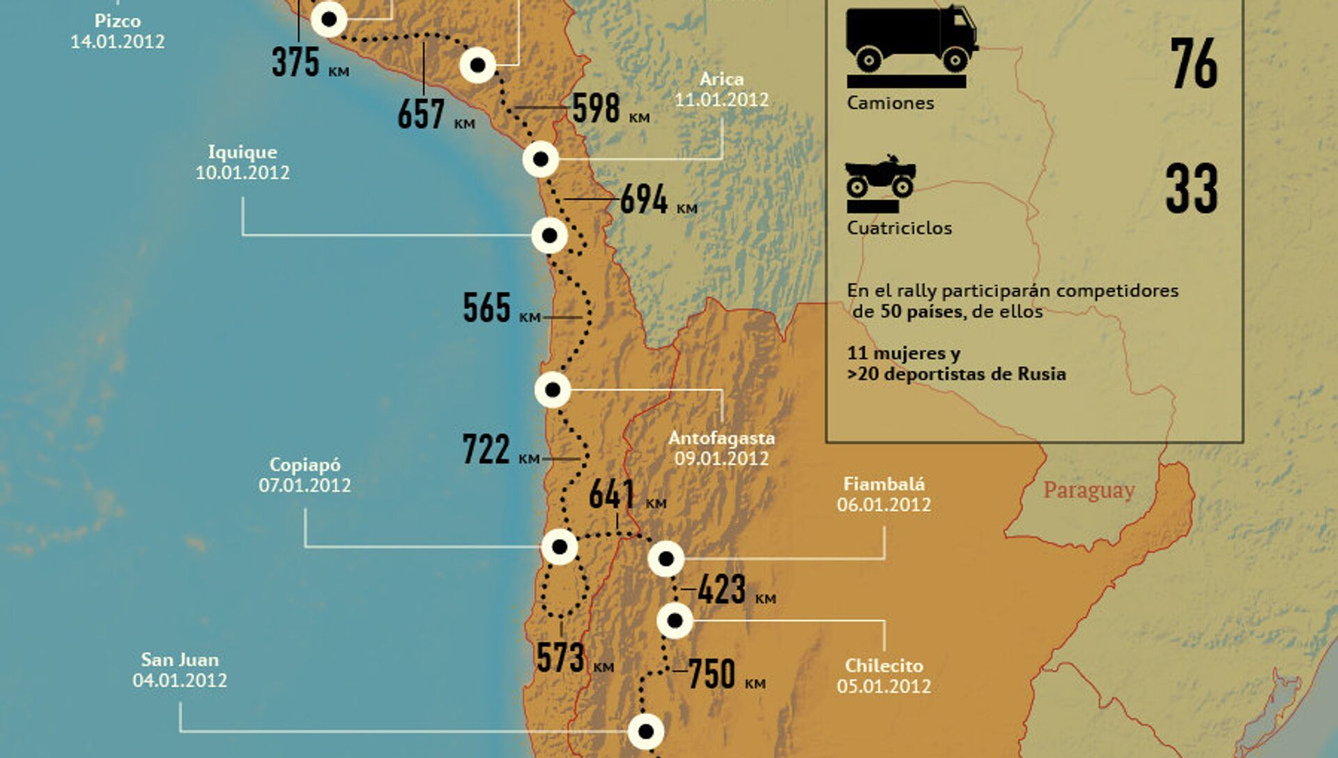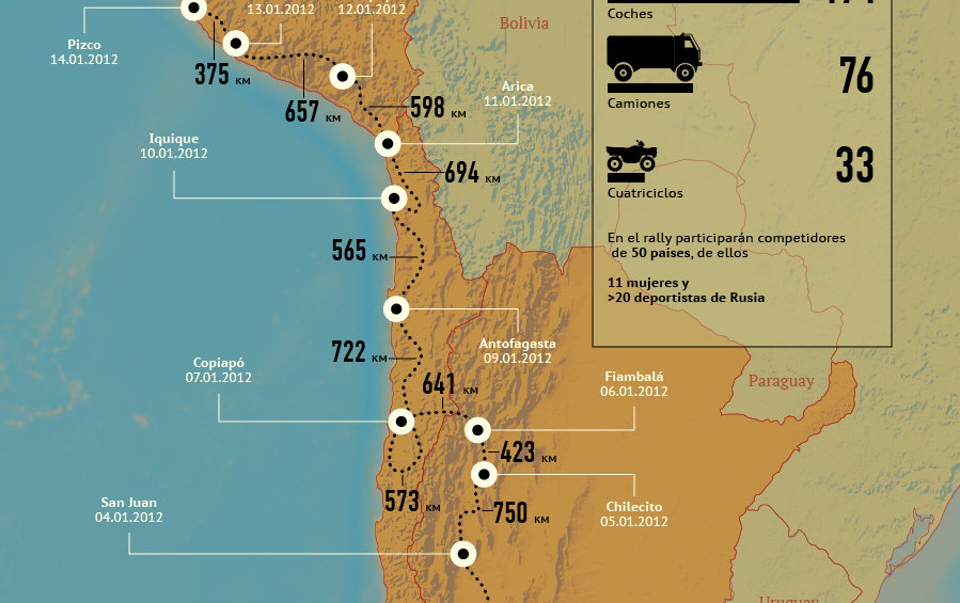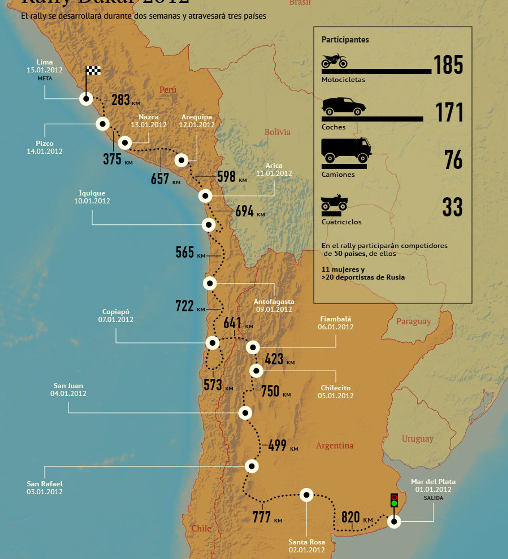 El Rally Dakar 2012 se desarrollará del 1 al 15 de enero en territorios de Argentina, Chile y Perú.