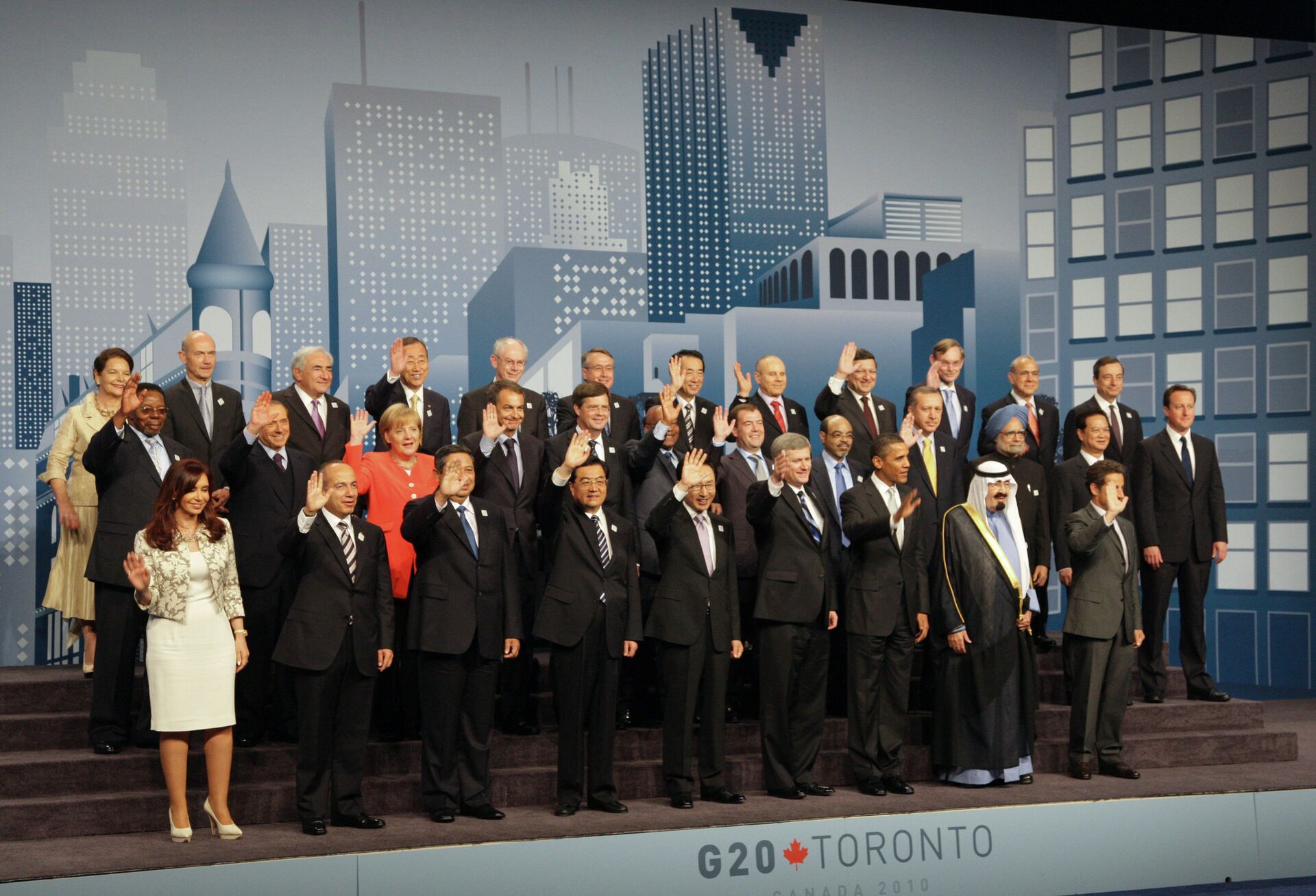 El Grupo de los Veinte está conformado por los países del Grupo de los Ocho (EEUU, Canadá, Japón, Alemania, Reino Unido, Italia, Francia y Rusia) más Arabia Saudí, Argentina, Australia, Brasil, China, Corea del Sur, India, Indonesia, México, Sudáfrica, Turquía y la Unión Europea en calidad de estructura regional.