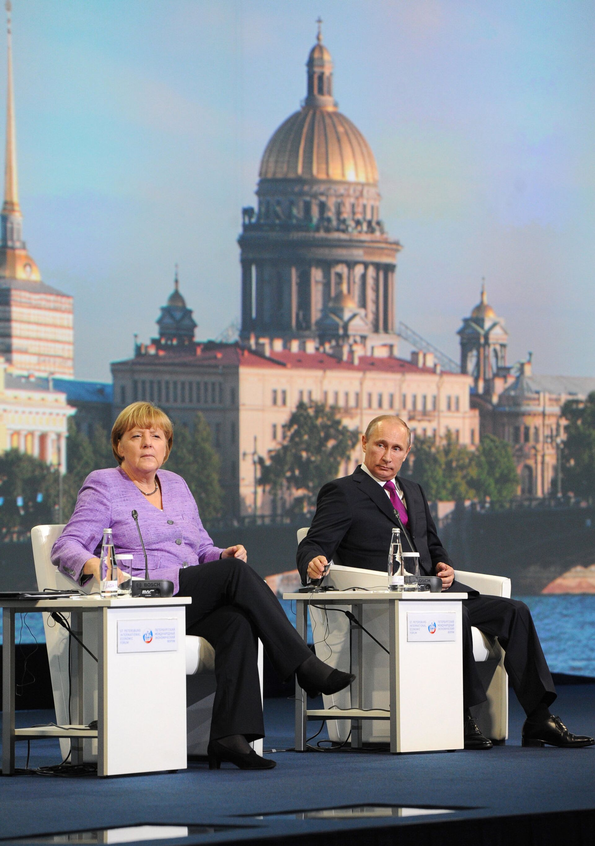 La canciller alemana, Angela Merkel, comentó en el Foro Económico Internacional de San Petersburgo que “el presidente ruso no siempre habla bajo, a veces alza el tono, pero eso no impide nuestra cooperación”.
