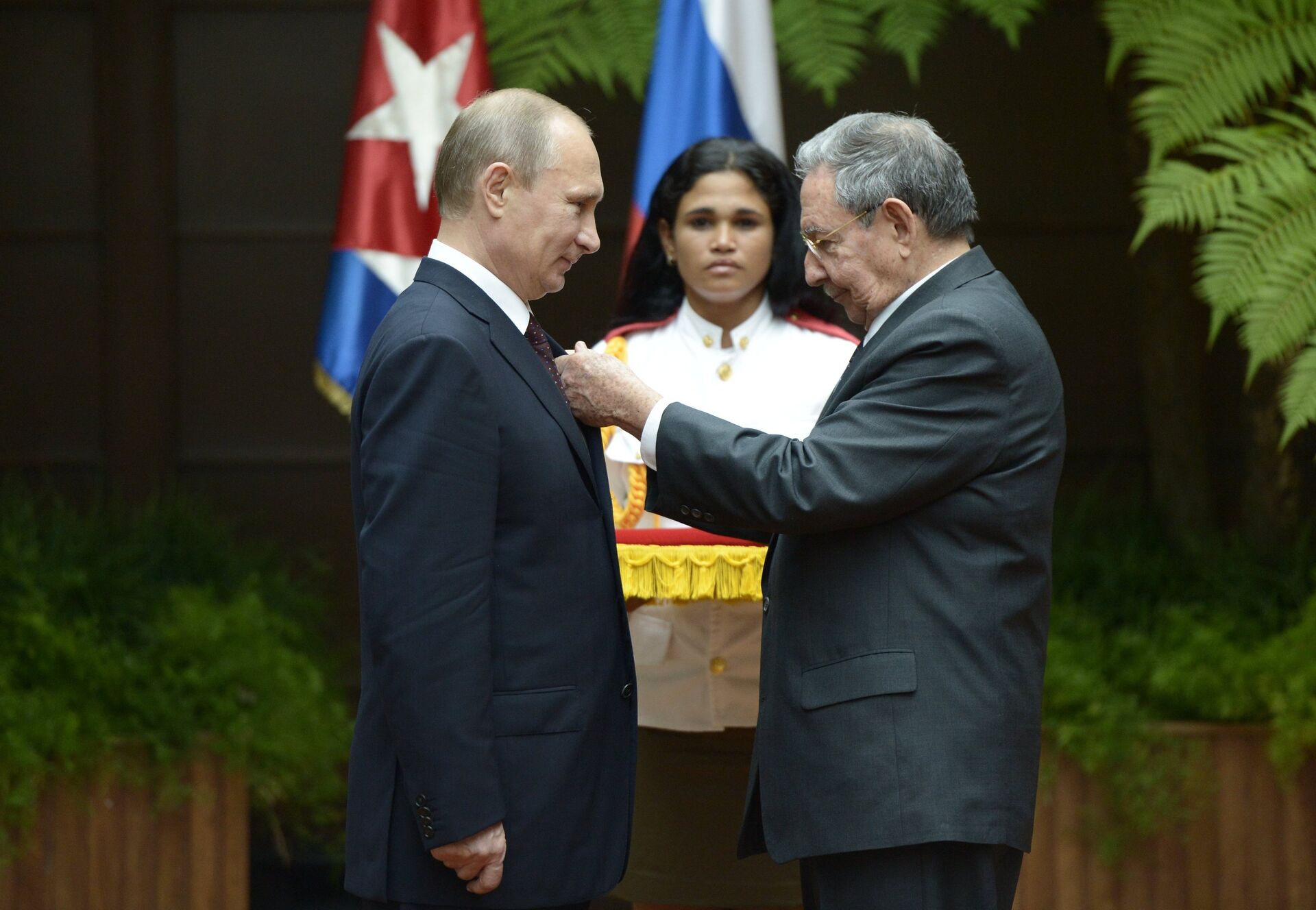 La entrega de la orden tuvo lugar durante una reunión de Putin con el presidente de los Consejos de Estado y de Ministros de Cuba, Raúl Castro, celebrada en el Palacio de la Revolución.