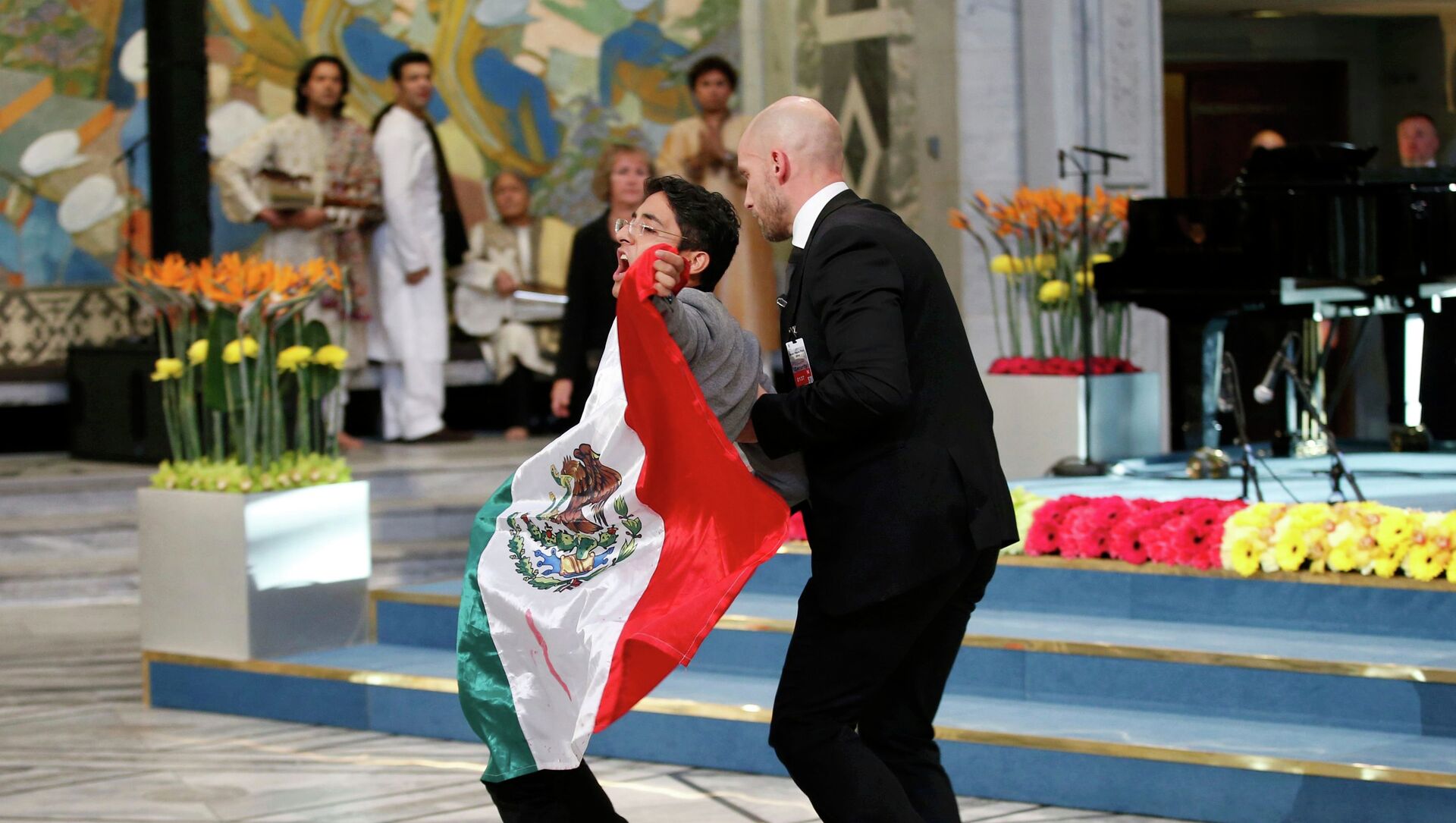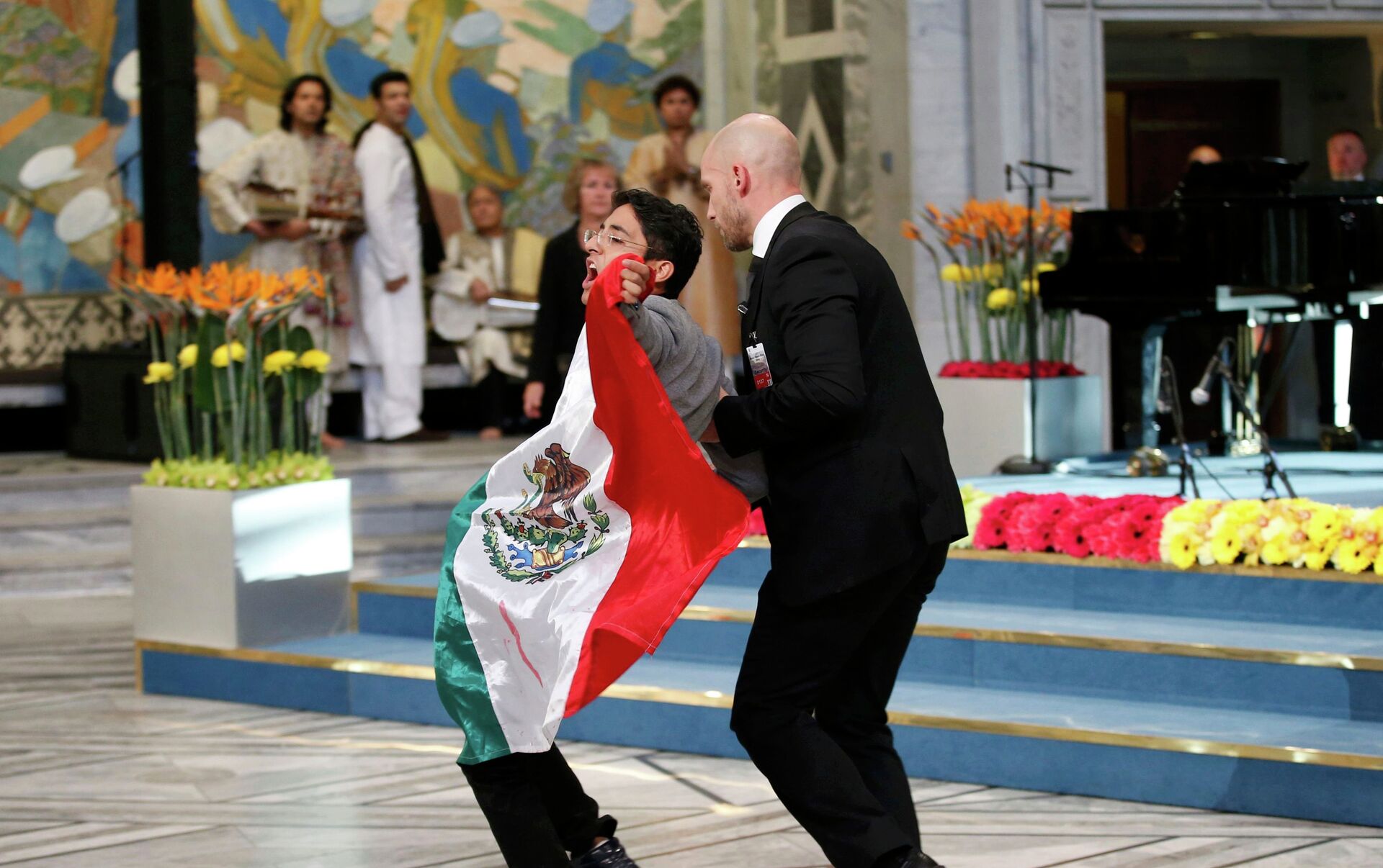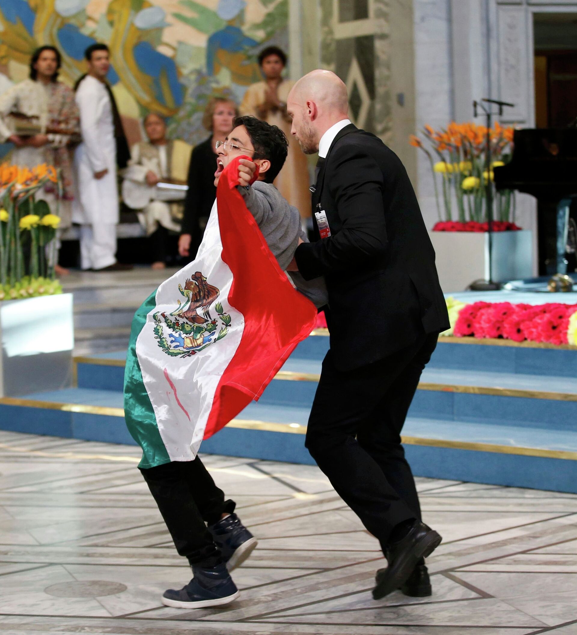 El manifestante portaba una cámara simulando ser periodista y subió con una bandera mexicana a la tribuna del Ayuntamiento de Oslo cuando la adolescente paquistaní Malala Yousafzai y el presidente de la Marcha Global contra el Trabajo Infantil, el indio Kailash Satyarthi, recibían la medalla y el diploma del Nobel.