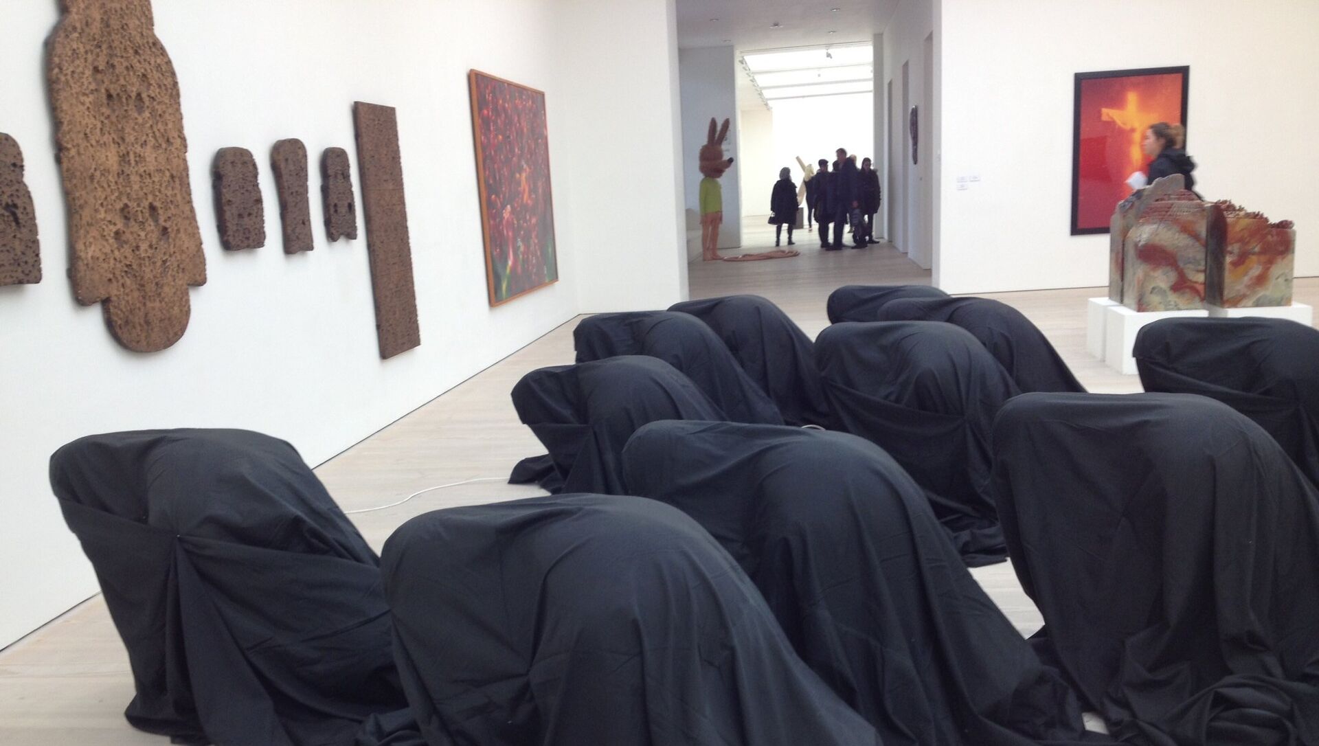 En la Saatchi, los bultos negros de Shutov se postran ante unas tablas de madera que su autor, Anatoly Osmolovsky, bautizó ´Pan, series´.