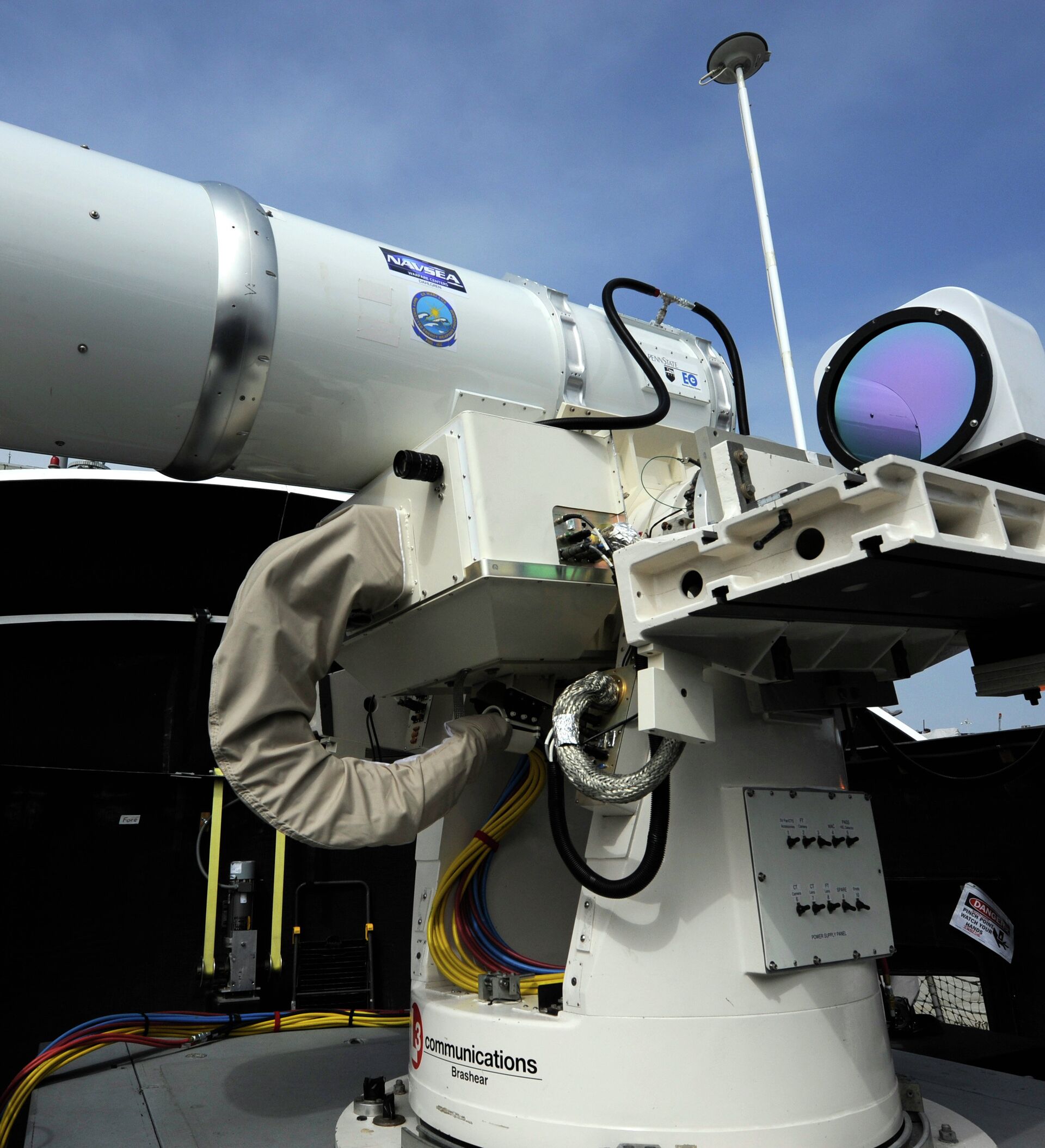 El primer sistema láser de uso militar, desarrollado por la Armada de EEUU, fue instalado en un buque anfibio USS Ponce (LPD-15) con el objetivo de defender a los drones, helicópteros y pequeños buques de patrullaje.