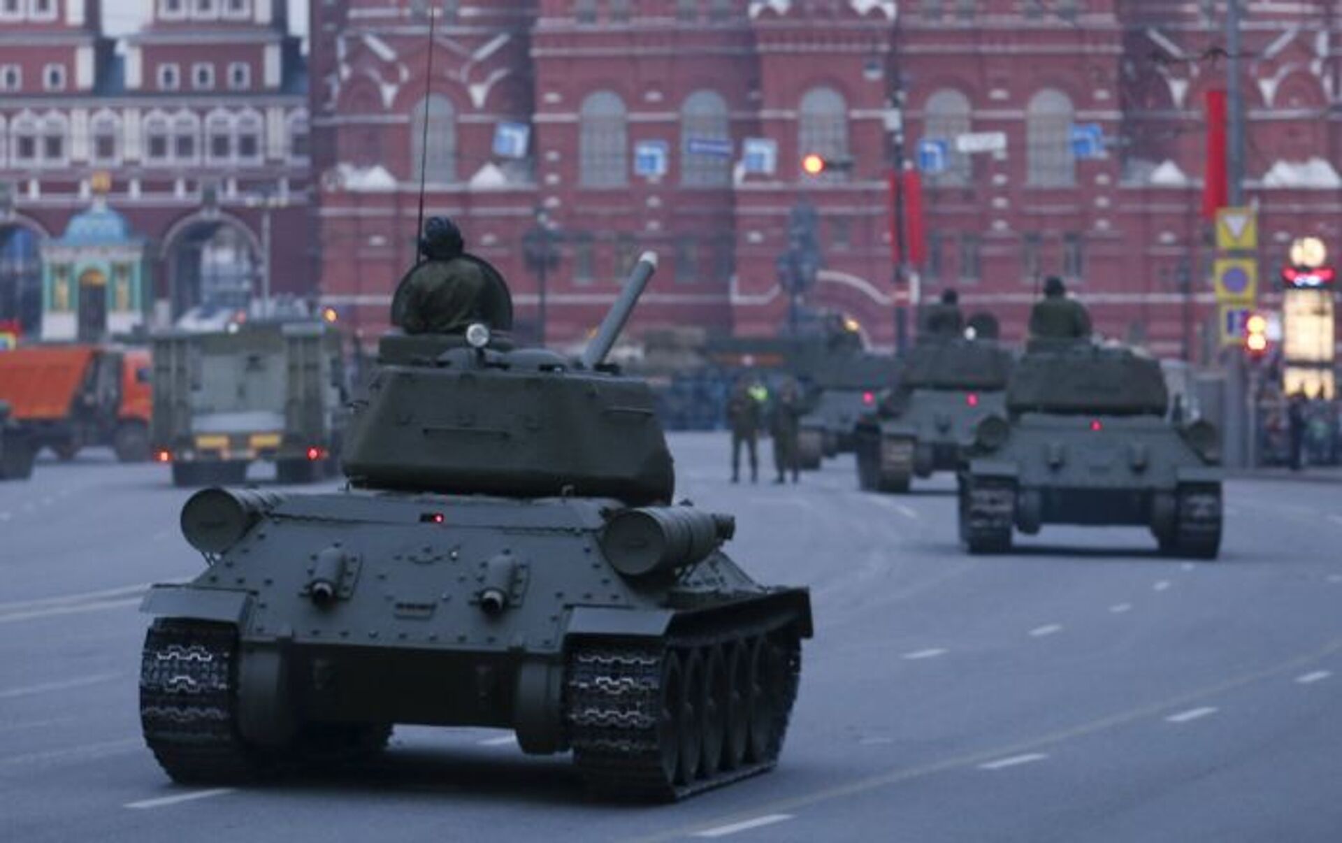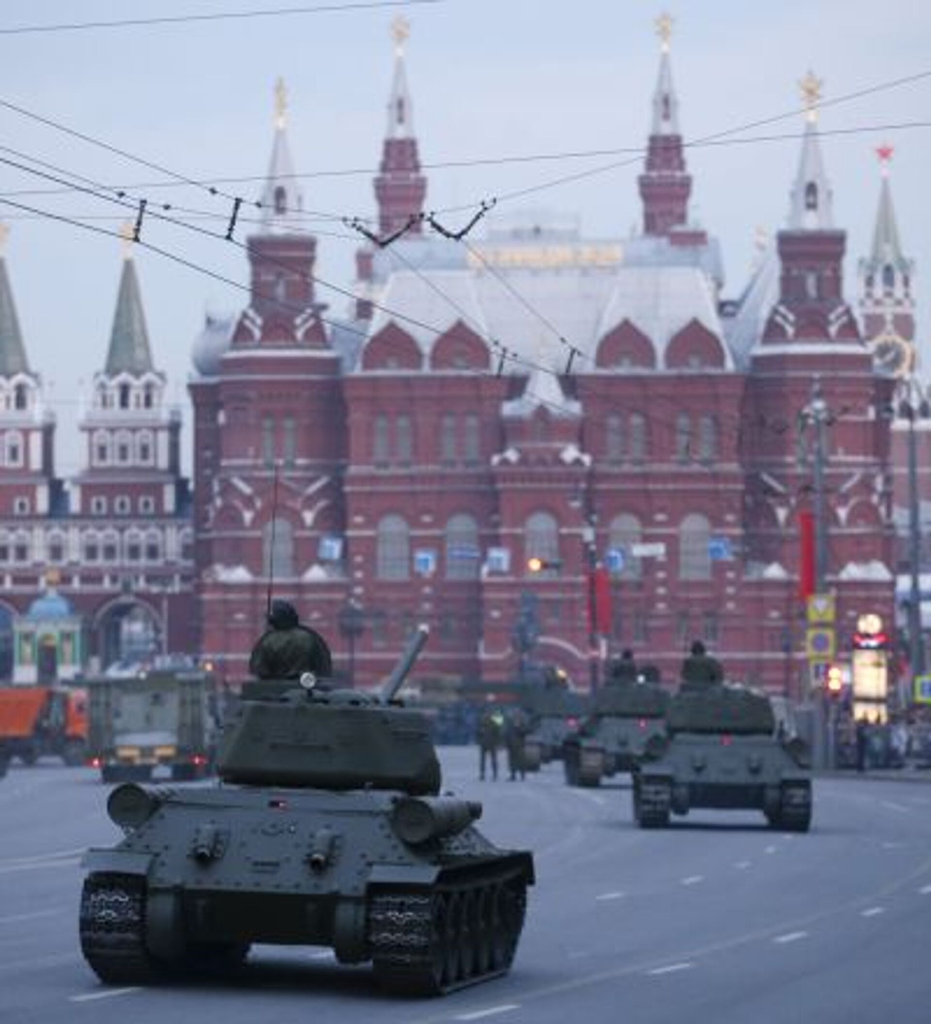 Tanques T-34-85 de la Gran Guerra Patria (1941-1945) en la céntrica calle Tverskaia de Moscú, durante el ensayo del desfile militar.