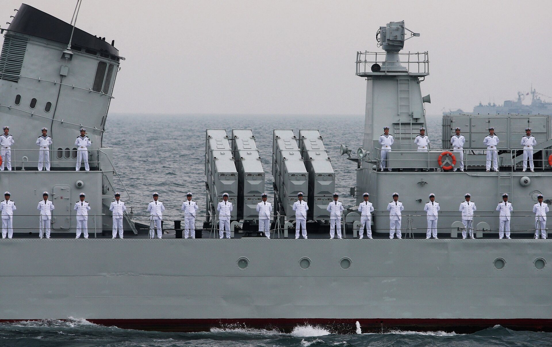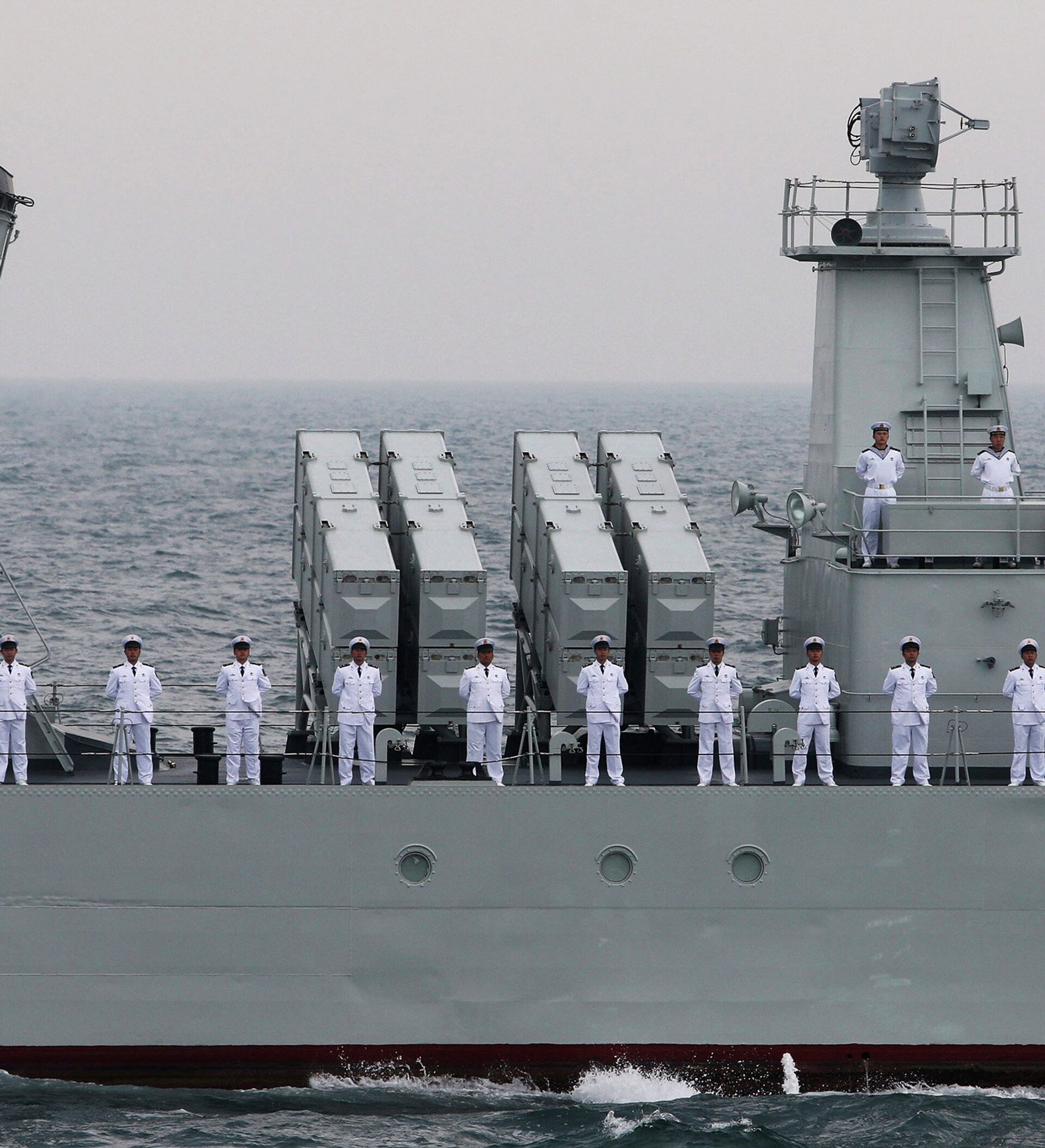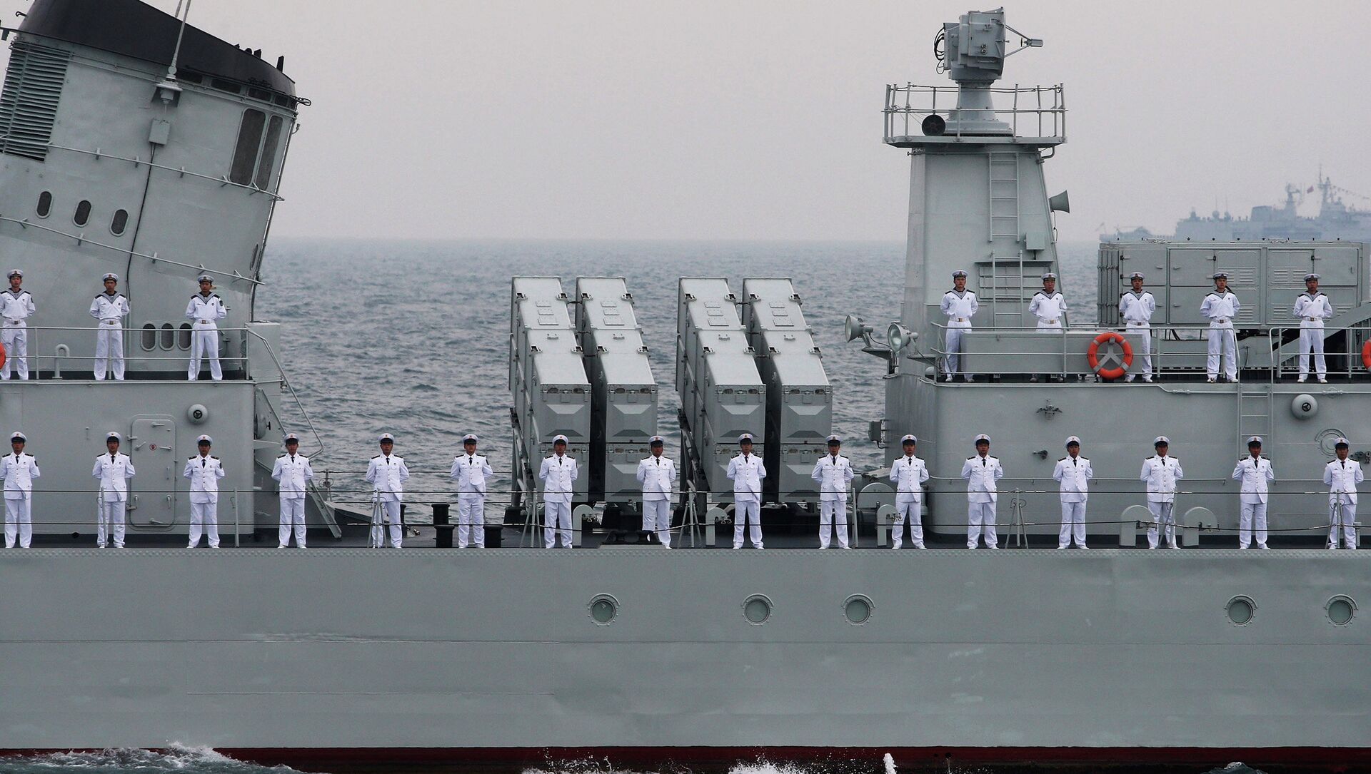 Los comandantes de las maniobras, el subcomandantes de la Armada Rusa, vicealmirante Alexandr Fedoténkov, y el subcomandantes de la Fuerza Naval de China, vicealmirante Du Tszinchen, recibieron el reporte de la comandancia del Estado mayor sobre el estado de preparación de las maniobras e impusieron las tareas, dando por comenzada la parte práctica de estos ejercicios.