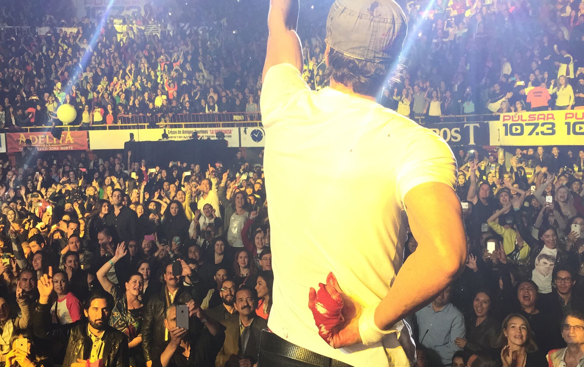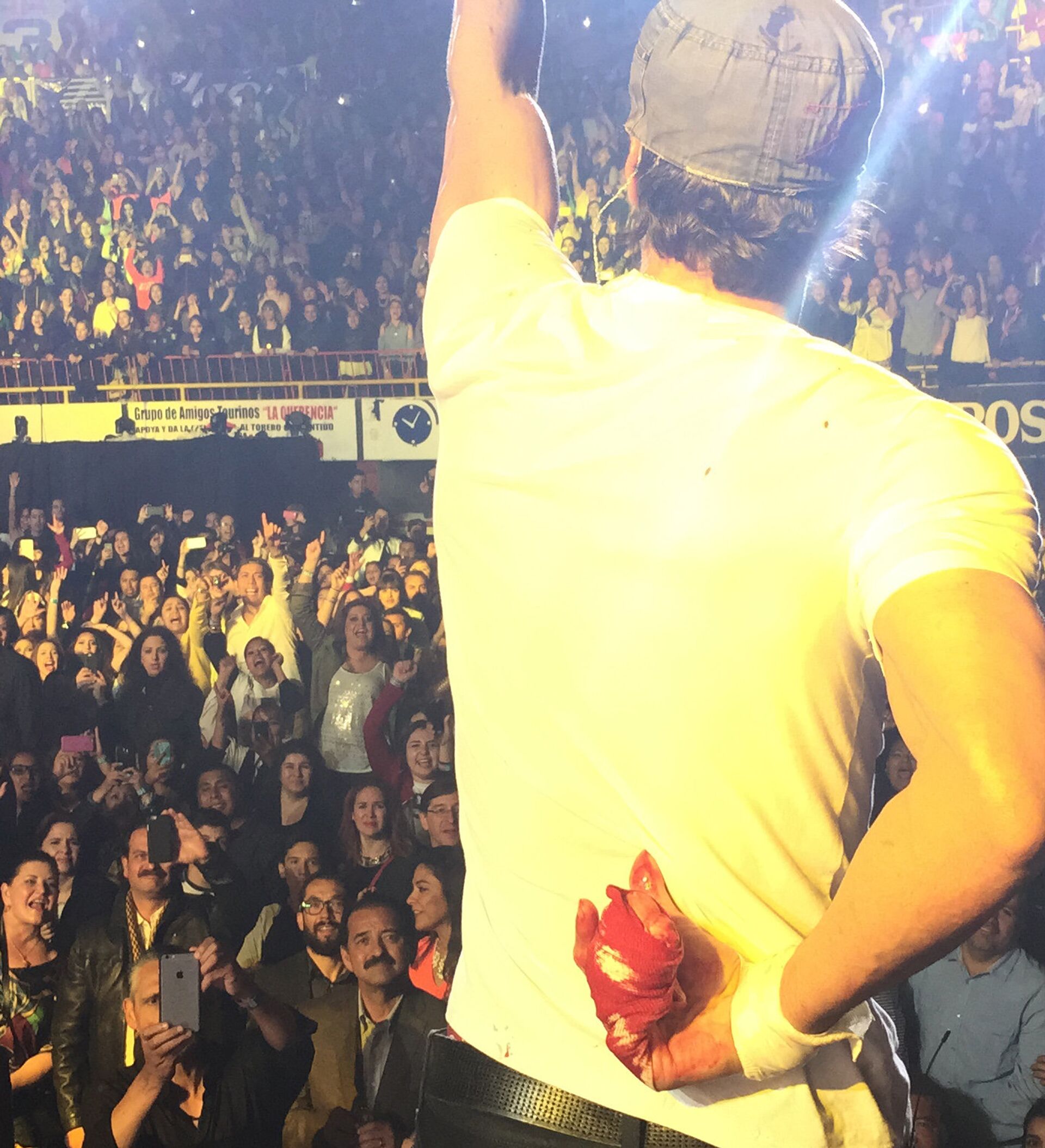 A pesar de recibir la herida Iglesias siguió cantando con la mano vendada y la camiseta blanca manchada de sangre.