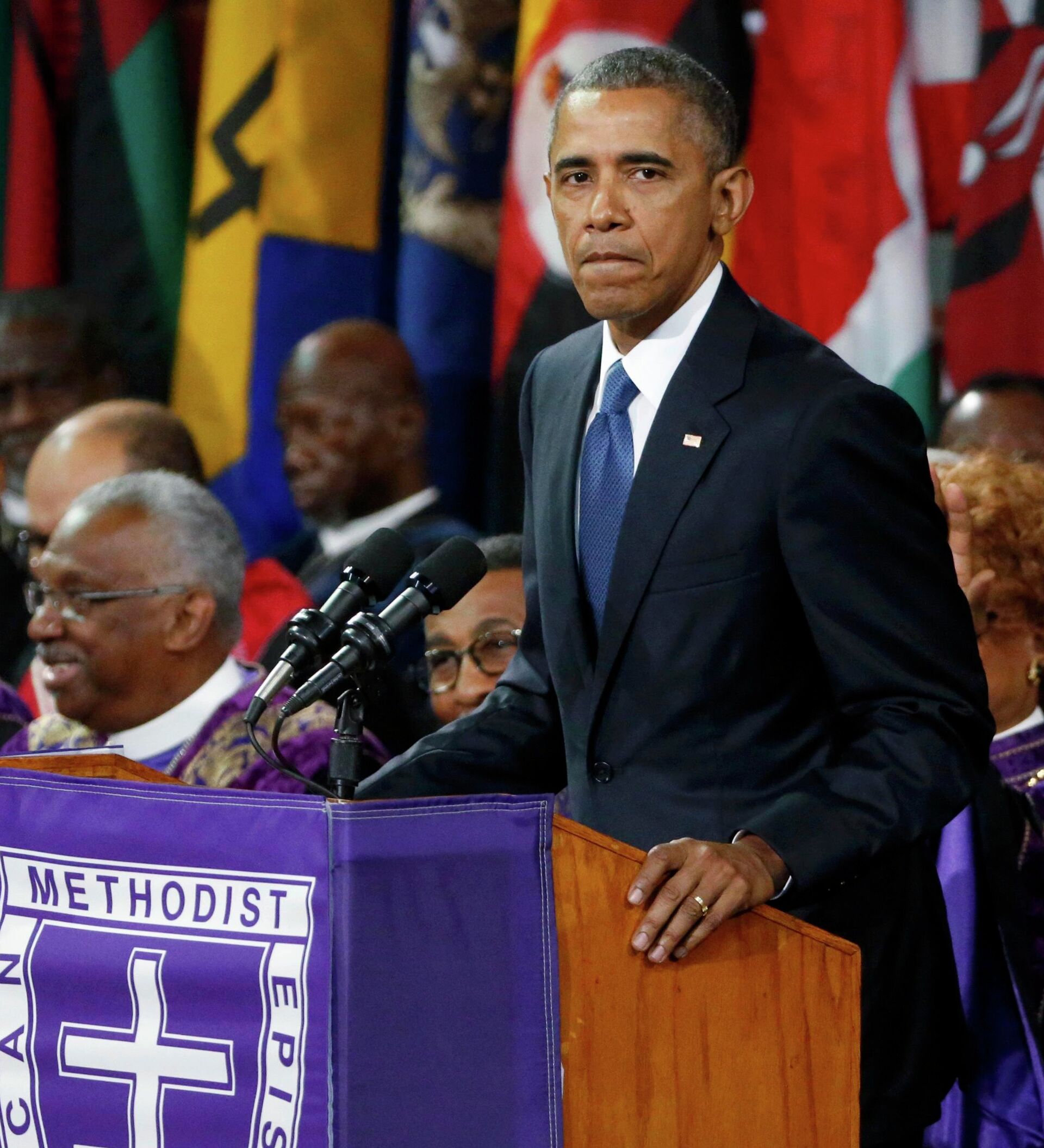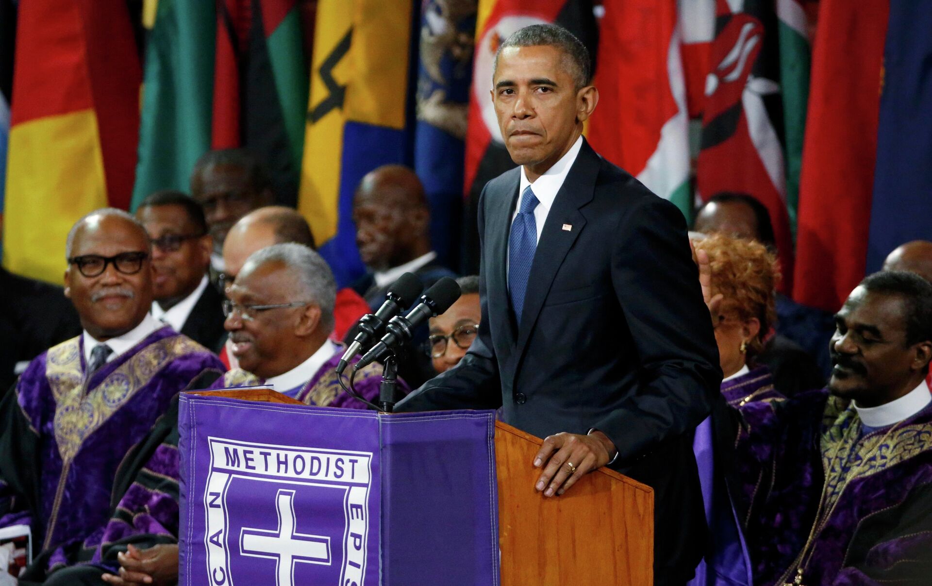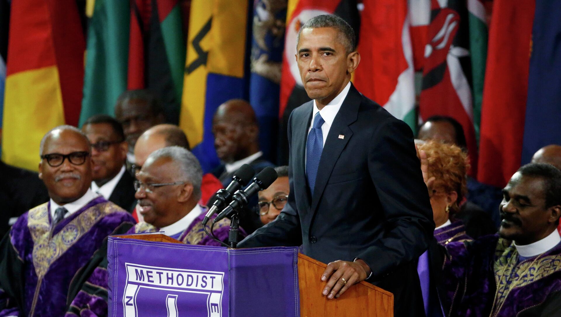 En su panegírico, en el que definió al pastor metodista y senador por Carolina del Sur como "un ejemplo" y "un hombre de servicio", Obama llamó a reconsiderar la idea de "hombría" que da el porte de armas y cuestionó el uso de la bandera confederada en edificios públicos.
