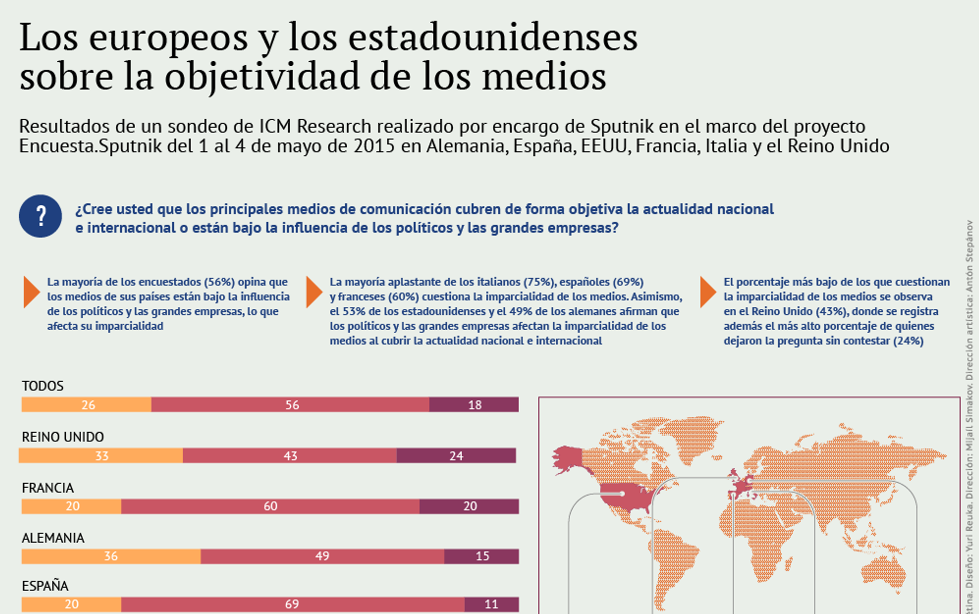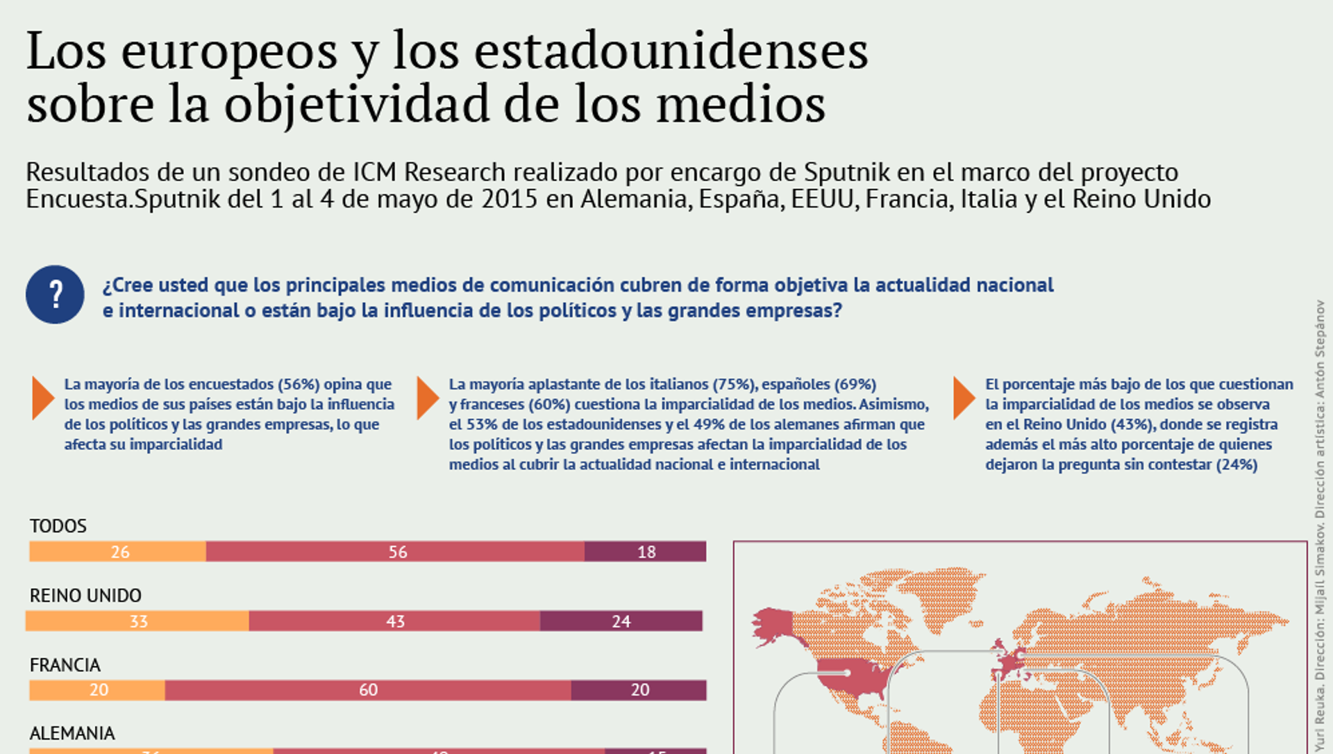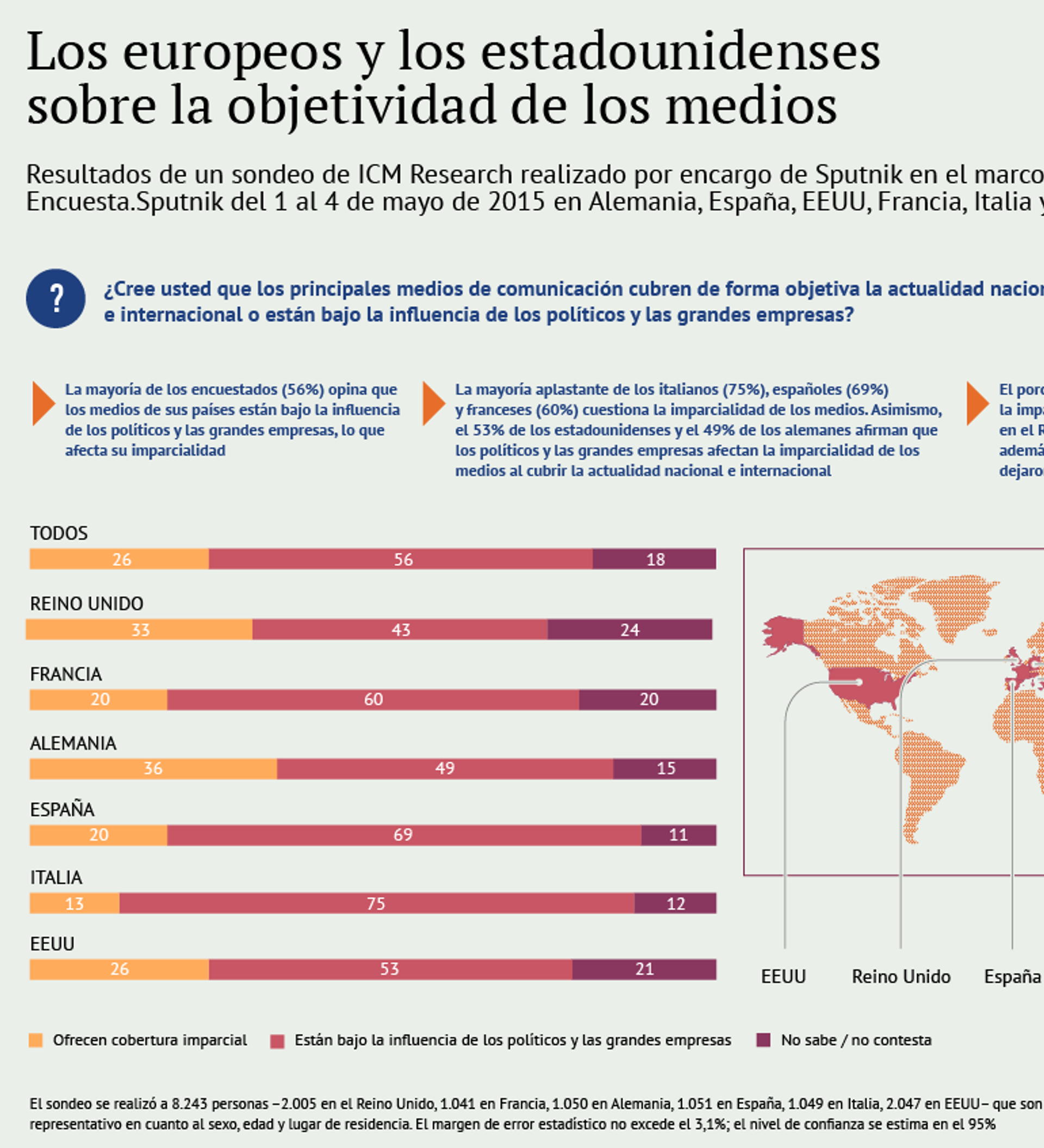 07:38 GMT 25.08.2015 (actualizado: 18:26 GMT 11.02.2021) La mayoría de los españoles y de sus vecinos del Mediterráneo, los italianos y los franceses, opinan que los principales medios de comunicación de sus países están bajo influencia de los políticos y grandes empresarios, revela un sondeo que realizó por encargo de Sputnik la analista ICM Research.