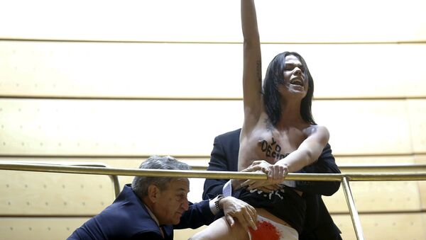El presidente del Senado, Pío García Escudero, ordenó su desalojo, al que la feminista se resistió al grito de "mi cuerpo, mis normas".