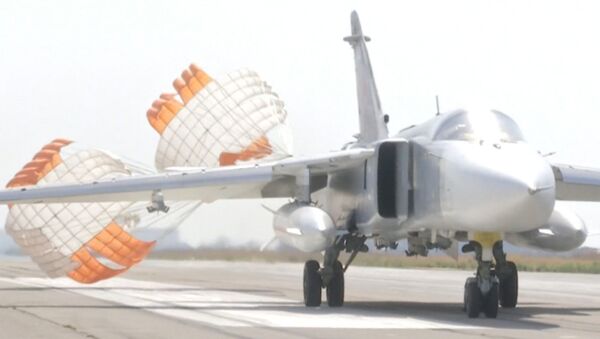 Estas imágenes del Ministerio de Defensa de Rusia muestran varios aviones Su-24M y Su-30M despegando y aterrizando en la base aérea de Hmeymim, cerca de... 20.10.2015, Sputnik Mundo