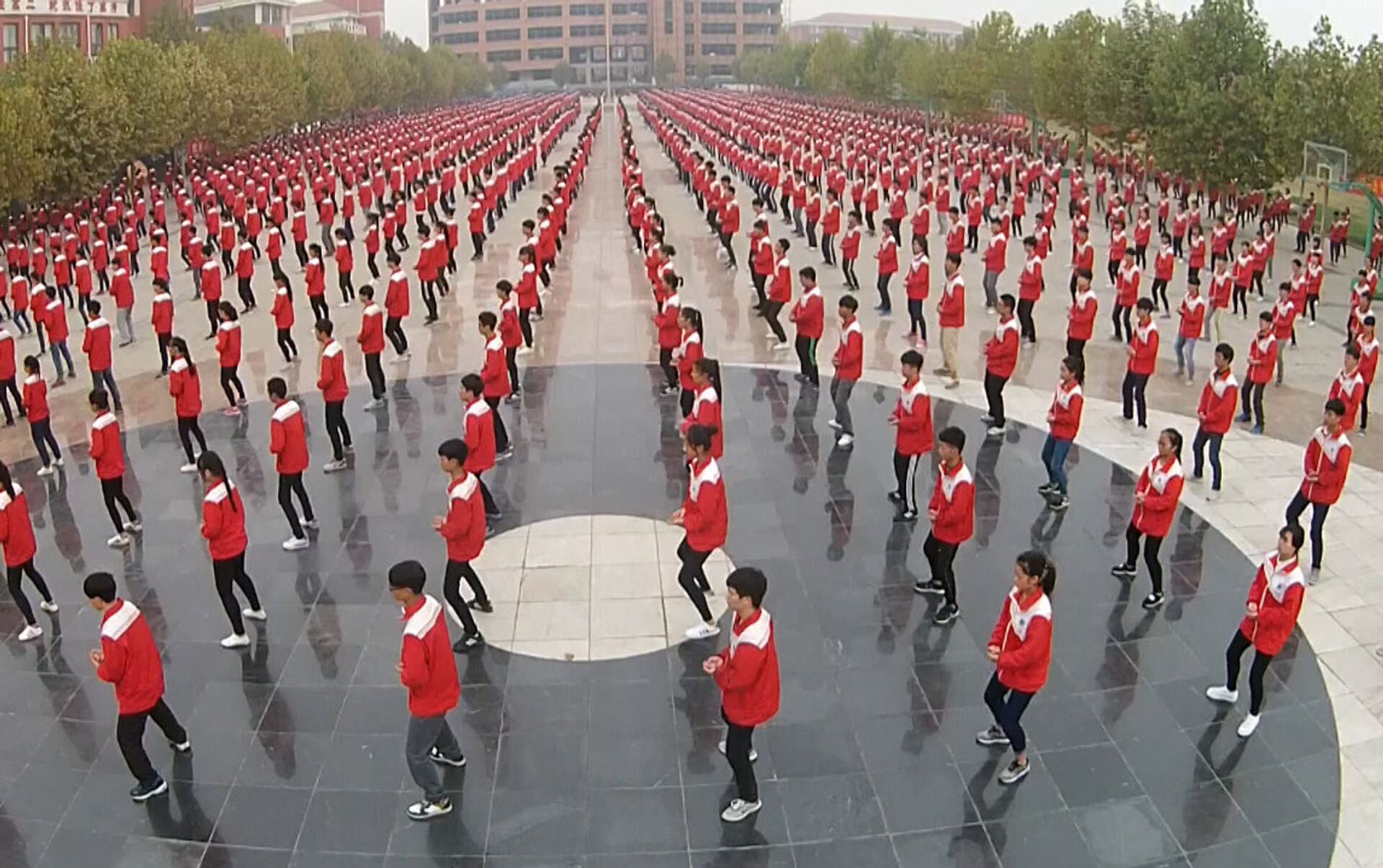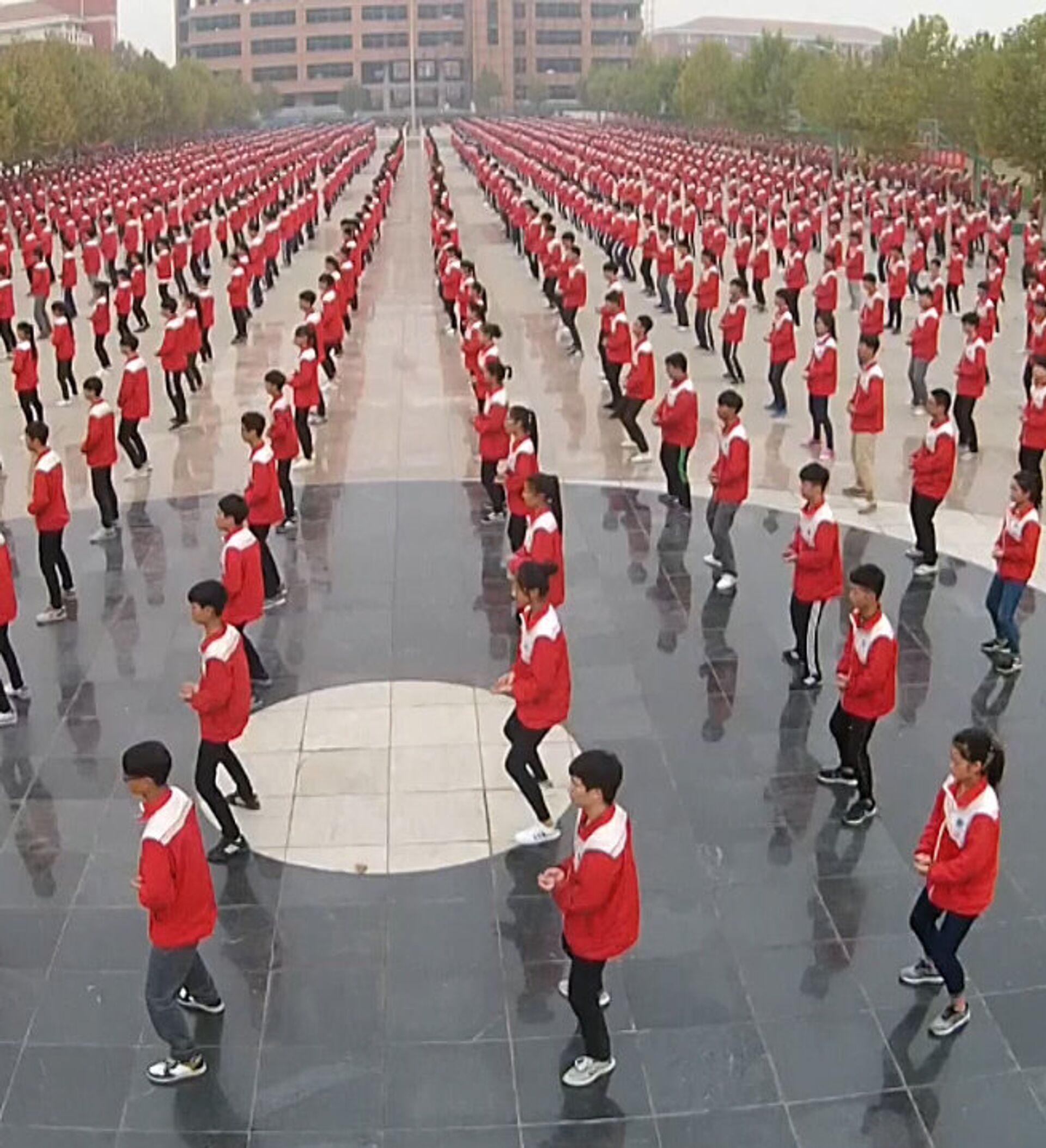 Unas 50.000 personas ataviadas con chaqueta de chándal roja han participado en esta sesión que se ha desarrollado en 15 estadios, polideportivos o parques de la provincia china de Henan.