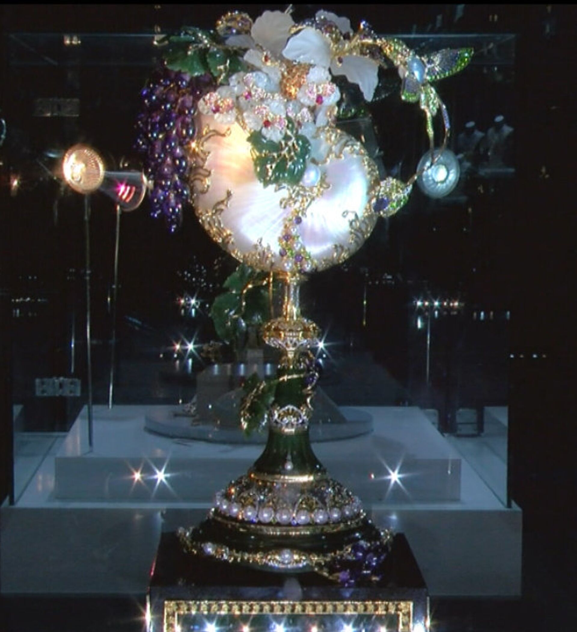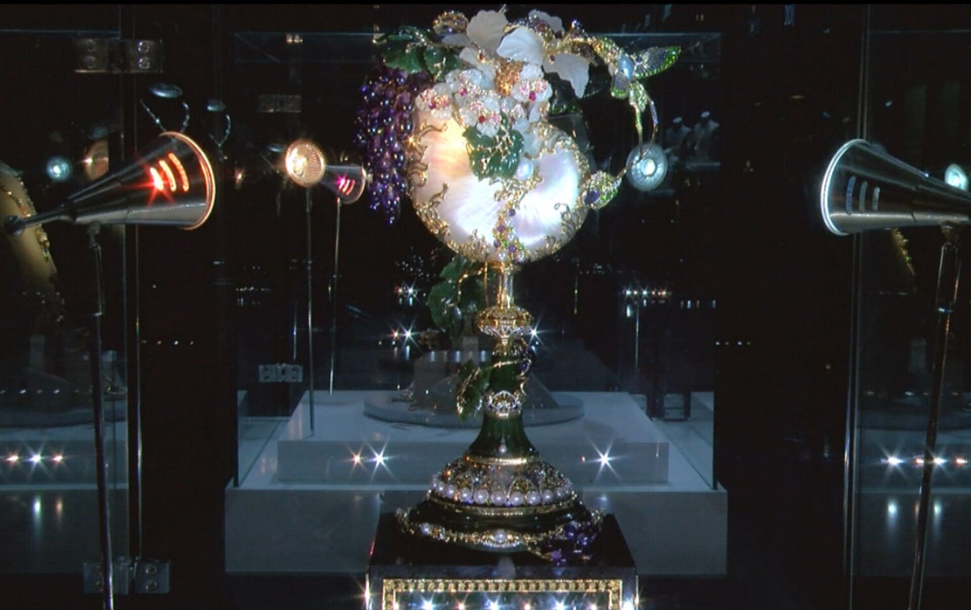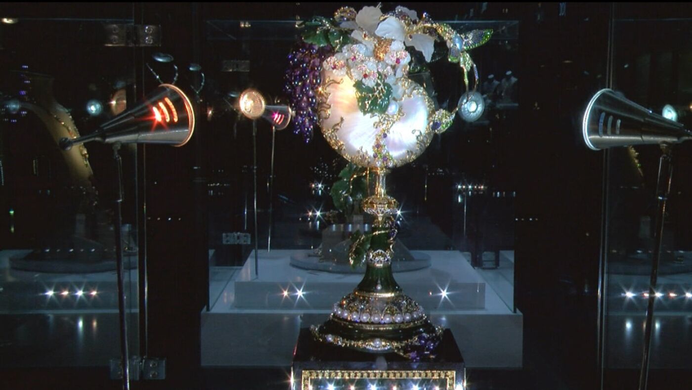 El reloj "Cuerno de la abundancia" está hecho con más de un kilo de oro, más de 2.000 diamantes y medio millar de zafiros. La parte que marca la hora lleva incrustada una perla de gran valor.