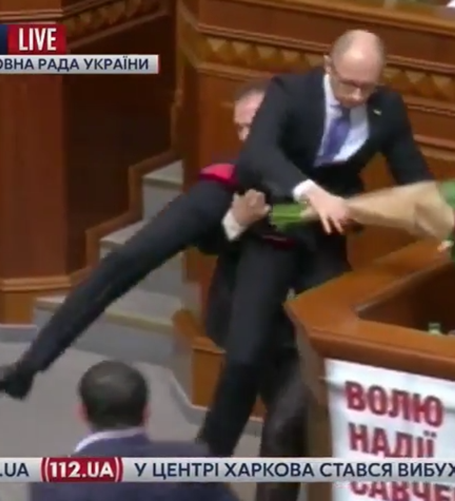El primer ministro ucraniano, Arseni Yatseniuk, fue levantado por los testículos durante una pelea en la Rada Suprema.