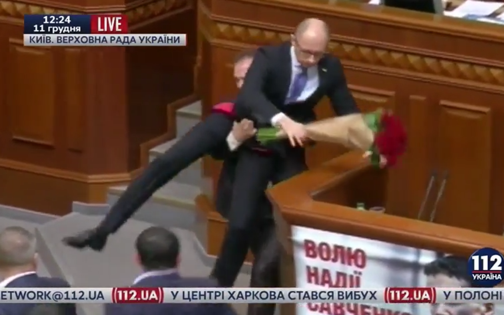 El incidente ocurrió cuando uno de los diputados se acercó al jefe del Ejecutivo mientras este estaba en la tribuna y le regaló un ramo de rosas con cinta fúnebre. Acto seguido el parlamentario agarró a Yatseniuk en un intento de apartarle de la tribuna.