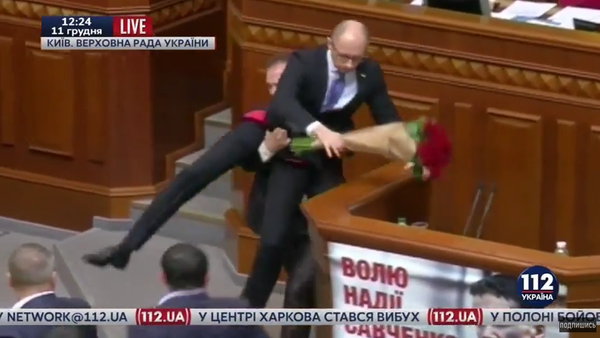 El primer ministro ucraniano, Arseni Yatseniuk, fue levantado por los testículos durante una pelea en la Rada Suprema. 11.12.2015, Sputnik Mundo