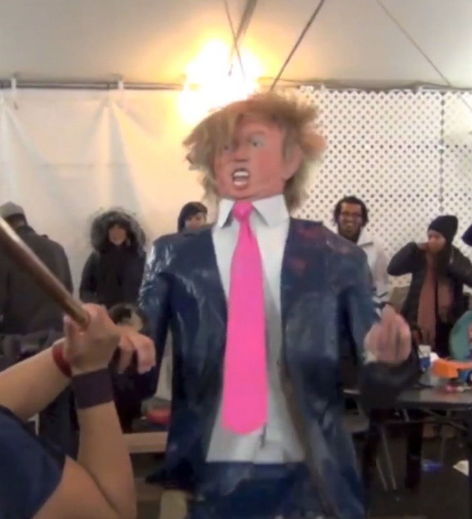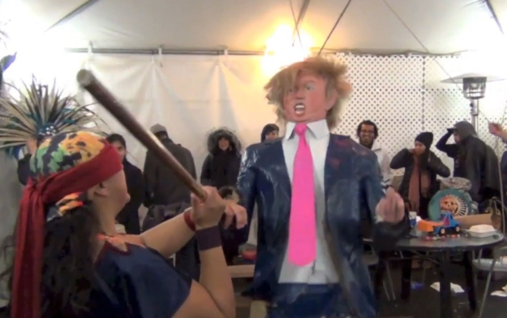 15:31 GMT 14.12.2015 (actualizado: 15:36 GMT 14.12.2015) Un grupo de niños y adultos se ensañó bate en mano con una piñata en forma del principal candidato republicano a la Casa Blanca, el multimillonario Donald Trump.