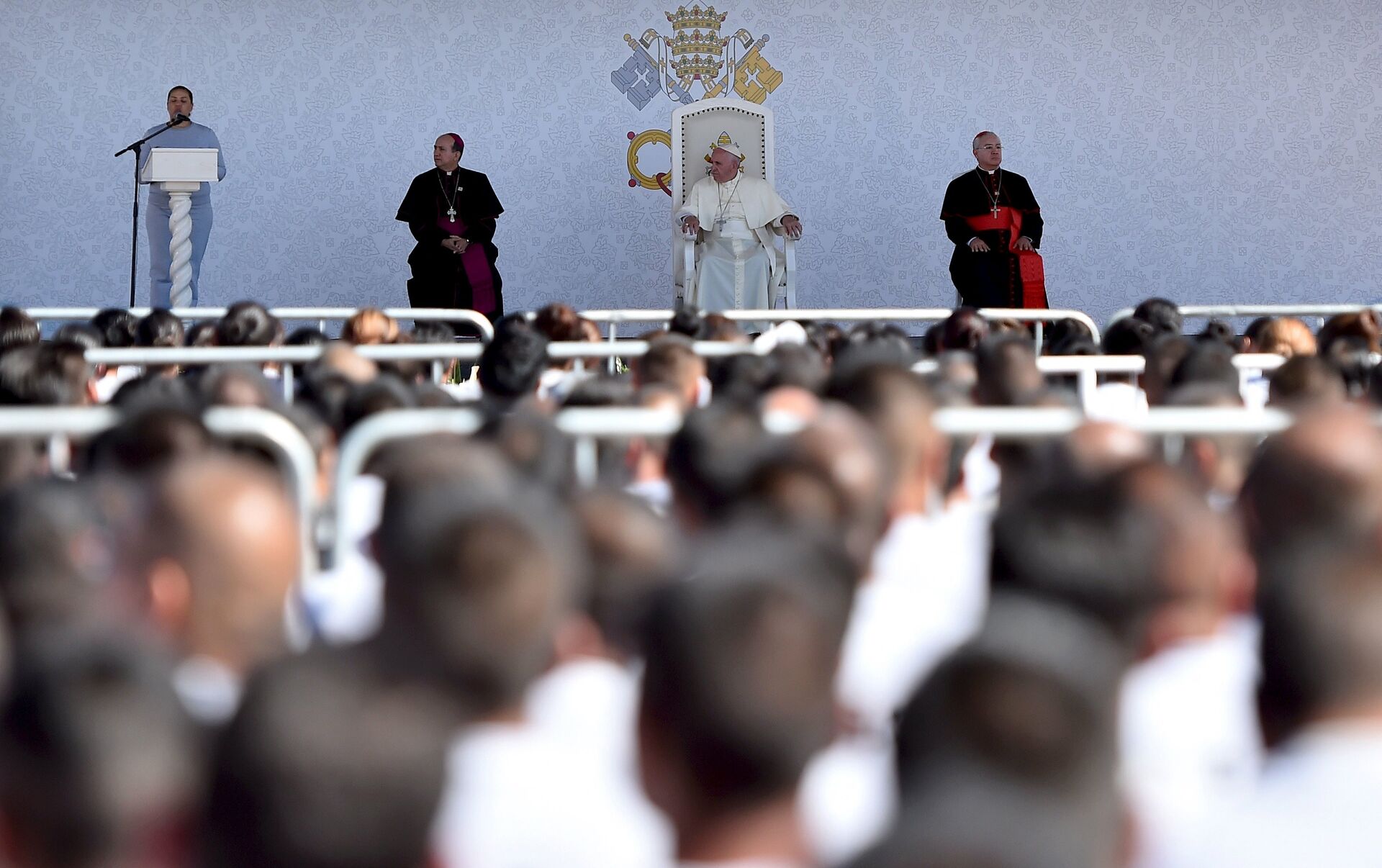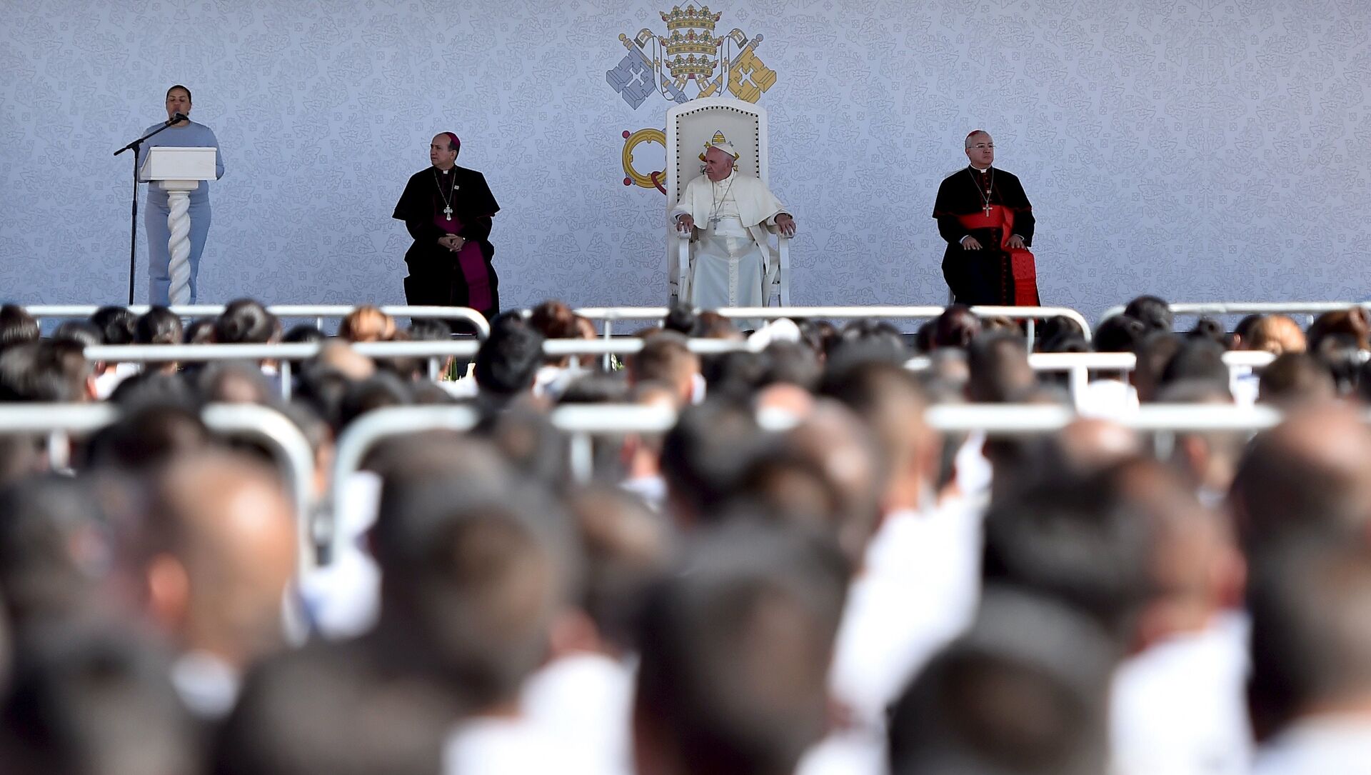 El Papa recibió un bastón labrado y una vajilla fabricada en los talleres del penal, donde les señaló a reclusos y custodios el "camino urgente que debemos tomar para romper los círculos de la violencia y de la delincuencia".