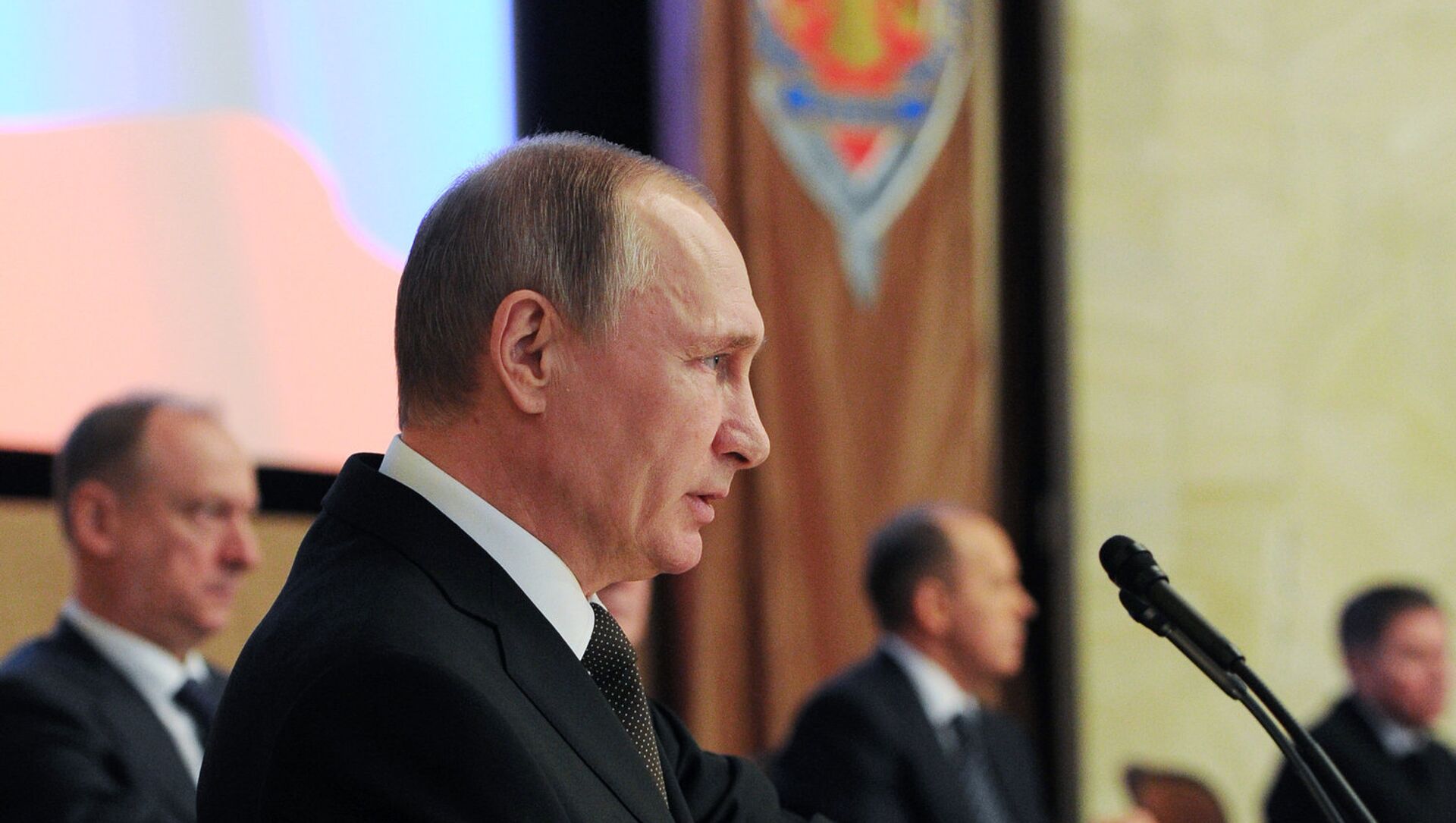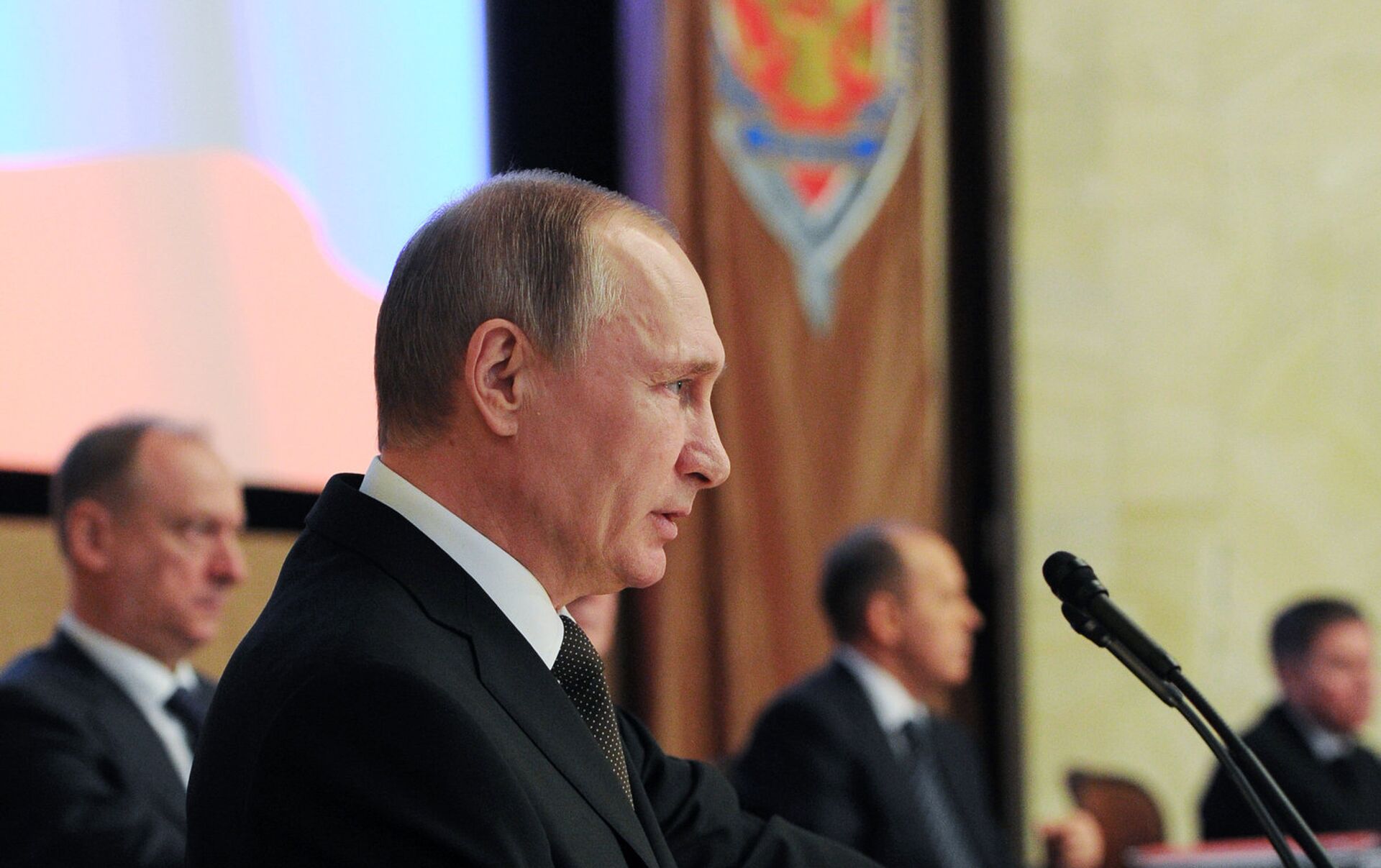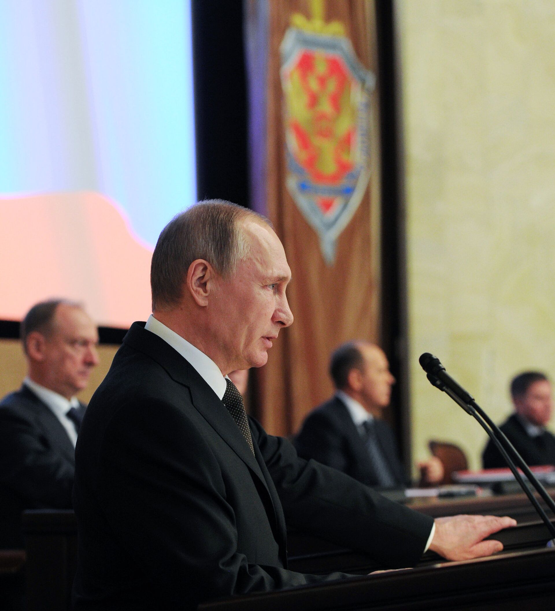 Putin indicó que a lo largo de 2015 los servicios secretos de países extranjeros aumentaron sus actividades en Rusia y que la inteligencia rusa tiene que trabajar en condiciones de presión económica, política, militar e informativa sobre Rusia.