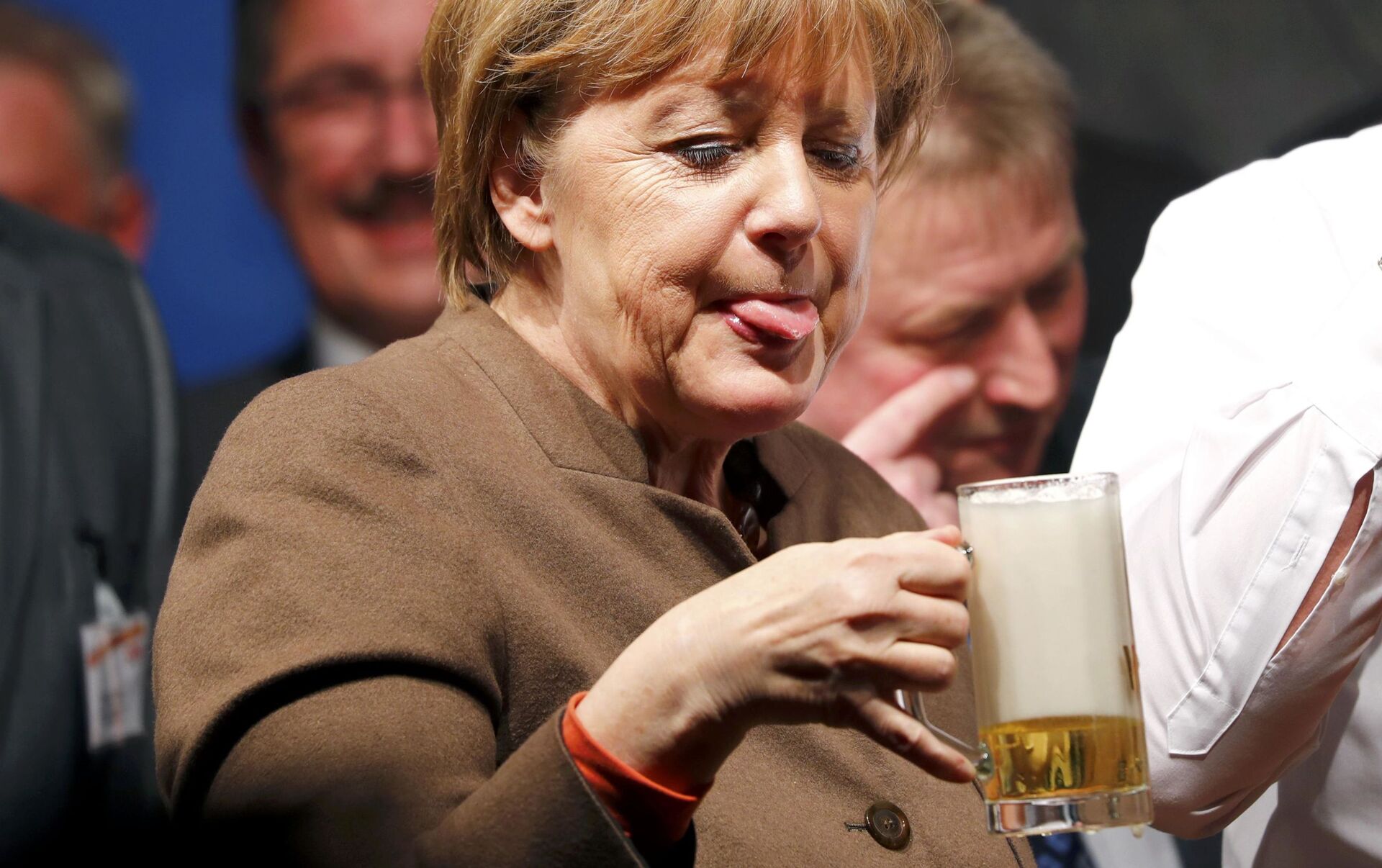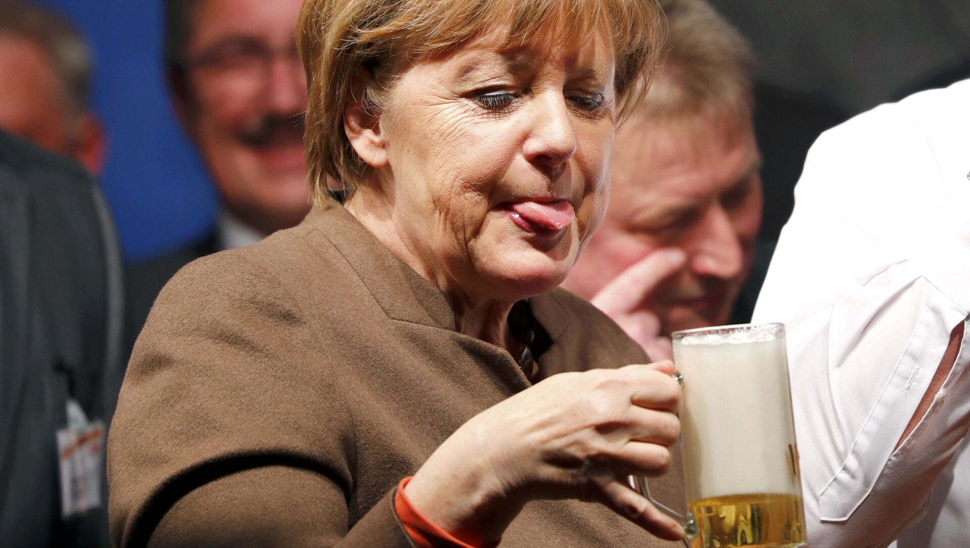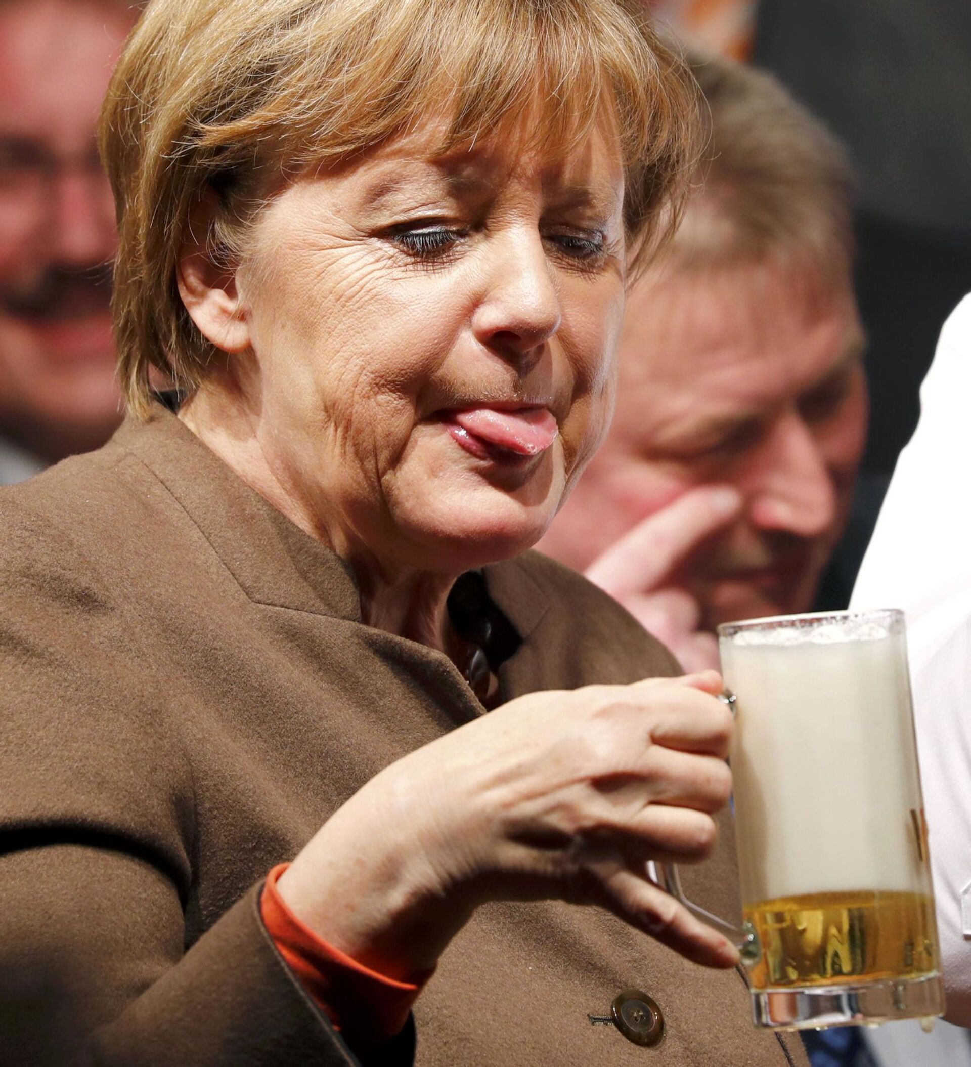 En los medios a menudo aparecen fotos de Angela Merkel con una copa de cerveza, un ejemplo de esto es la fotografía del 29 de febrero donde la canciller disfrutó de la espumosa bebida en la reunión con sus partidarios en la ciudad de Volkmarsen. Dos días antes, a Merkel casi la bañaron en cerveza. El accidente tuvo lugar el 27 de febrero en la ciudad de Demmin. El camarero que la atendía perdió la estabilidad y tiró la bandeja con la bebida espirituosa sobre la mandataria. La canciller, a su vez, no se inmutó y continuó con una sonrisa durante el encuentro.