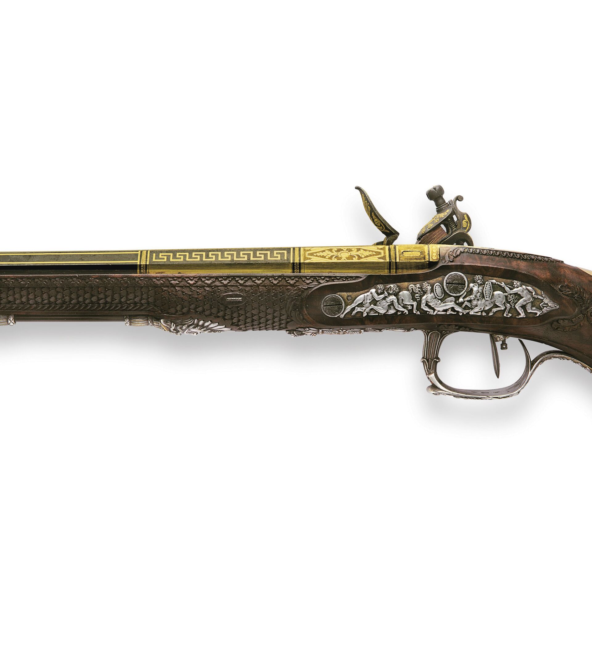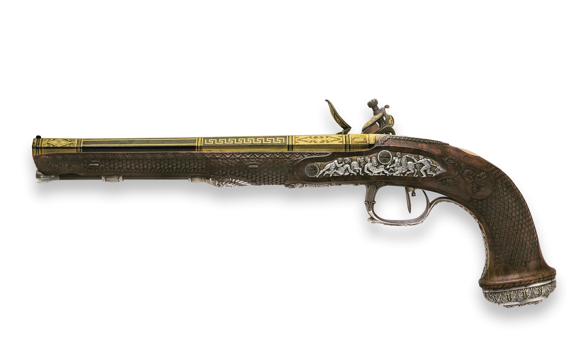 Estas dos armas artesanales, incrustadas con oro y plata y adornadas con escenas de la mitología griega y romana, fueron creadas en Versalles en 1825 por el armero oficial de Napoleón, Nicolás Noel Boutet.
