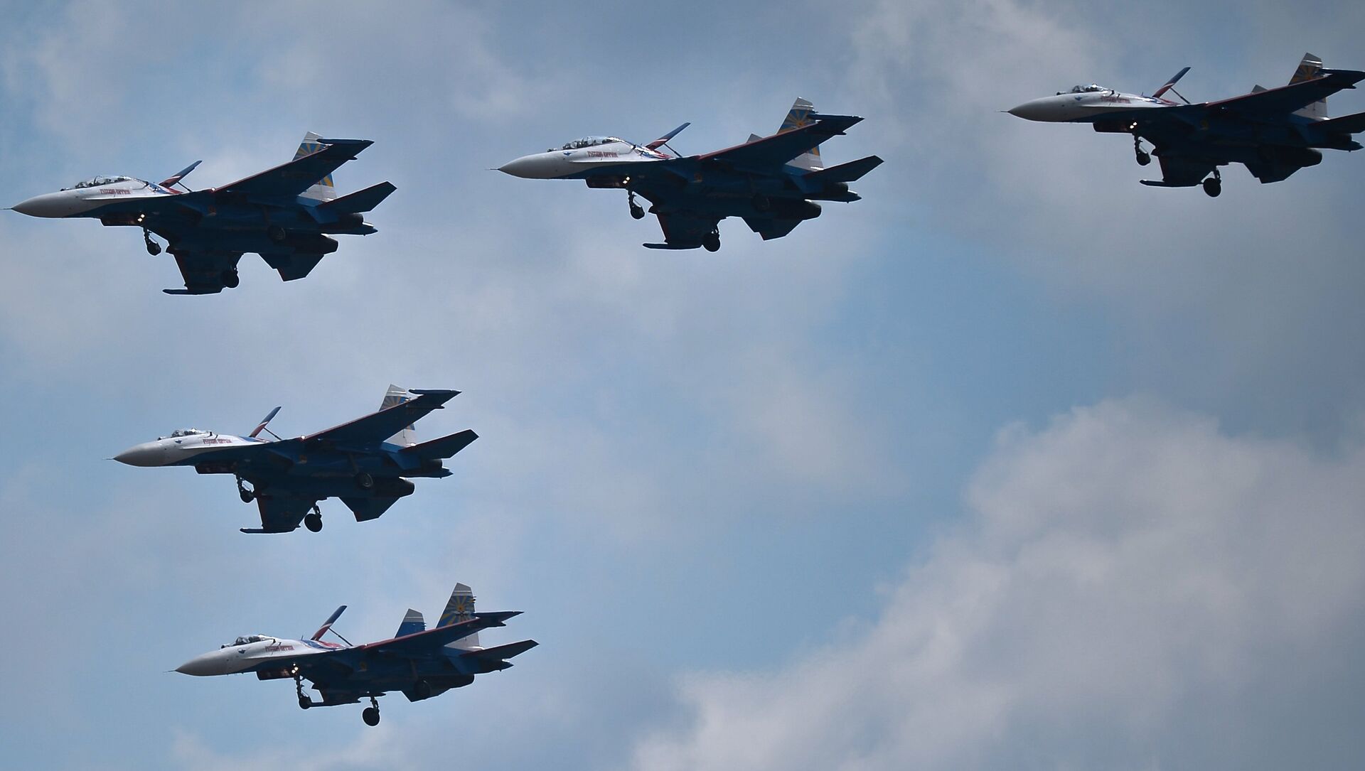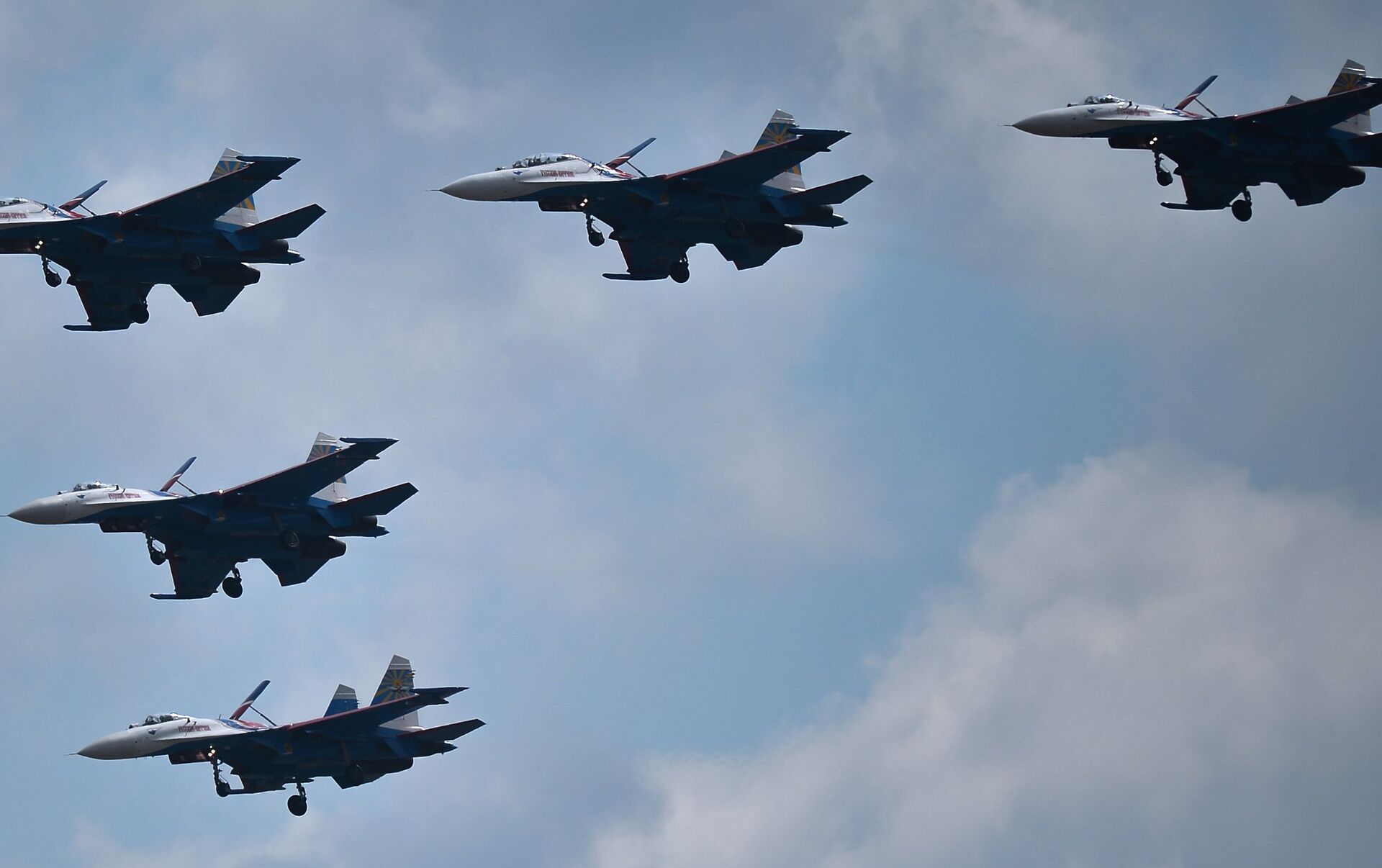 De acuerdo con la tradición, las escuadrillas acrobáticas “Rúskiye Vítiazi” y “Strizhí” participarán en el desfile. Mostrarán el famoso “diamante de Kúbinka” de nueve aeronaves Su-27 y MiG-29. - Sputnik Mundo