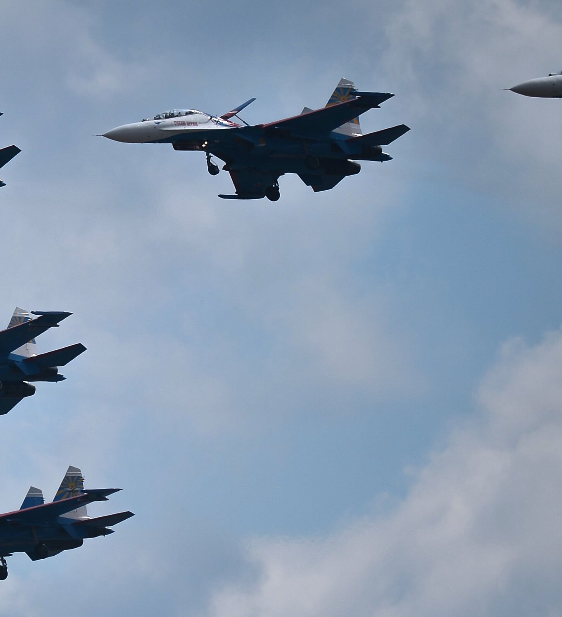 El grupo de pilotaje “Rúskiye Vítiazi” durante el entrenamiento conjunto de los grupos aéreos para el Desfile de la Victoria en el aeródromo militar de “Kúbinka”, en la región de Moscú.