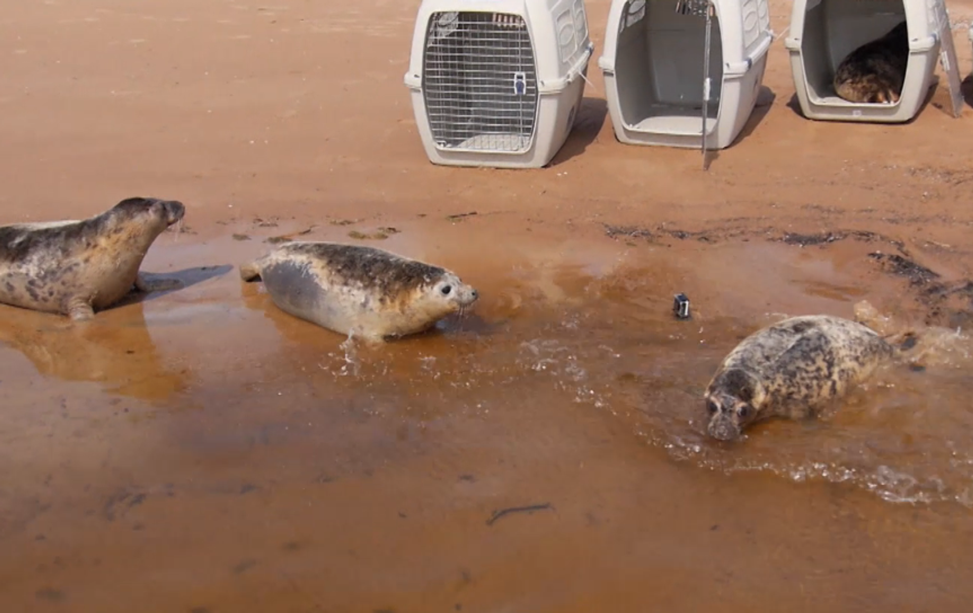 En el vídeo se puede apreciar cómo los animales, rebosantes de alegría y paladeando por anticipado el medio marino, se lanzan a las frescas aguas del golfo de Finlandia.