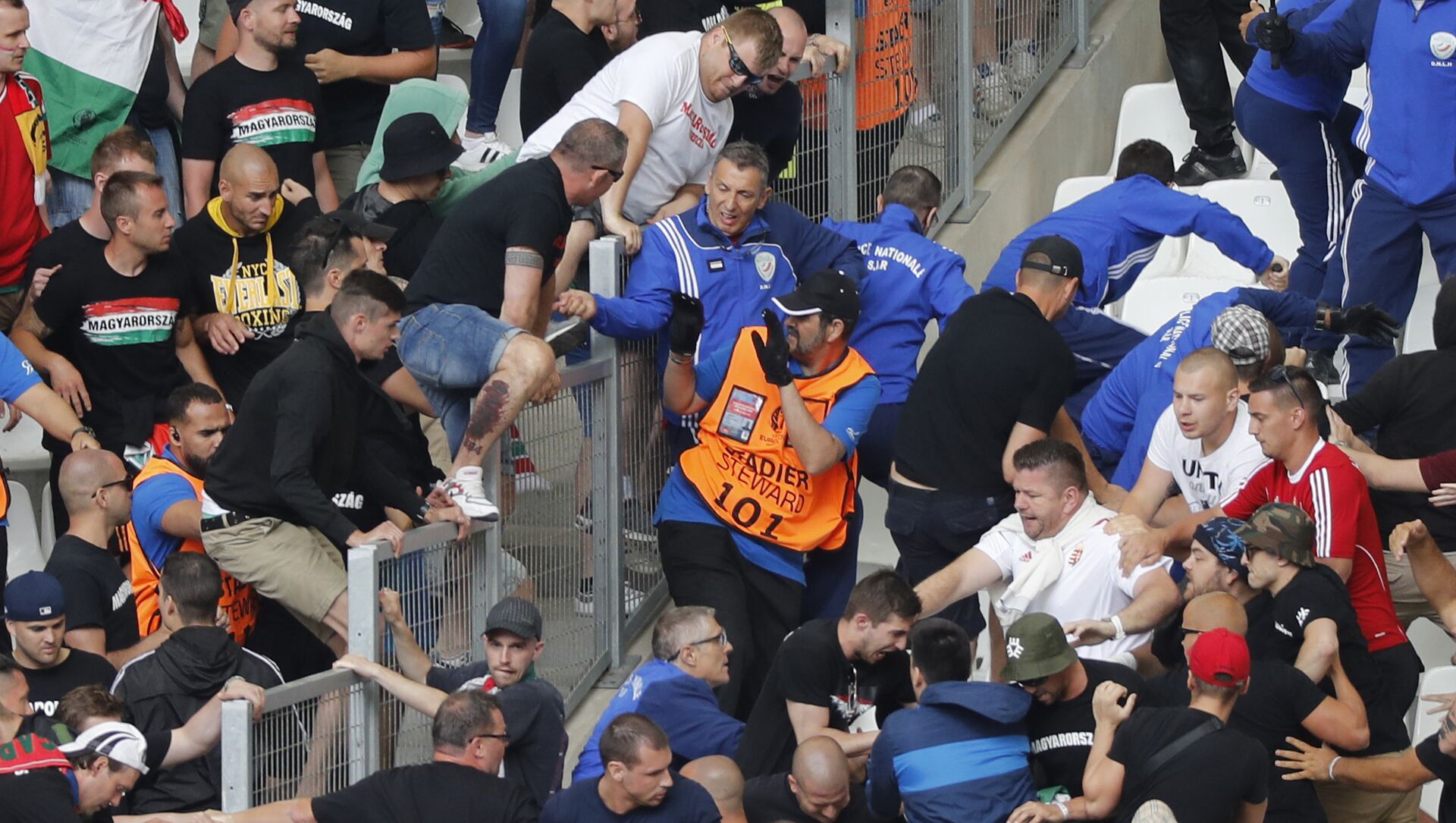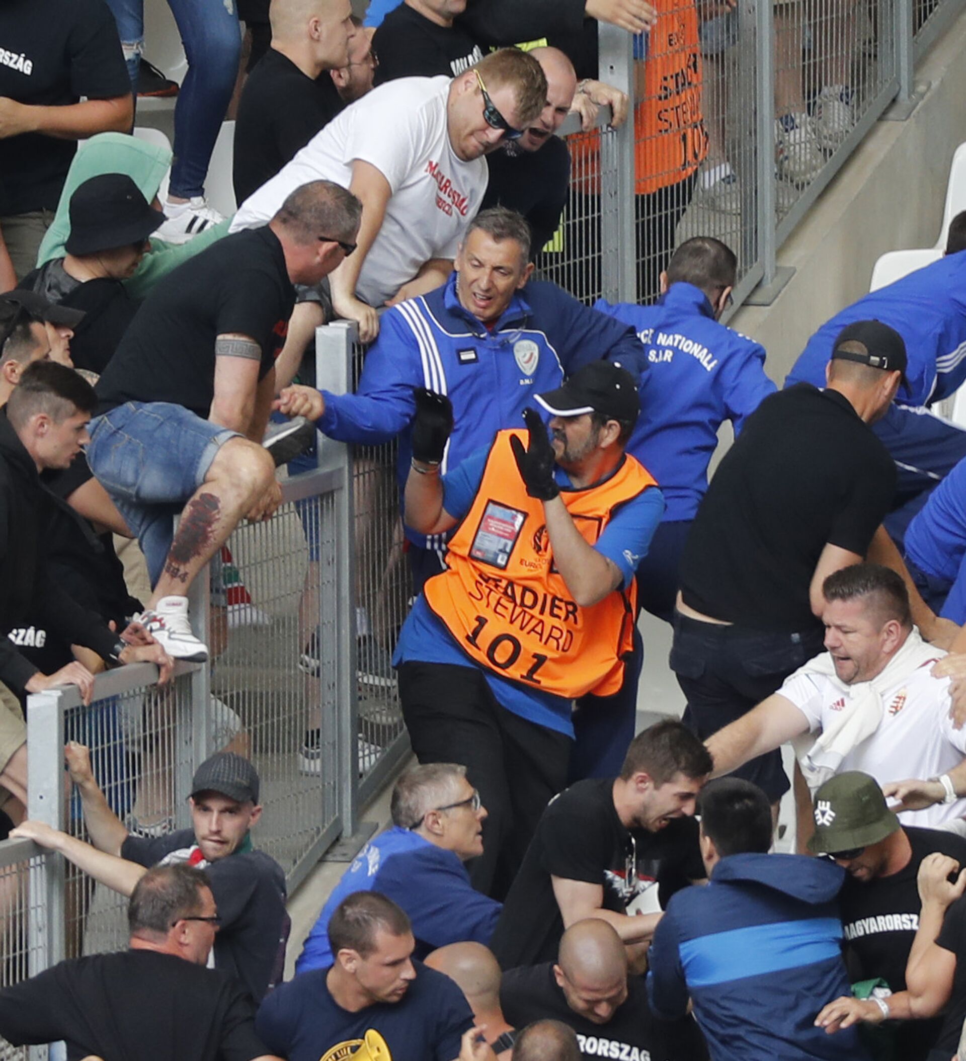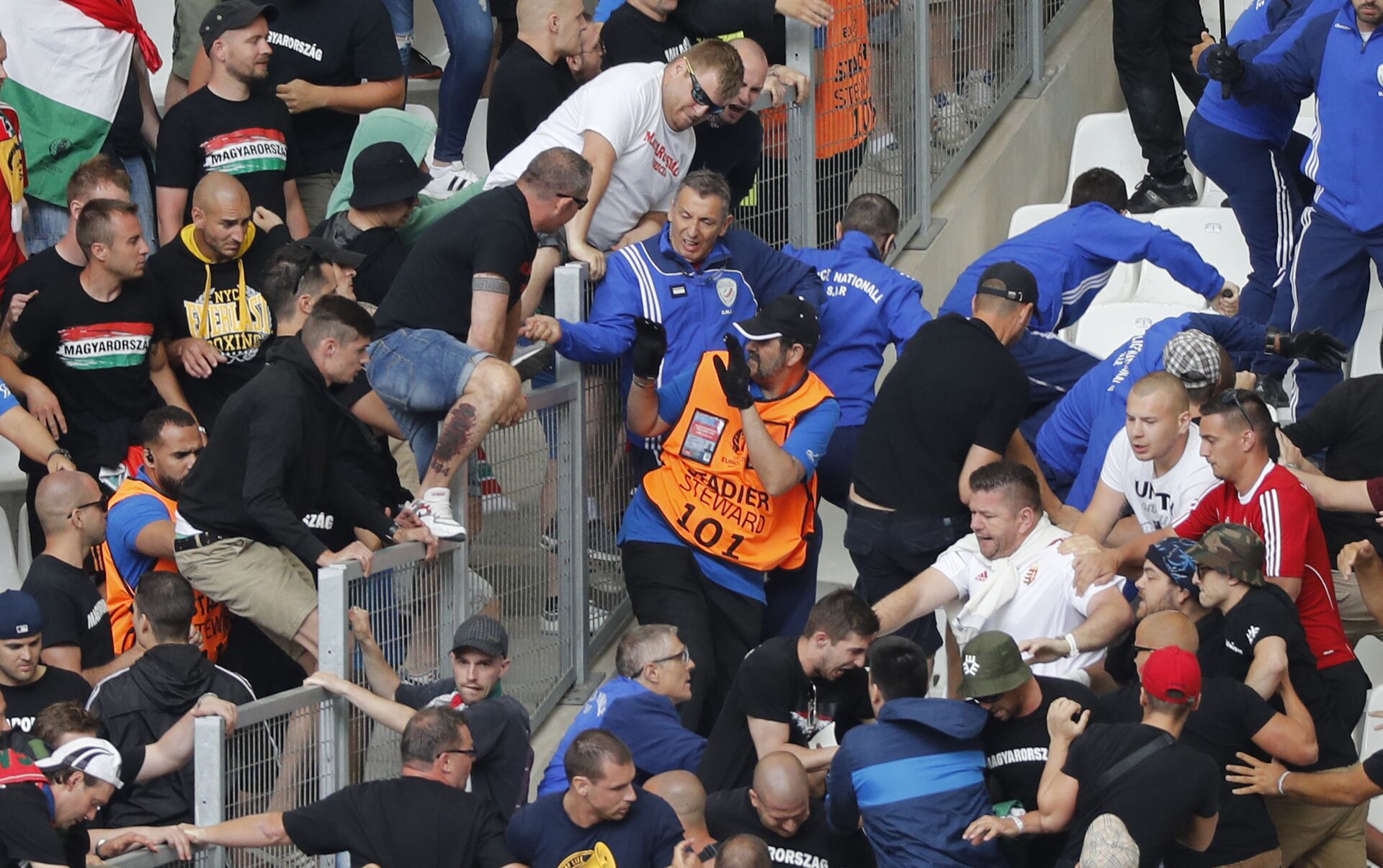 Sobresalieron los aficionados húngaros, ya que antes del inicio del partido Hungría-Islandia generaron disturbios encendiendo fuegos artificiales en el estadio y lanzando objetos a la cancha. Además, alrededor de 100 húngaros, presuntamente de ultraderecha, intentaron trepar la valla para lanzar ataques contra los aficionados islandeses.