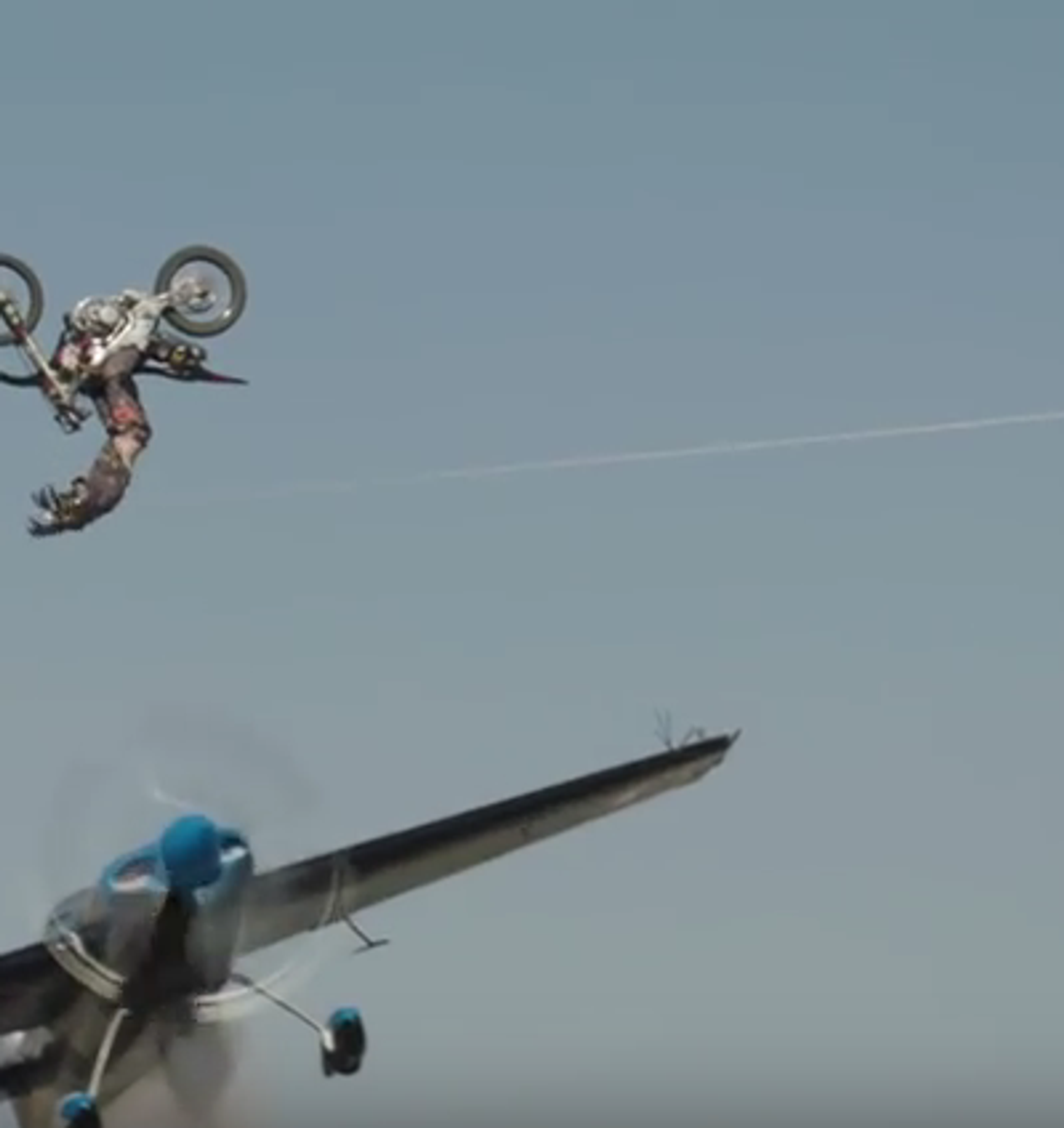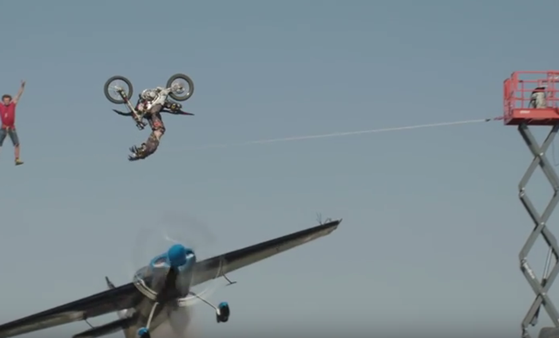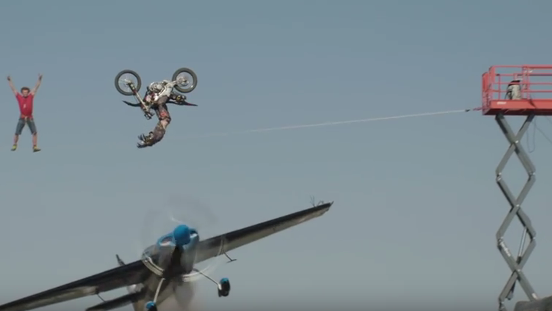 En un vídeo publicado en YouTube se puede ver a la piloto, a los mandos de una avioneta, pasando por debajo de una cuerda por la cual camina el funambulista, mientras el motorista realiza un salto mortal con su moto que pasa justo por encima del avión.