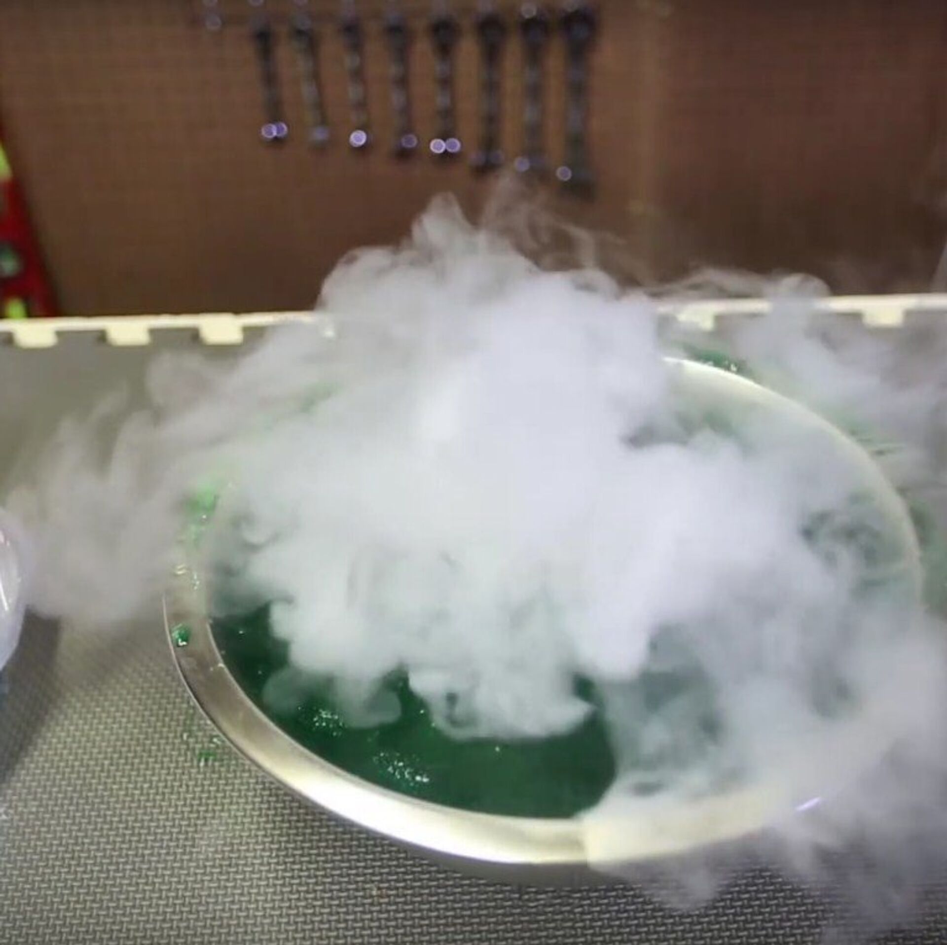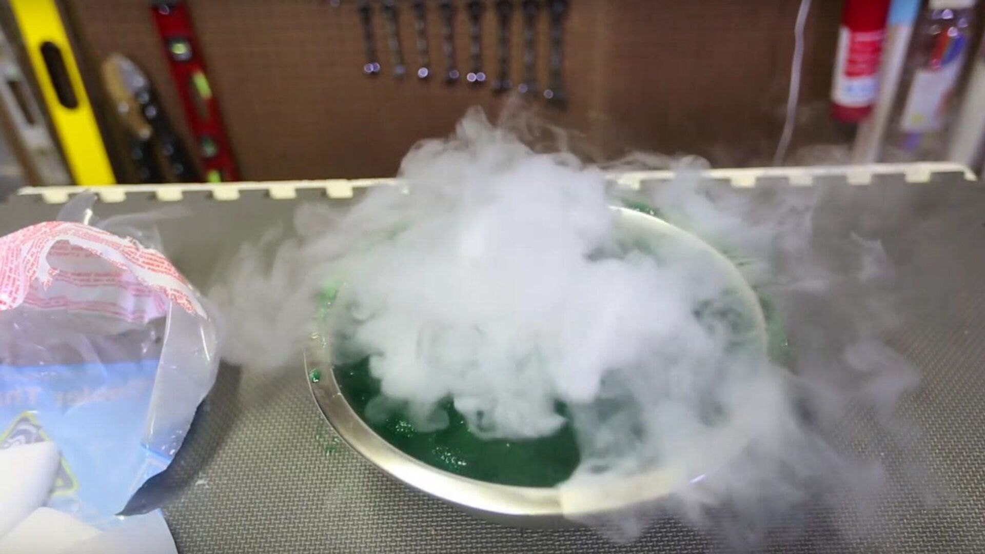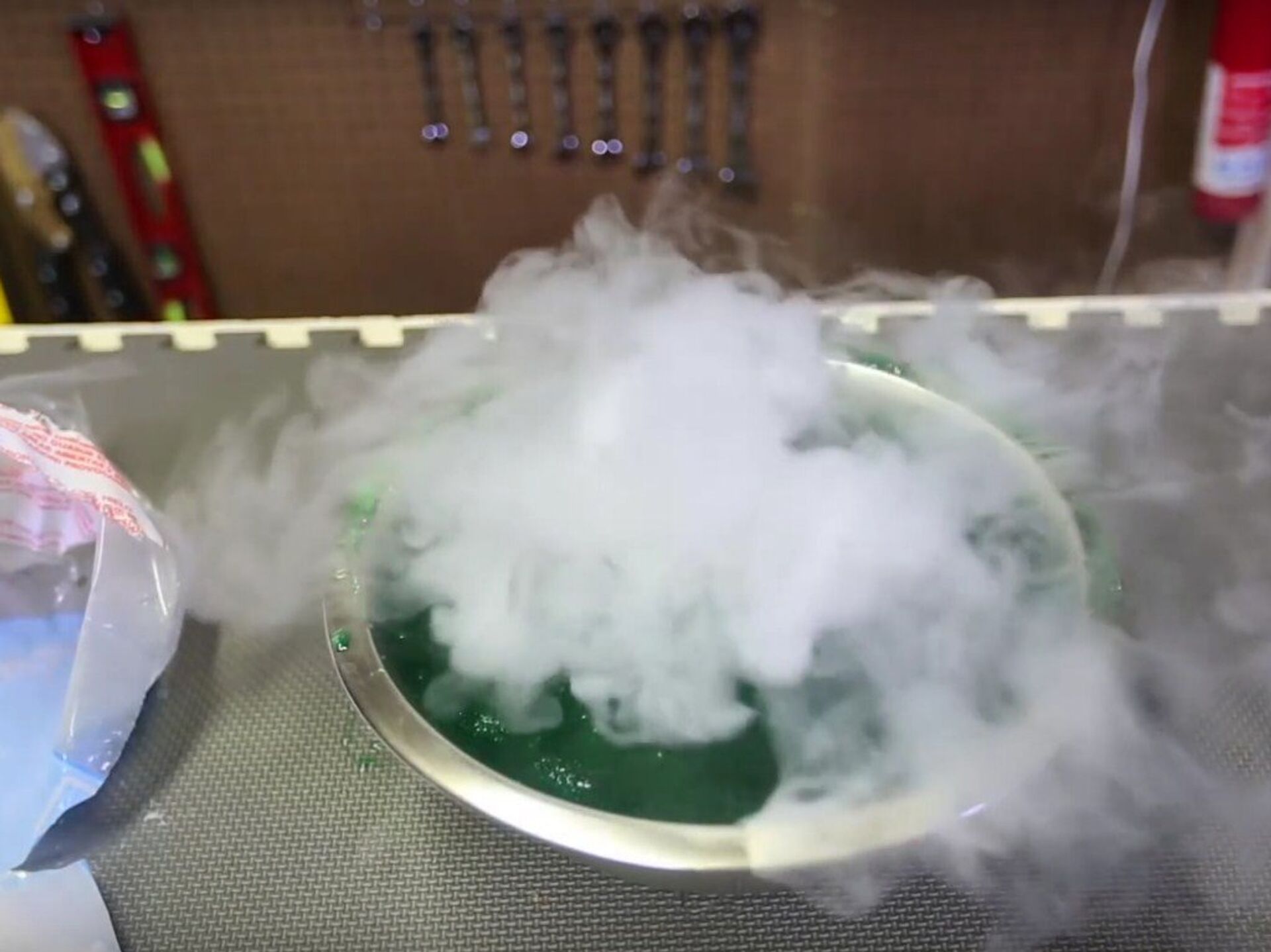 La reacción del hielo seco es interesante, puesto que produce burbujas de humo blanco que recuerdan a las que se forman en los volcanes o en las aguas termales. Un experimento, como poco, curioso.
