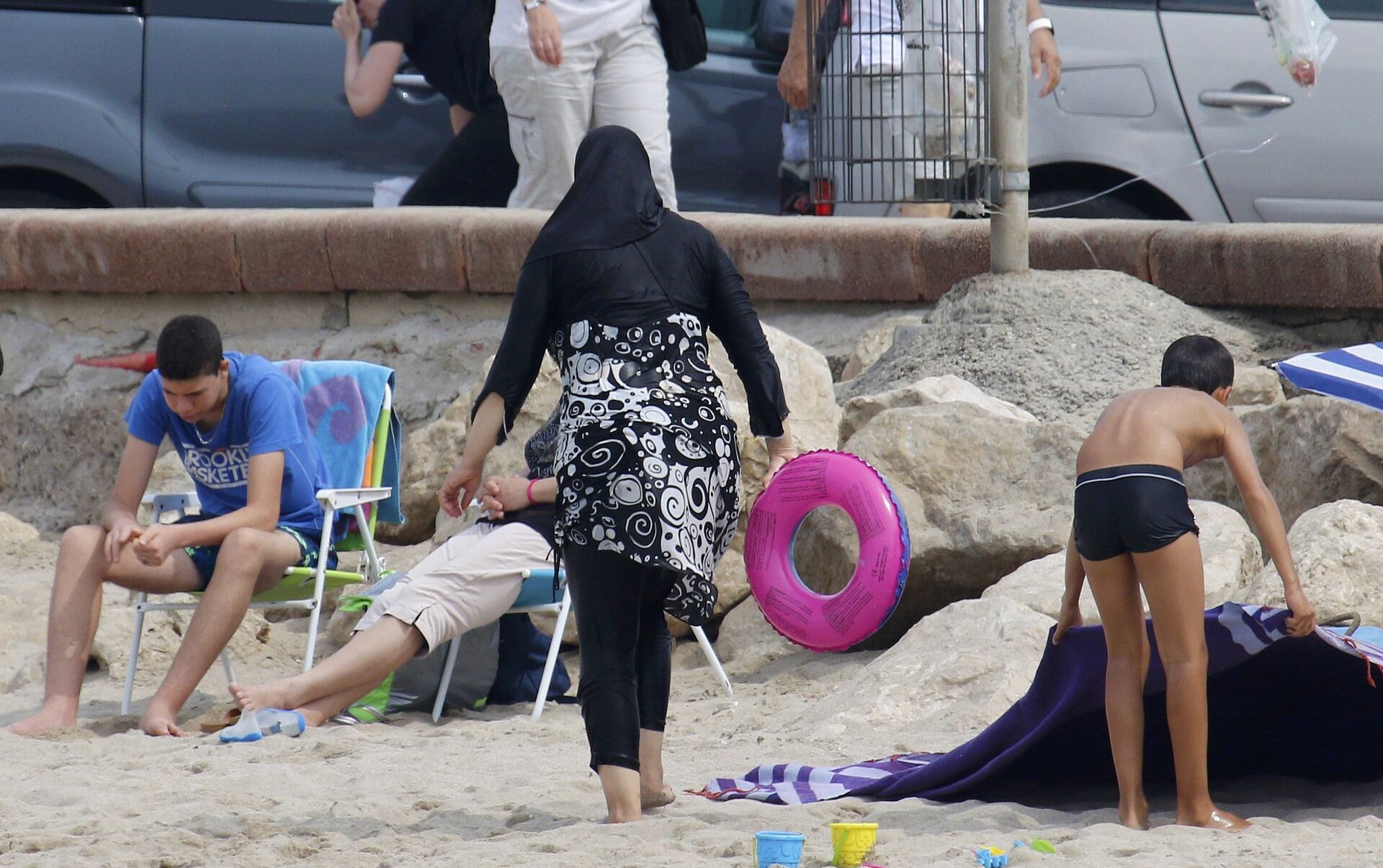 Las imagines publicadas por el medio muestran a al menos cuatro agentes de seguridad que rodean a una mujer que descansa en la arena al lado de la Promenade des Anglais, escenario del reciente atentado terrorista con un camión.