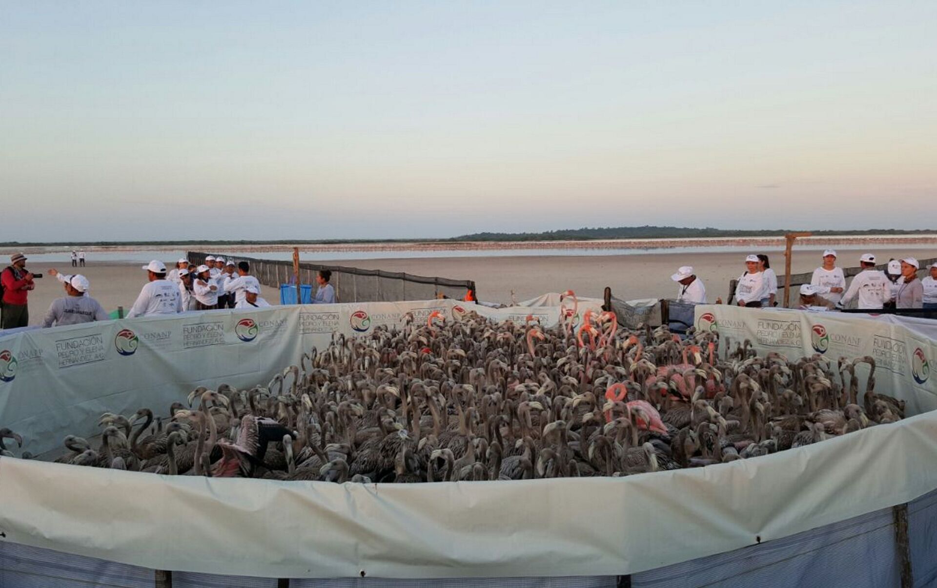 Cuando el alba comienza a sustituir los tonos cárdenos del cielo por aquellos rojizos del amanecer, el equipo de Alex Dzib y los voluntarios se tornan alrededor del corral, el cual tiene a su alrededor un pasillo donde se van introduciendo grupos de flamencos y una persona experta los conduce a una de las ocho estaciones de anillado.