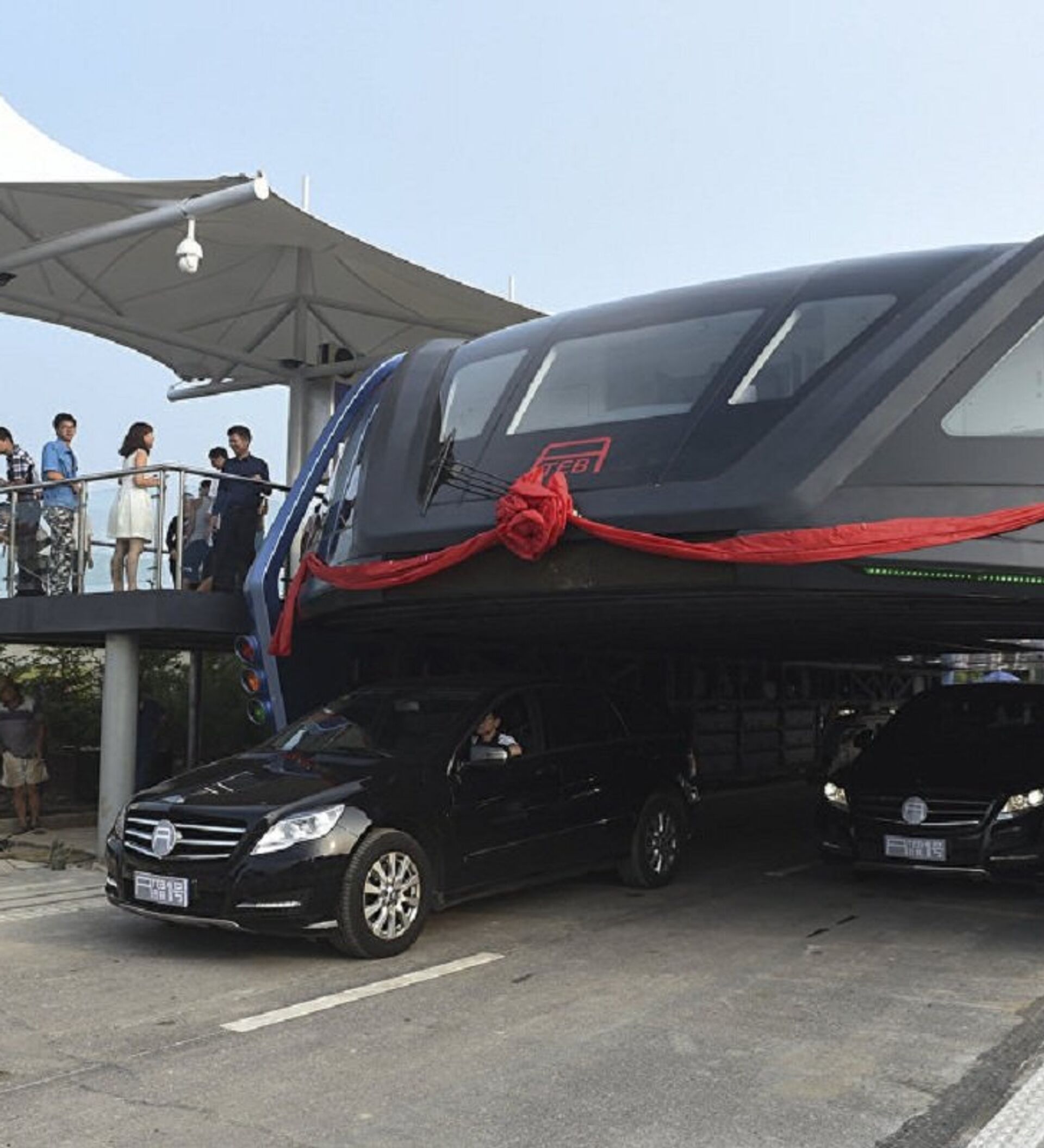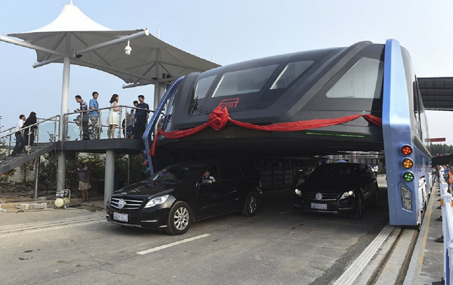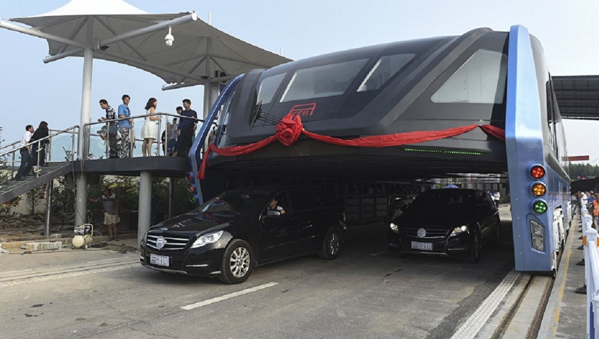 'El autobús del futuro' —TEB (Transit Elevated Bus, en inglés)— captó la atención de inversores de todo el mundo tras su presentación en el marco de la exposición China Beijing International High-Tech Expo. Estaba previsto que este tipo del transporte público ayudara a evitar los problemas del tráfico en las ciudades densamente pobladas gracias a su elevada estructura.