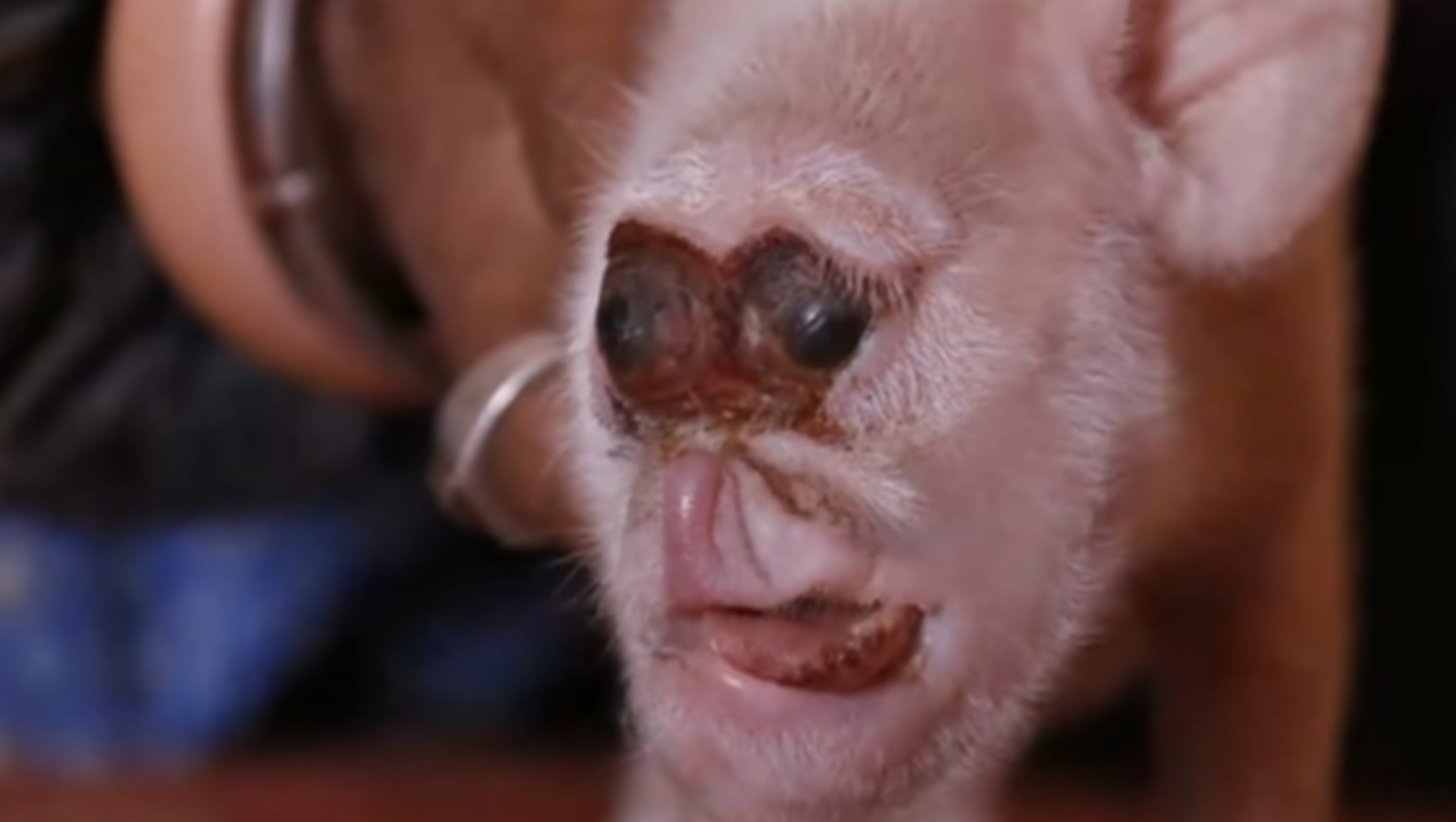 La mandíbula y el hocico deformados del cochinito son similares a los que tienen los simios.