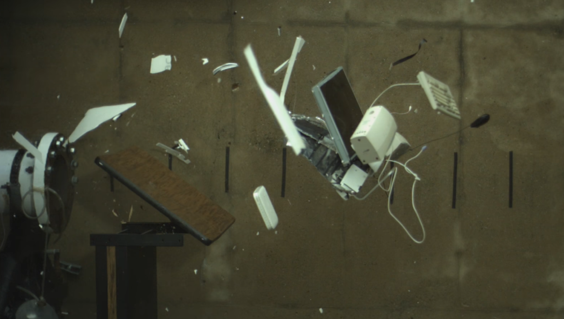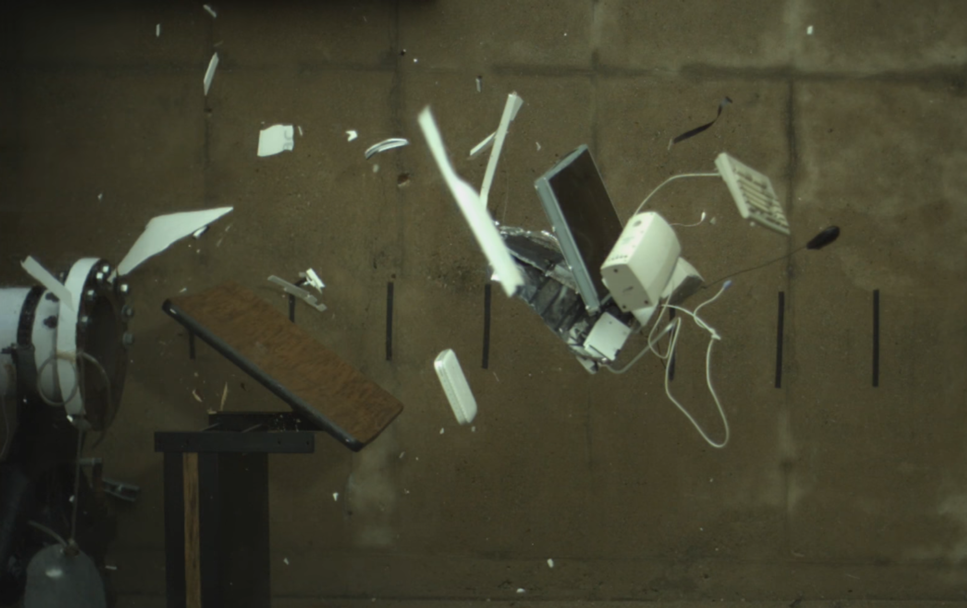 En las increíbles imágenes se ve cómo la computadora, puesta delante del dispositivo que lanza fuego a una velocidad de 1800 metros por segundo —unos 6.500 kilómetros por hora—, se hace pedazos en cuestión de milisegundos.