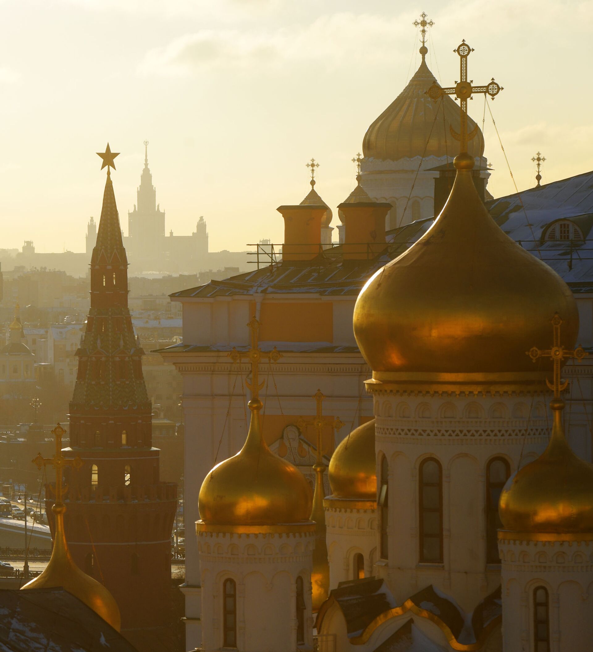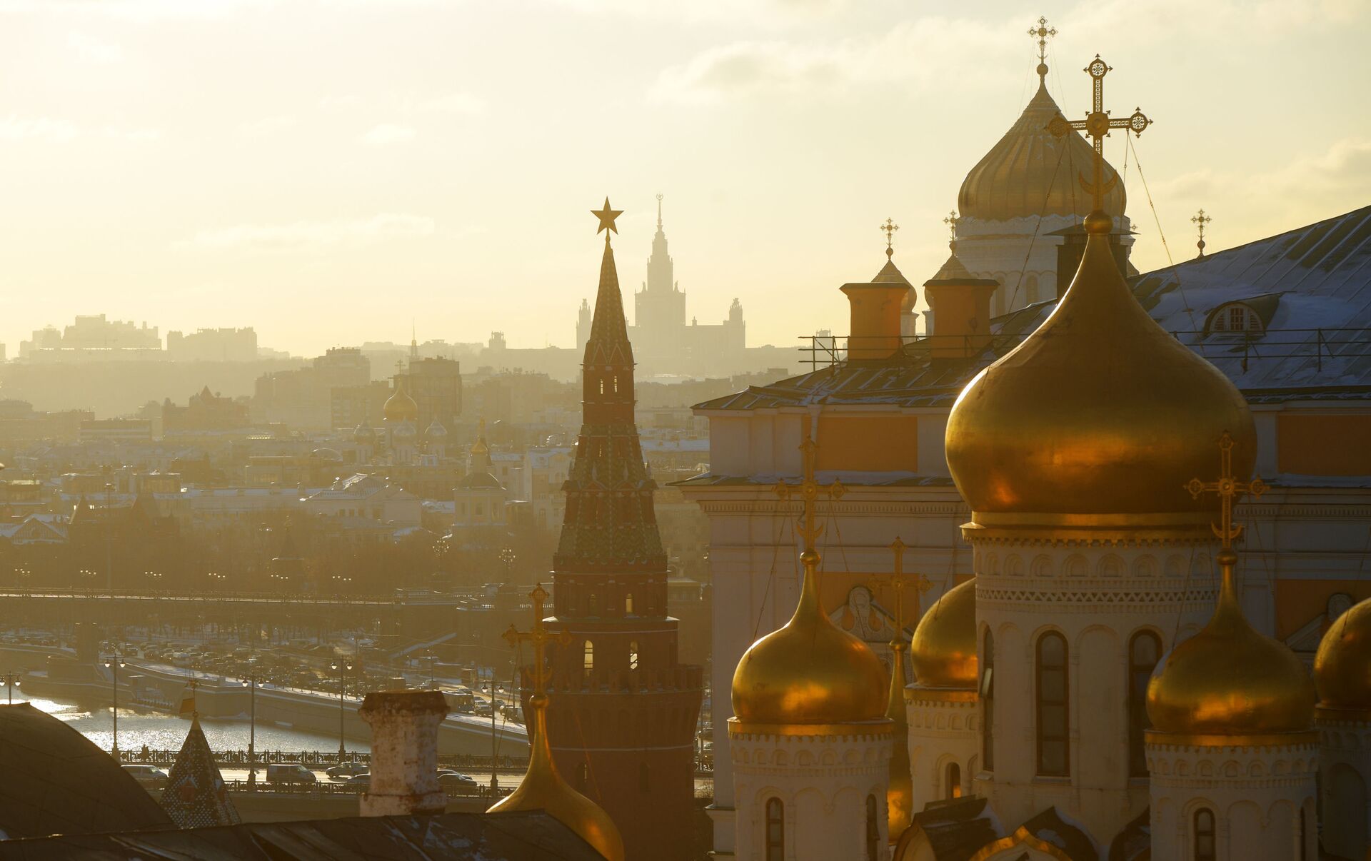 Вид Москвы с колокольни Ивана Великого. На первом плане справа налево: Благовещенский собор и Водовзводная башня Московского Кремля. На втором плане - купол храма Христа Спасителя. На дальнем плане - здание Московского государственного университета имени М.В. Ломоносова.