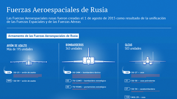 16:54 GMT 22.02.2017 (actualizado: 23:47 GMT 10.02.2021) Las Fuerzas Aeroespaciales de la Federación de Rusia fueron creadas el 1 de agosto de 2015 como resultado de la unificación de las Fuerzas Espaciales del país —alumbradas el 24 de marzo de 2001 por un decreto del presidente del país, Vladimir Putin, y destinadas a garantizar la seguridad del país en el cosmos— con las Fuerzas Aéreas de Rusia.