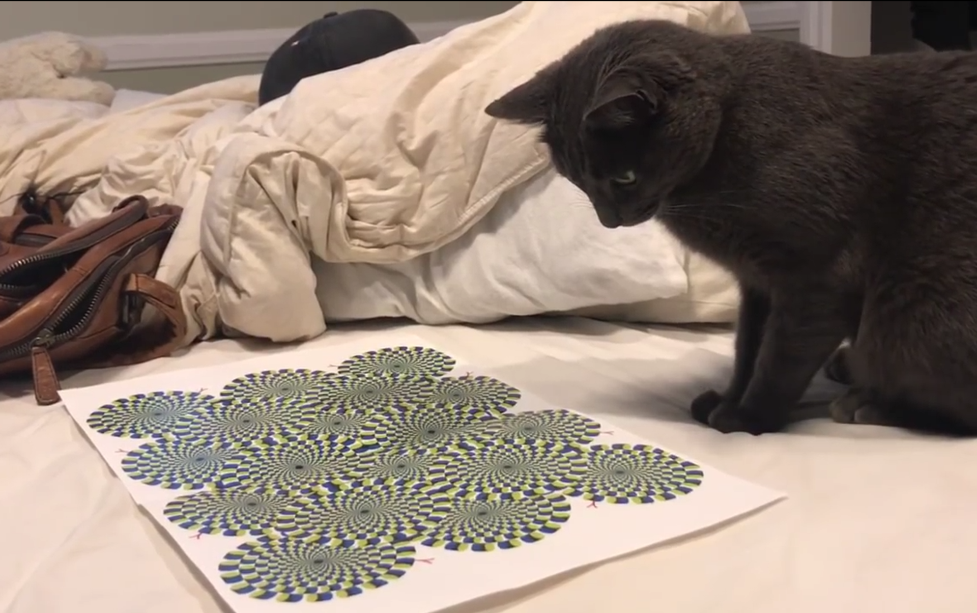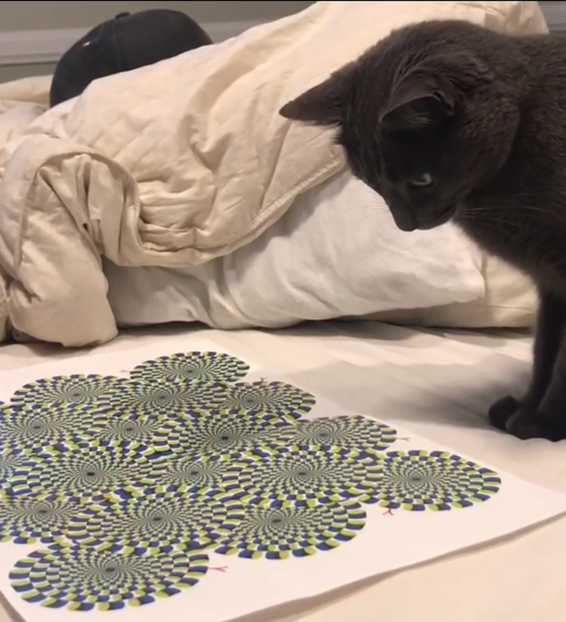 Parece que el gato logró ver los círculos giratorios, de la misma que percibe la imagen el ojo humano, y decidió atacarlos. Frustrado por los intentos de atraparlos, decidió morder un trozo de la hoja de papel.