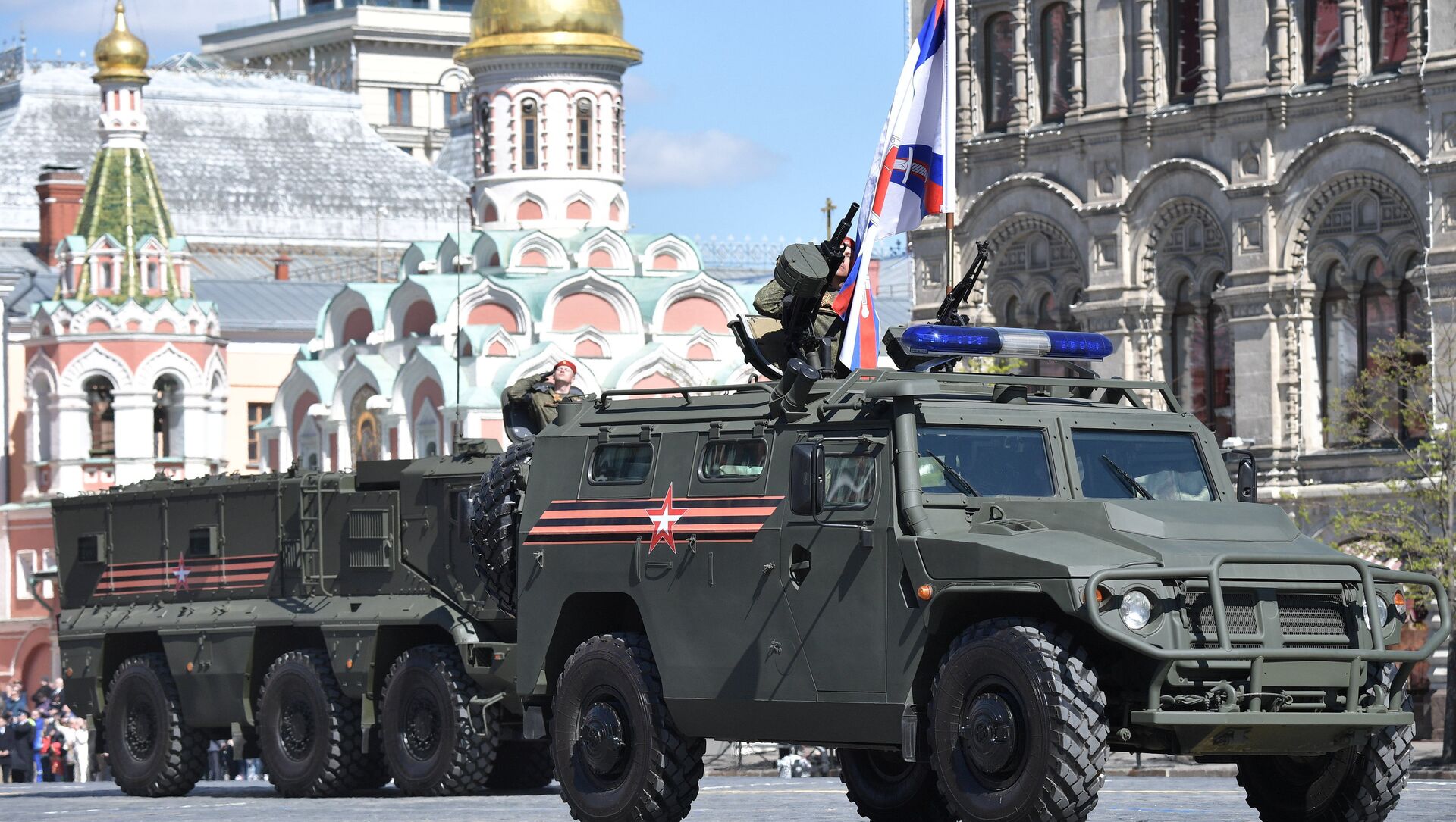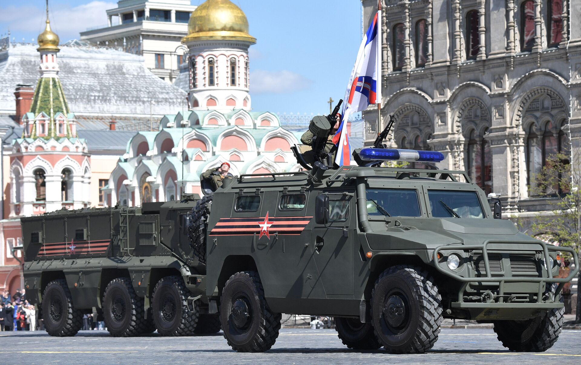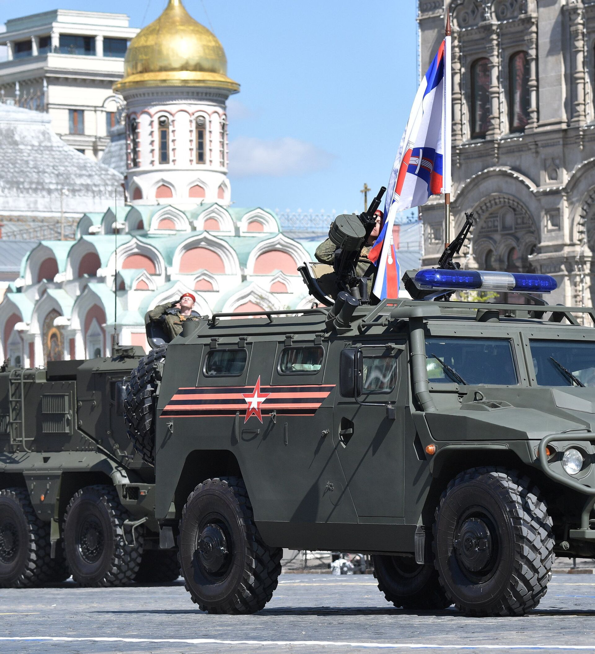 También desfilaron en la Plaza Roja los vehículos de combate de infantería Kurganets-25 y BMP-3, los tanques T-72B3 y T-14 Armata, los obuses autopropulsados Koalitsiya-SV y Msta-S, los sistemas antiaéreos Iskander-M, Tor-M2U y Buk-M2, los transportes blindados BTR-82A, BTR-MDM y Bumerang, los vehículos de combate BMD-4M, los sistemas de defensa antiaérea Pantsir-S y S-400 Triumf.
