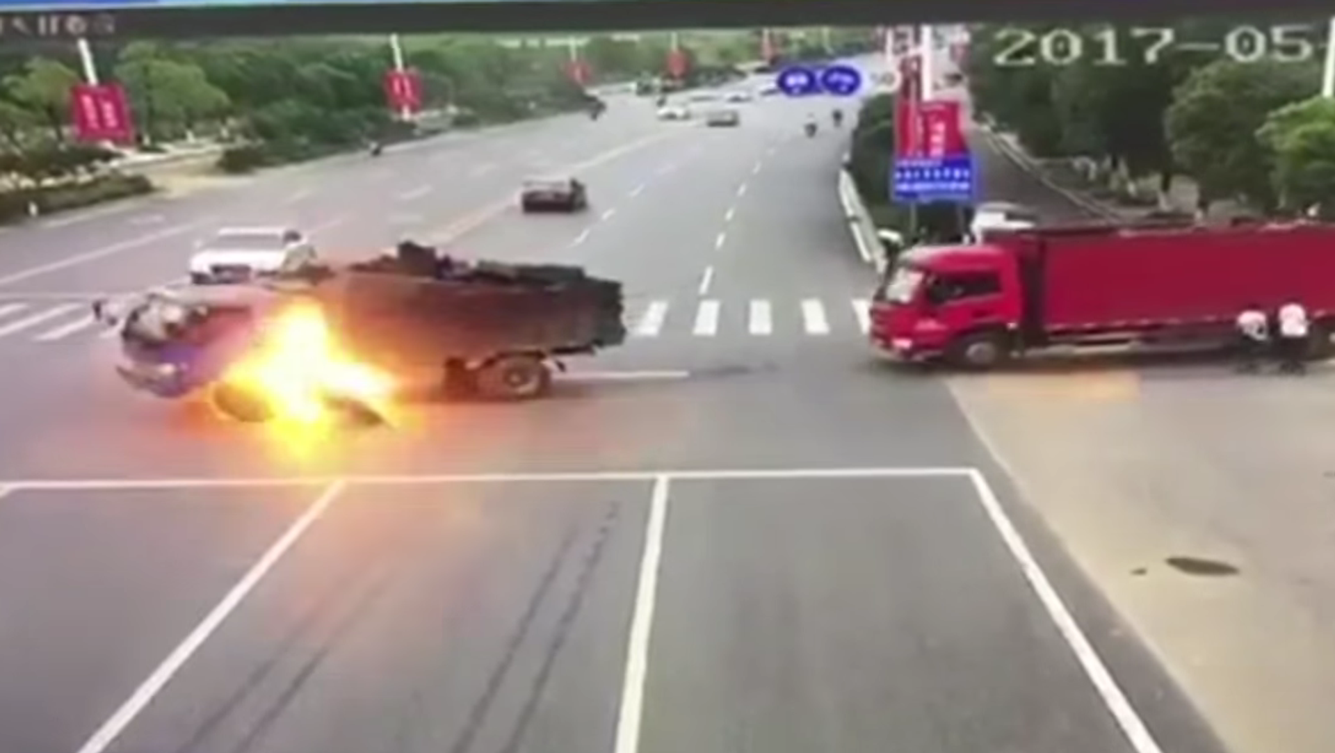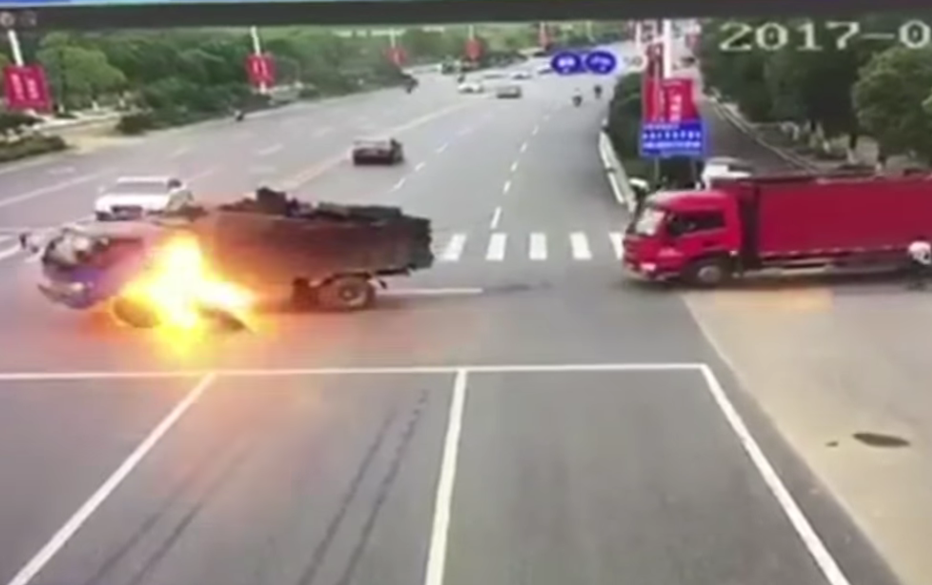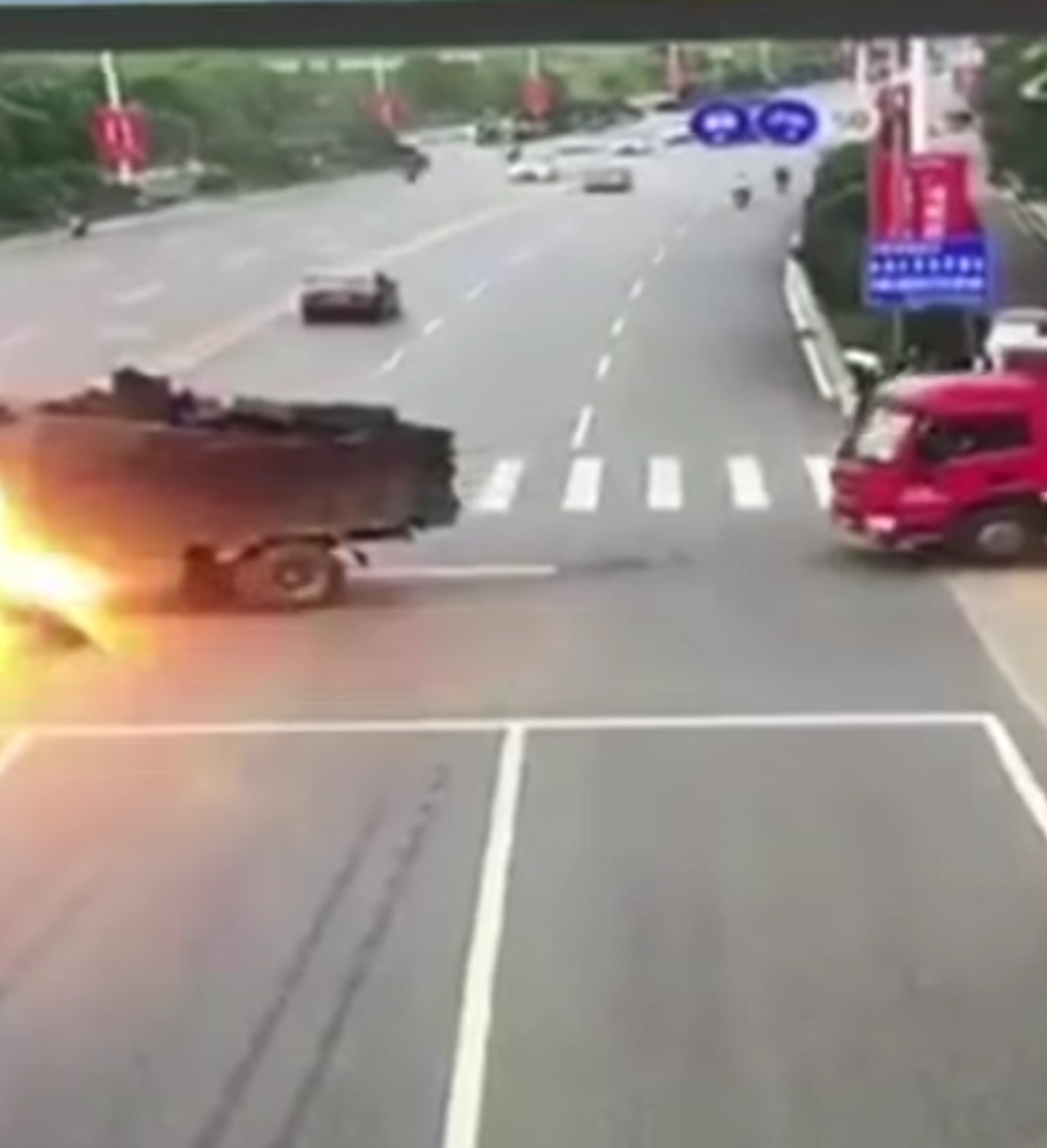 En la grabación se aprecia cómo un camión está girando en un cruce de Nanchang cuando un motociclista impacta contra su tanque de combustible.