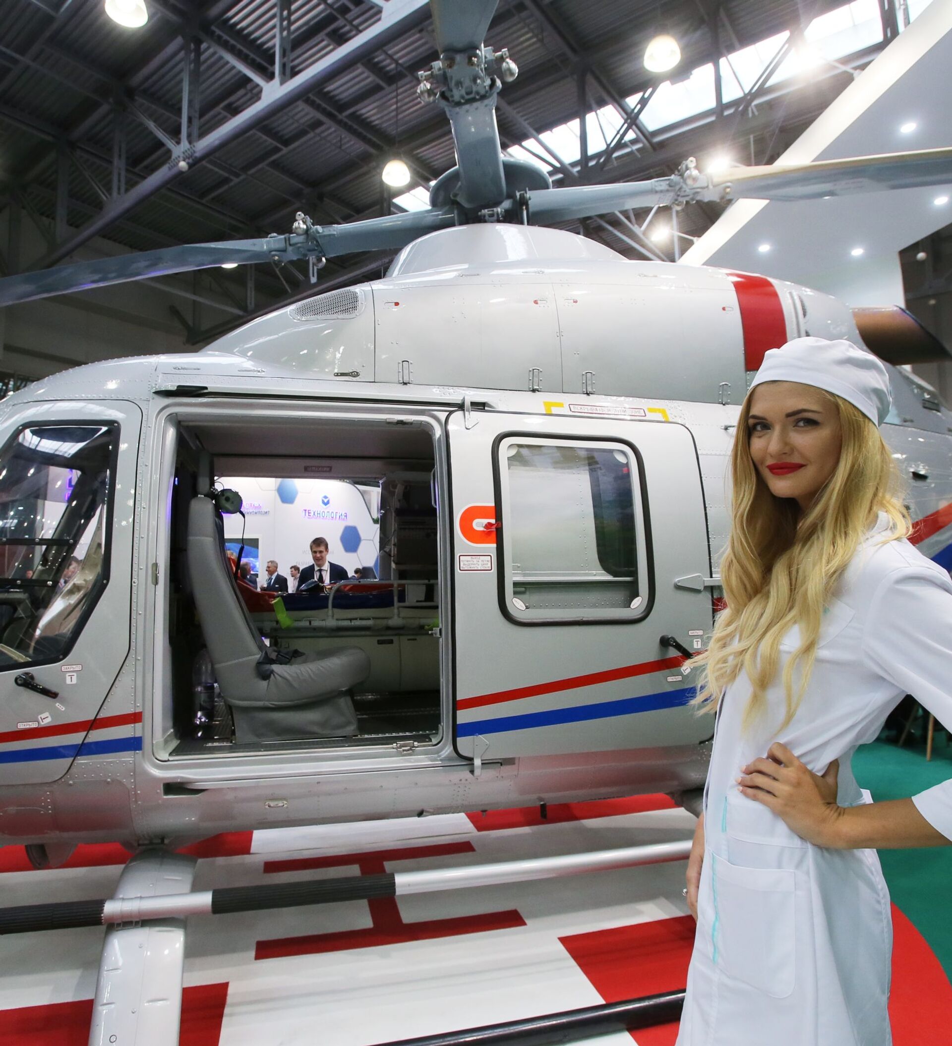 Una chica en la cabina del helicóptero ligero multiuso Ansat de configuración VIP.