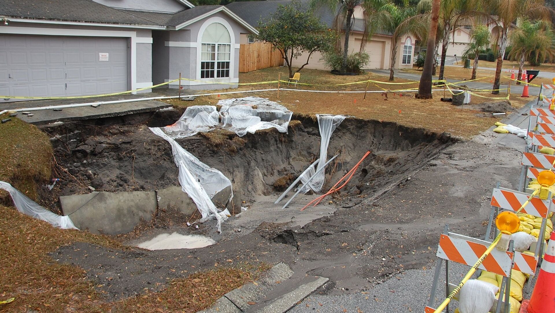 "El agujero tiene un tamaño de 76,2 metros por 68,5 y una profundidad de 15,2 metros, está lleno de agua y no puede drenarse debido a los escombros", indicó Guthrie. La posibilidad de que contenga productos químicos y fluidos provenientes de tanques sépticos hace que sea todavía más peligroso.