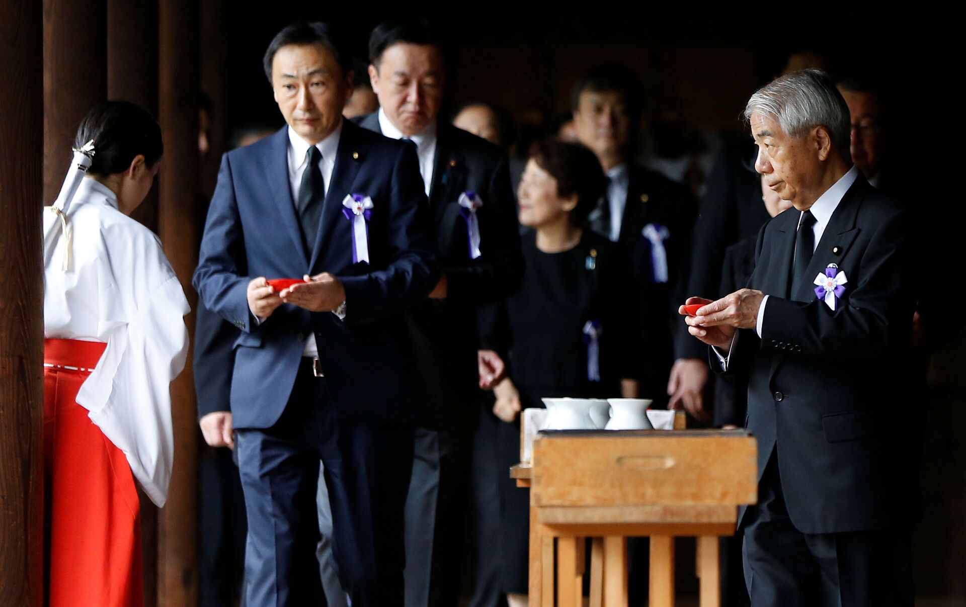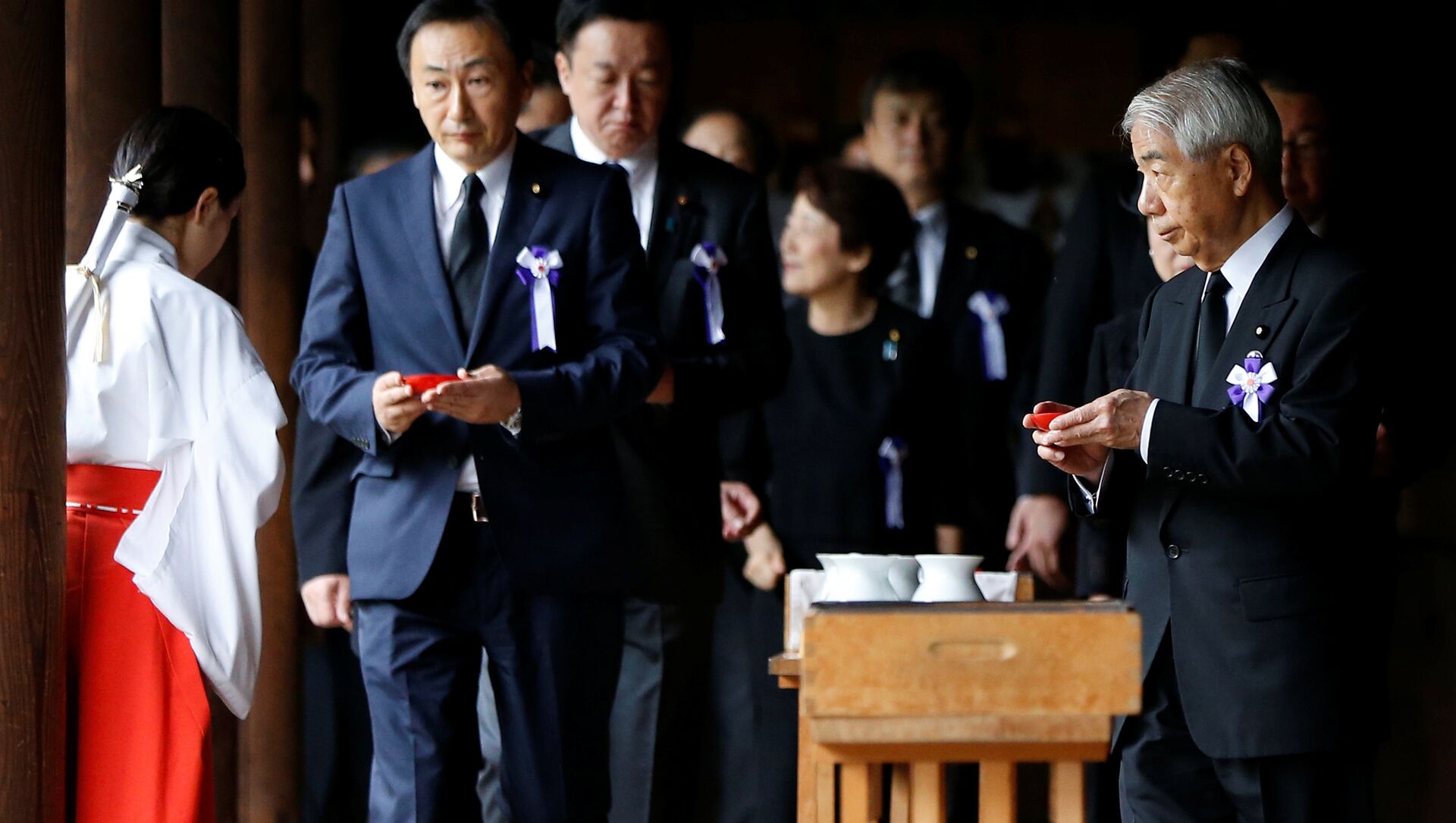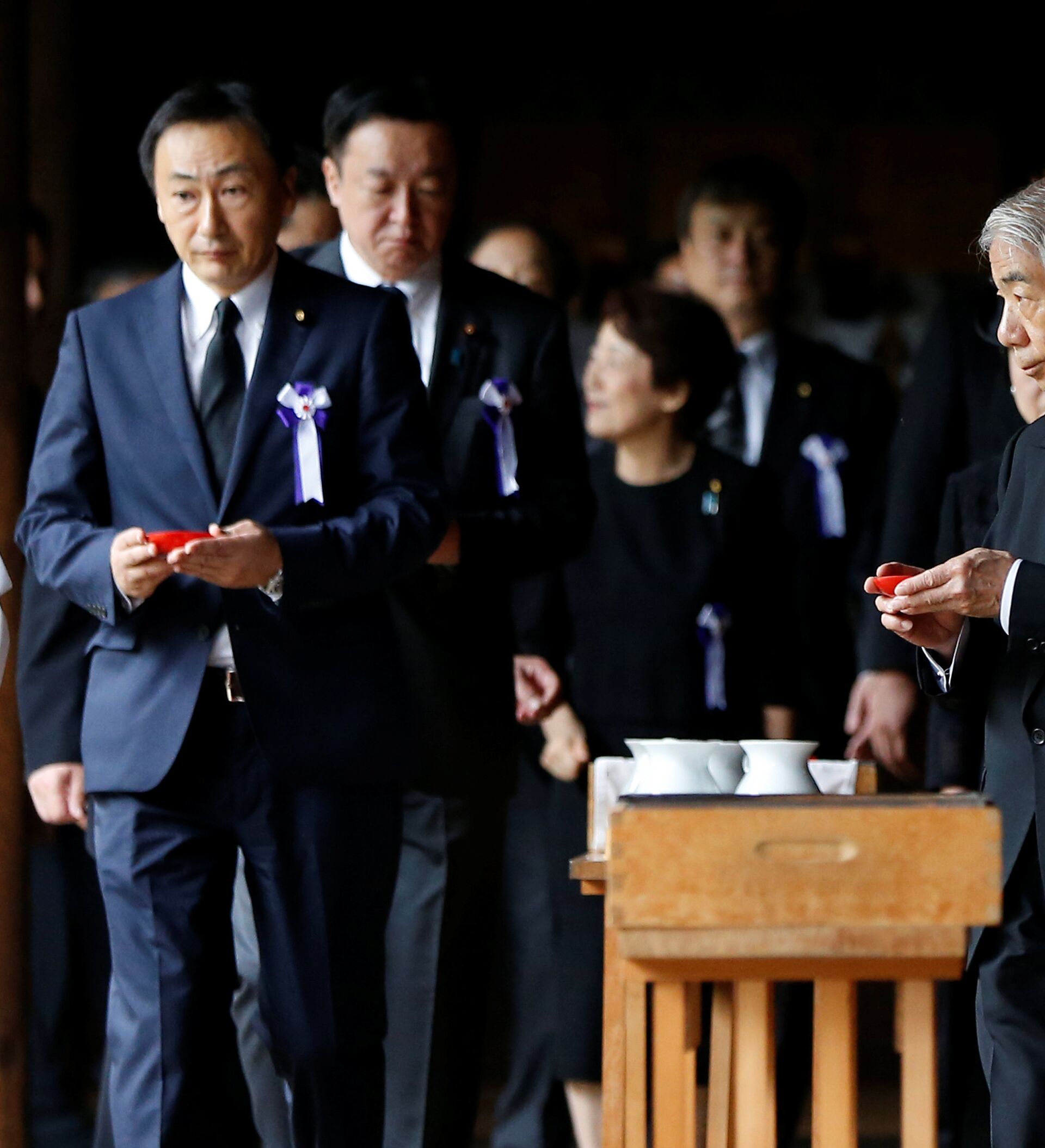 Abe, después de elegido primer ministro en diciembre de 2012, visitó en persona este santuario solo en una ocasión, en diciembre de 2013, lo cual provocó la tradicional reacción negativa en China y Corea del Sur, que lo interpretan como renacimiento del espíritu militarista y las ambiciones imperiales de Japón, y también un enfriamiento de relaciones con EEUU, el principal aliado de Japón.