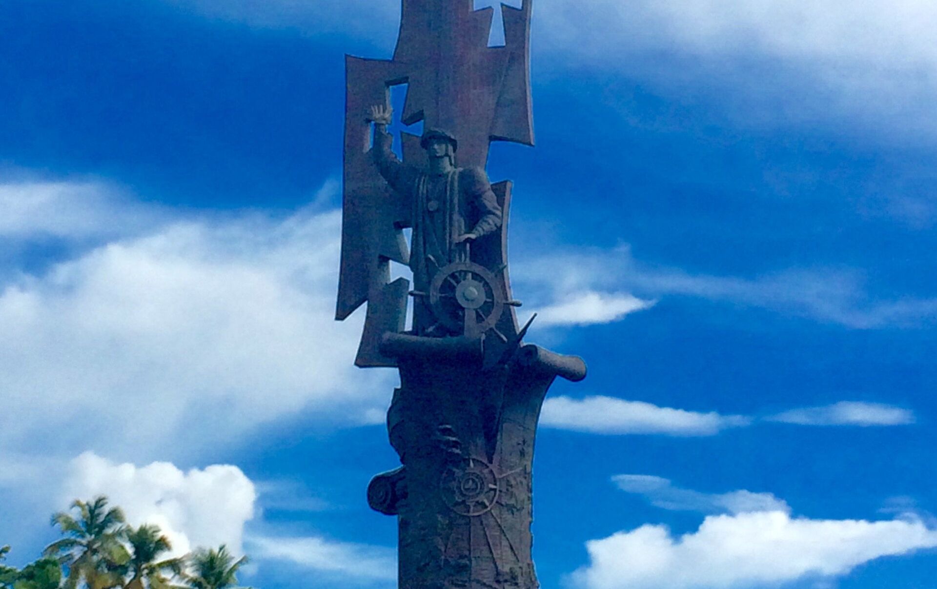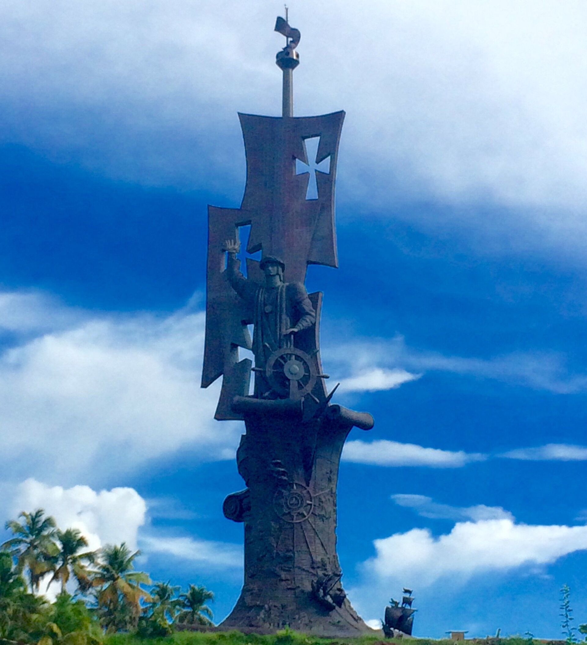 Para ensamblar la escultura, que muestra a un audaz Cristóbal Colón erguido frente de la embarcación Santa María, se utilizaron 2.500 piezas de bronce y acero y unos 186 metros cuadrados de lámina de cobre, para bañar las tres velas gigantescas que se elevan hasta 17 metros de la estructura principal.