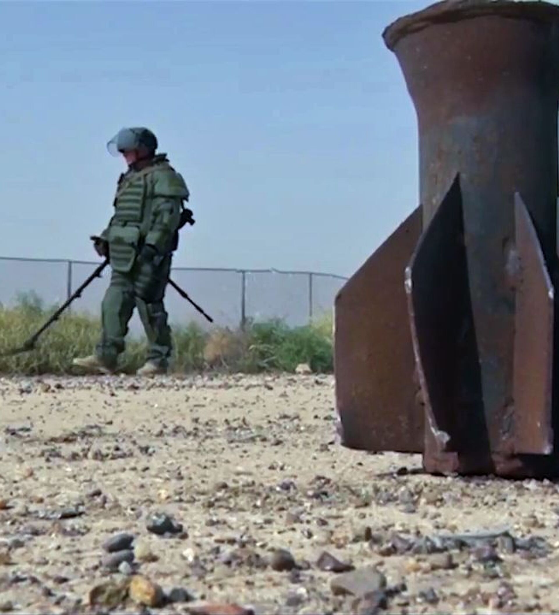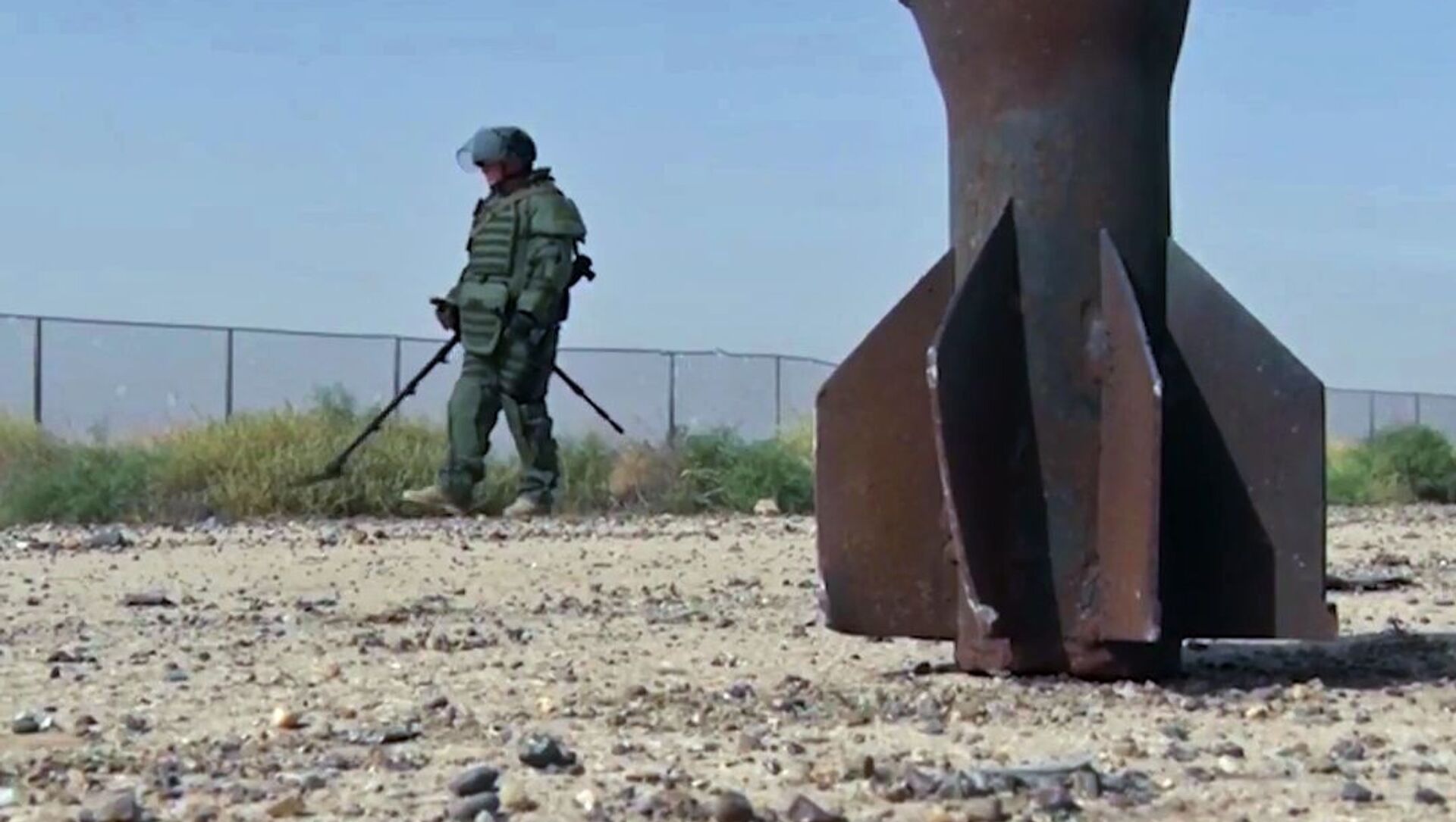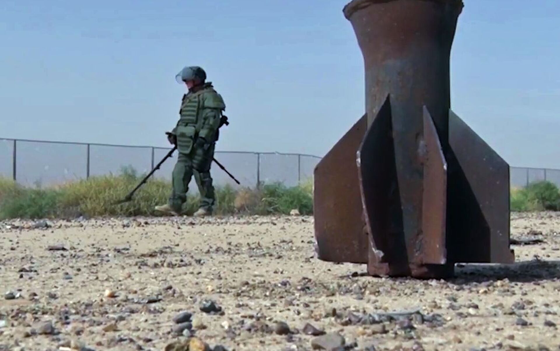 © Sputnik / Ministry of Defence of the Russian Federation / Acceder al contenido multimediaLos especialistas del Centro Antiminas utilizan los novedosos detectores de minas IMP-S2, dispositivos portátiles para la búsqueda de artefactos explosivos sin contacto INVU-3M, radares para sondeo subterráneo OKO-2, bloqueadores de minas accionadas por control remoto y otros modernos equipamientos para detección y remoción de minas. En la foto: destrucción de municiones encontradas en Deir Ezzor por especialistas del Centro Internacional Antiminas de las Fuerzas Armadas de Rusia.