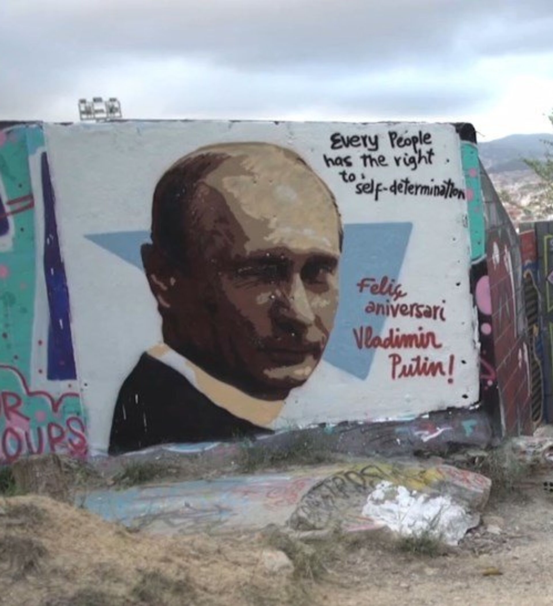 El retrato de Putin guiñando un ojo viene acompañado con un mensaje en inglés que dice: "Every people has the right to self-determination" —Todo el mundo tiene derecho a la autodeterminación— y una frase en catalán: "Feliz aniversari, Vladímir Putin".