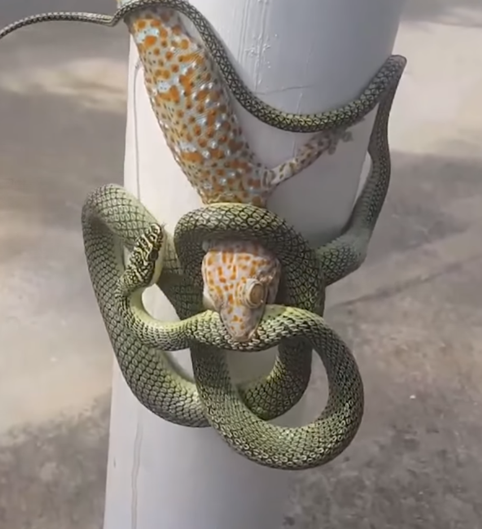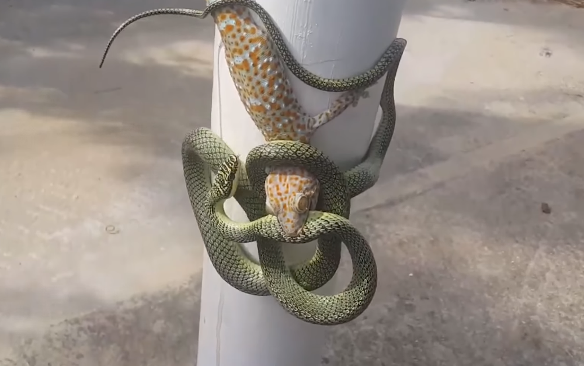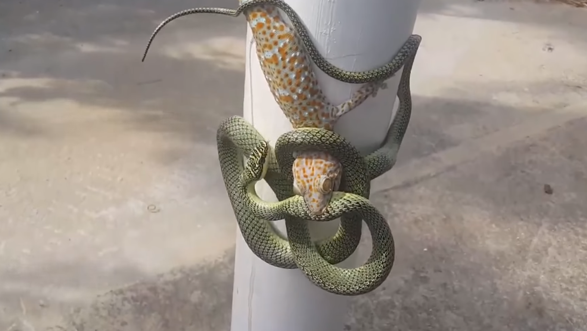En las imágenes es posible ver al pequeño lagarto mordiendo a la serpiente que, por su parte, responde con un 'abrazo' sofocante.