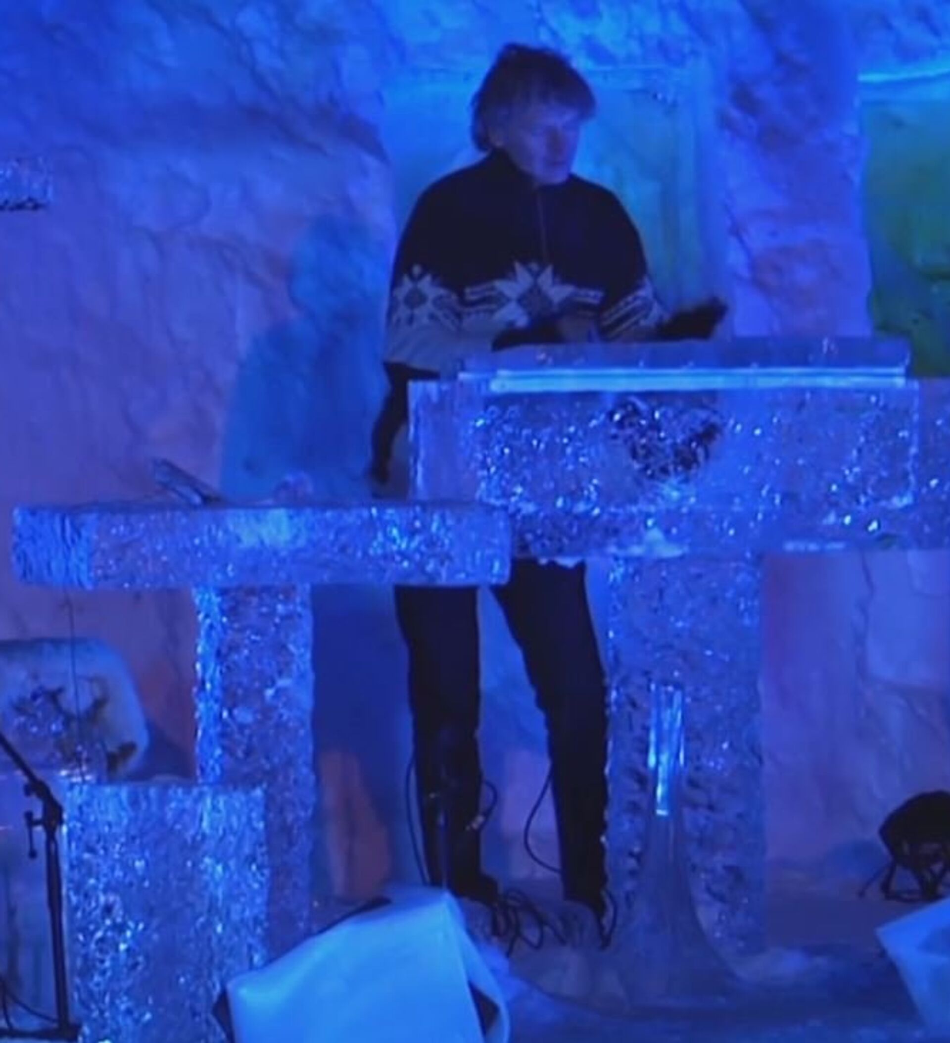 El músico noruego Terje Isungset toca varios instrumentos musicales de su propia producción. Terje hace sus inusuales instrumentos de hielo.