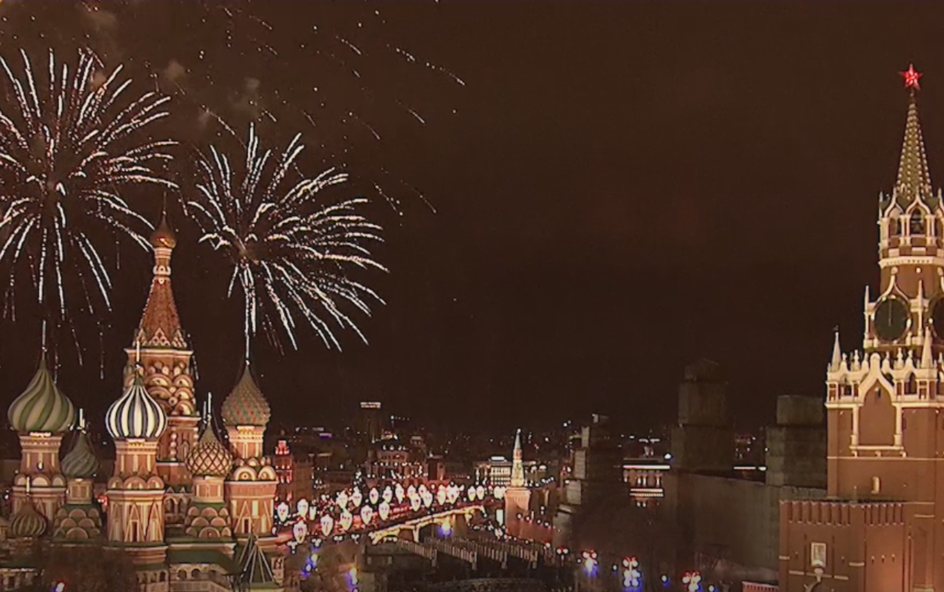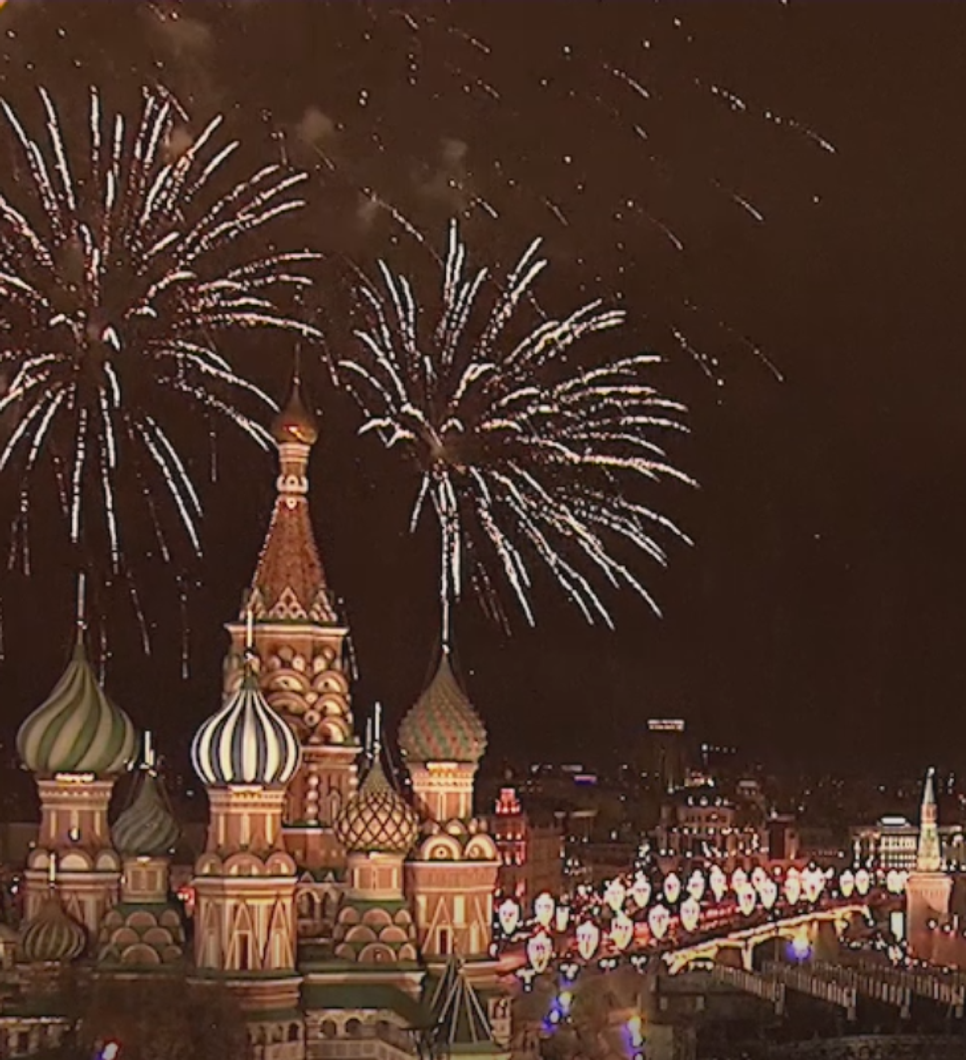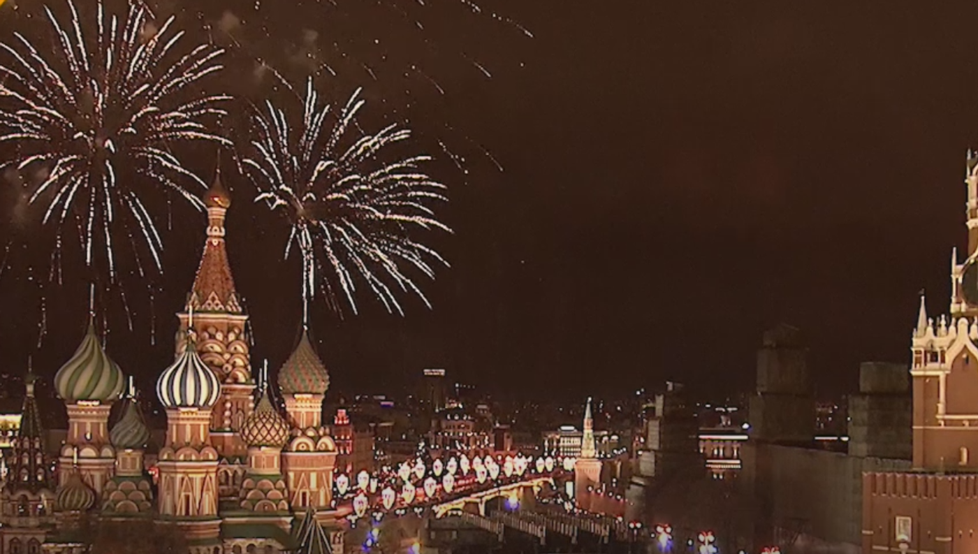 En Moscú, los fuegos artificiales que iluminaron el cielo capitalino se lanzaron desde 36 puntos a lo largo de la ciudad. Durante el espectáculo, que duró exactamente cinco minutos, se lanzaron más de 100.000 fuegos artificiales, informó la alcaldía de Moscú.